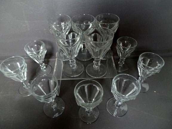Wow if you collect Heisey, you won’t want to miss this set of 12 mint set of heavy Heisey glasses. These six panel glasses are only 3.5 inches tall and marked with “H” on the bottom with a glass base of 1.75”. I can imagine a little girl setting a table for her dolls with one beside each plate. Perhaps you have room in your china cupboard to put these or you can just use a shot glass. All twelve are mint with no chips or cracks and all clean. $95 for all! 2066-EY