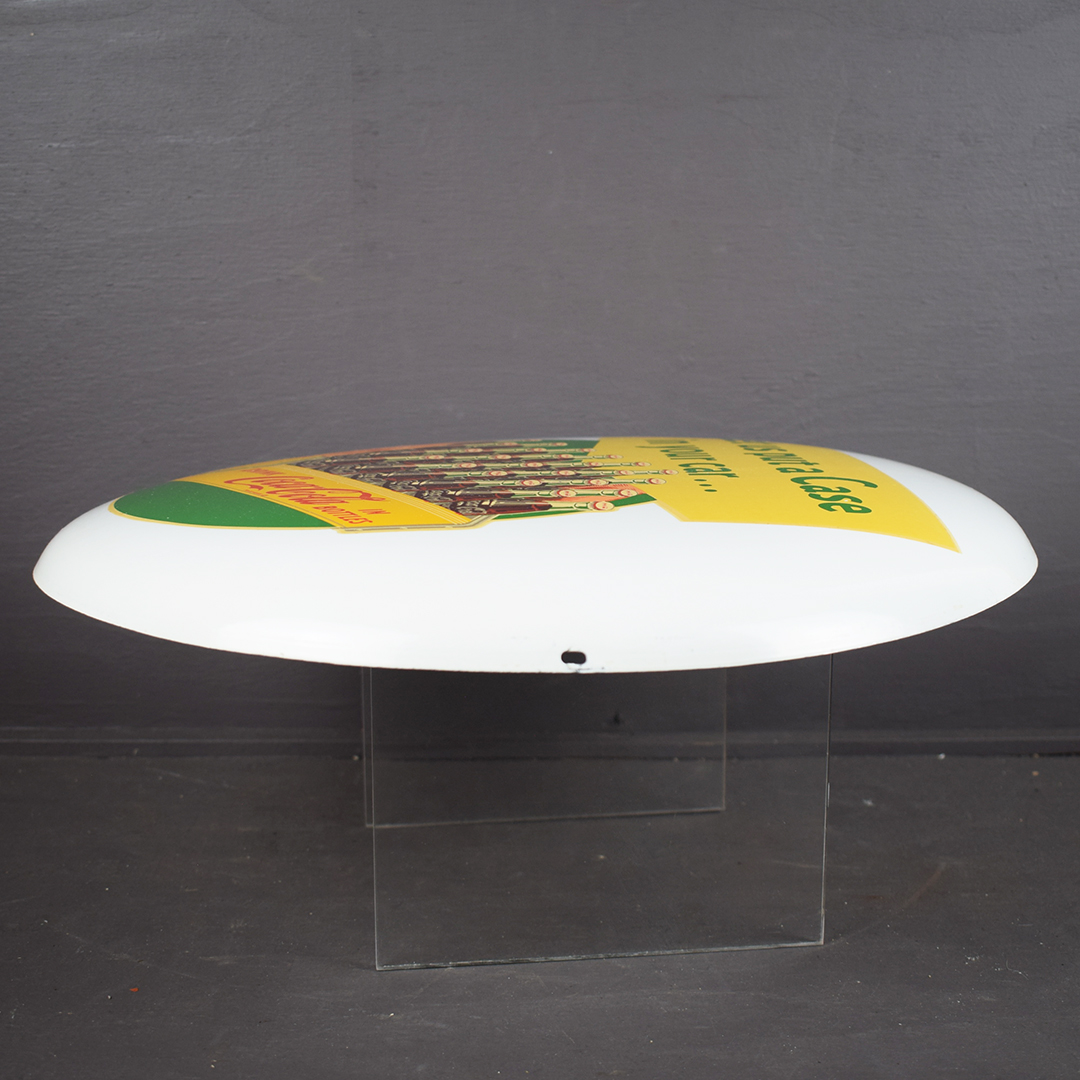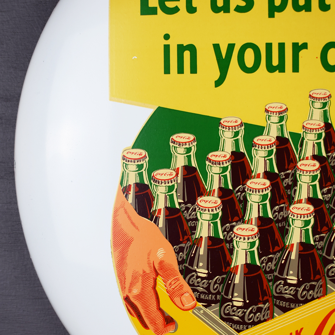 Coca-Cola button signs were the perfect size for advertising in many small towns. Red buttons either featured the Coca-Cola iconic script or the hobble-skirt bottle. White buttons either had the hobble-skirt bottle printed on them or were blank. By using white blank button signs, Coca-Cola could use decals on them for the smaller retailers. This 16-inch white button sign features a decal from the 1950s, with Coca-Cola’s “Let us put a Case in your car…” above a case of Coke in the iconic wooden crate. The decal features bright, sharp colors and looks perfect on this white button sign. The decal is free of cracks and looks beautiful. The metal button feels lighter than others we have had, and it has some minor wear around the outer edge. This sharp button sign will be an excellent addition to your collection. 21378-QYIP