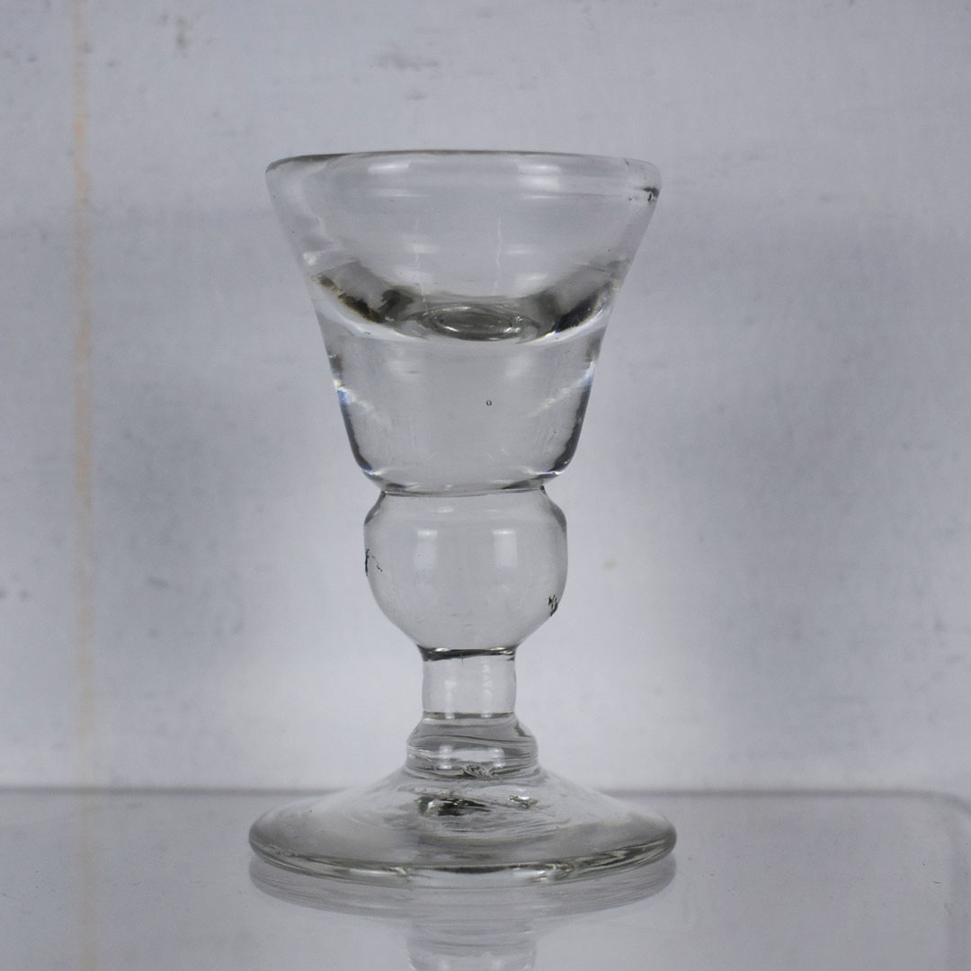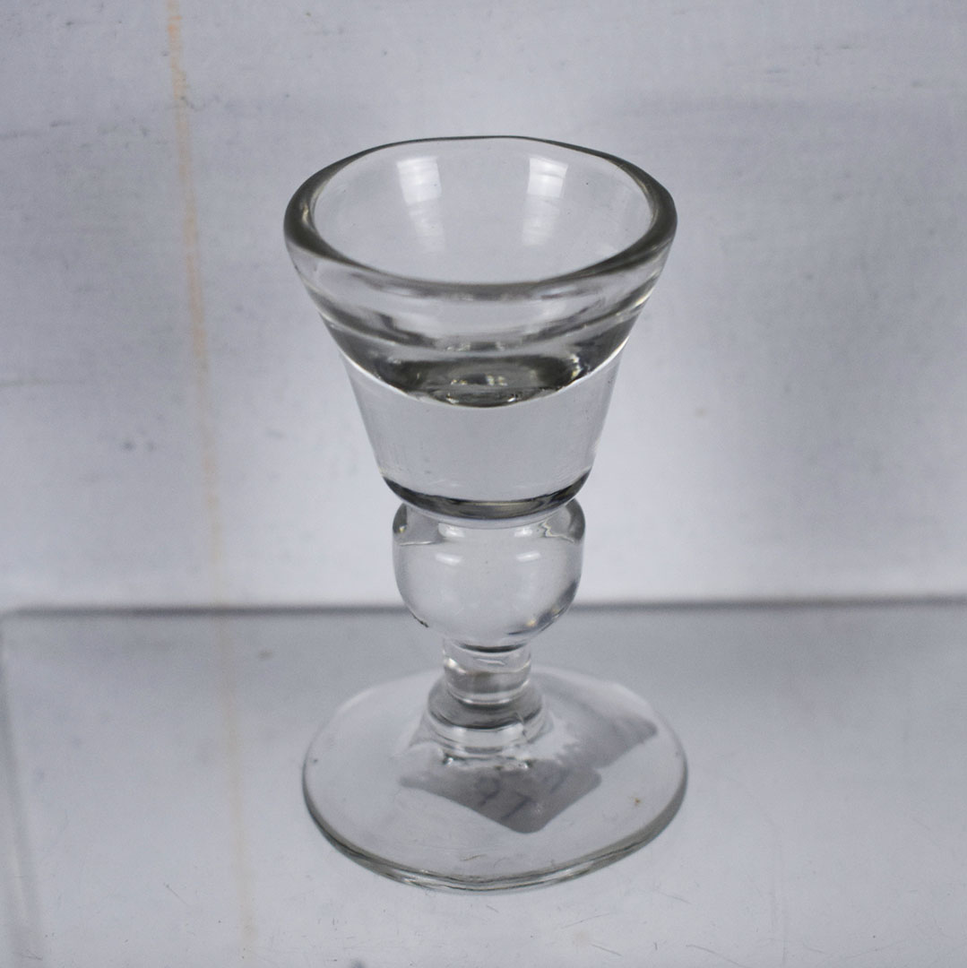 Initially used in London, England, this small glass served ice cream to customers. They would purchase a dip of ice cream for a penny, eat the dip of ice cream, and lick the glass. As you can imagine, this was not very sanitary and was banned in 1898. When looking at the glass, you think you are getting a lot for a penny. Still, the thickness of the glass made the ice cream appear more significant than it was. This glass stands 2 3/4 inches tall, has a 1 3/4 inch base, and is free of chips and cracks. It has a mold mark on the lower part, just above the stem. Like other penny-lick glasses, this one does not have any markings on it. 21238-TP