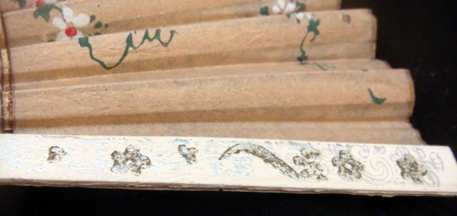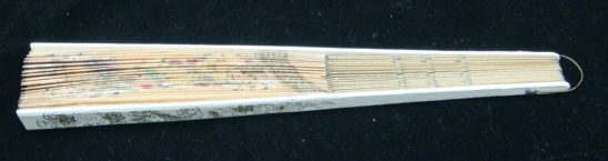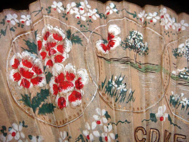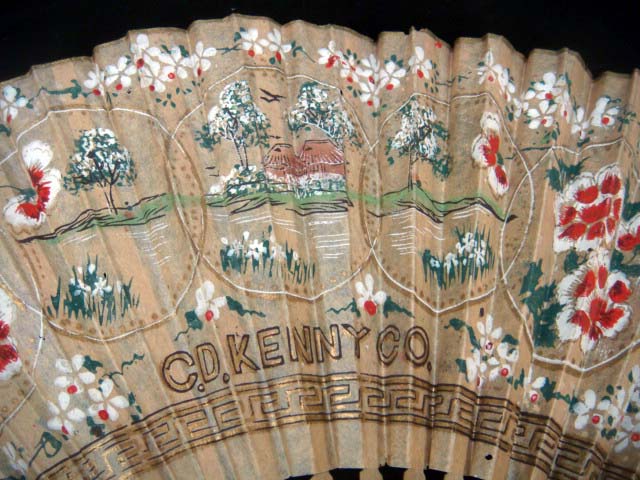 Circa 1910’s-1920’s folding fan made of paper with wooden slats. When open a hand colored oriental scene with flowers and a peaceful house are exposed. Below this scene is inscribed “C.D. Kenny Co.” A Greek key design makes up the bottom border of the fan. The fan is in excellent condition with no tears or stains, only a couple of tiny pin holes. Came out of my collection. 6100-WT