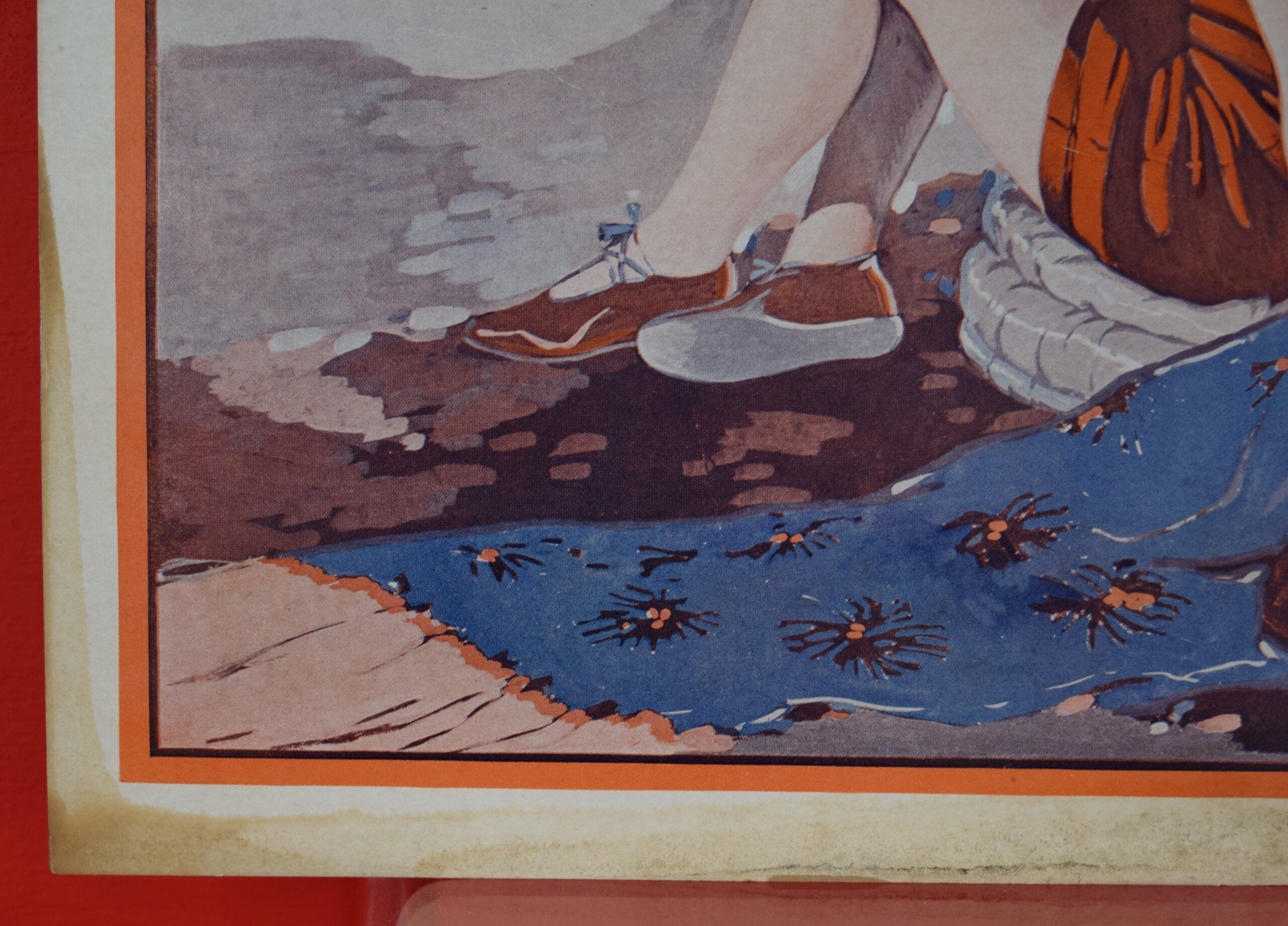 It’s always nice to think of the beach, and this ad definitely makes us do just that! This fantastic cardboard ad for Chero-Cola dates from the 1920’s and was originally hung in a snack bar at the shore or lake. It features a bathing beauty complete in her swimsuit, cap, and water shoes sitting under an umbrella cooling off with a bottle of Chero-Cola. The string that was used to hang this vintage piece is long gone, so we decided to frame it to preserve it’s history for years to come. Some minor water staining has occurred around the outer edge, with it creeping into the lower part of the picture at the bottom. It is marked “American Colortype Chicago – New York” with a beacon of light between Colortype and Chicago and measures 17.75 inches tall and 12 inches wide. The colors on this rare cardboard piece show how much work went into printing over a century ago. 18757-WPP