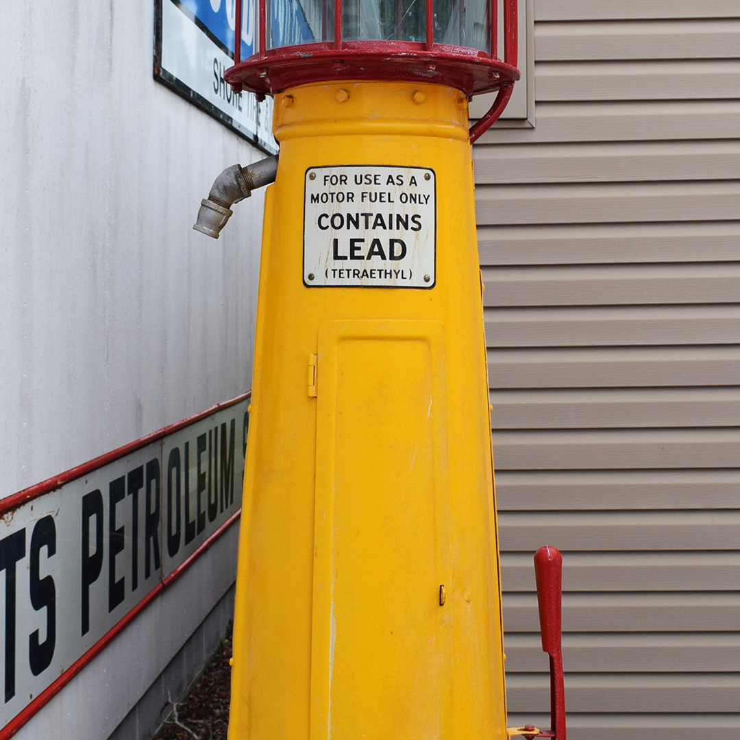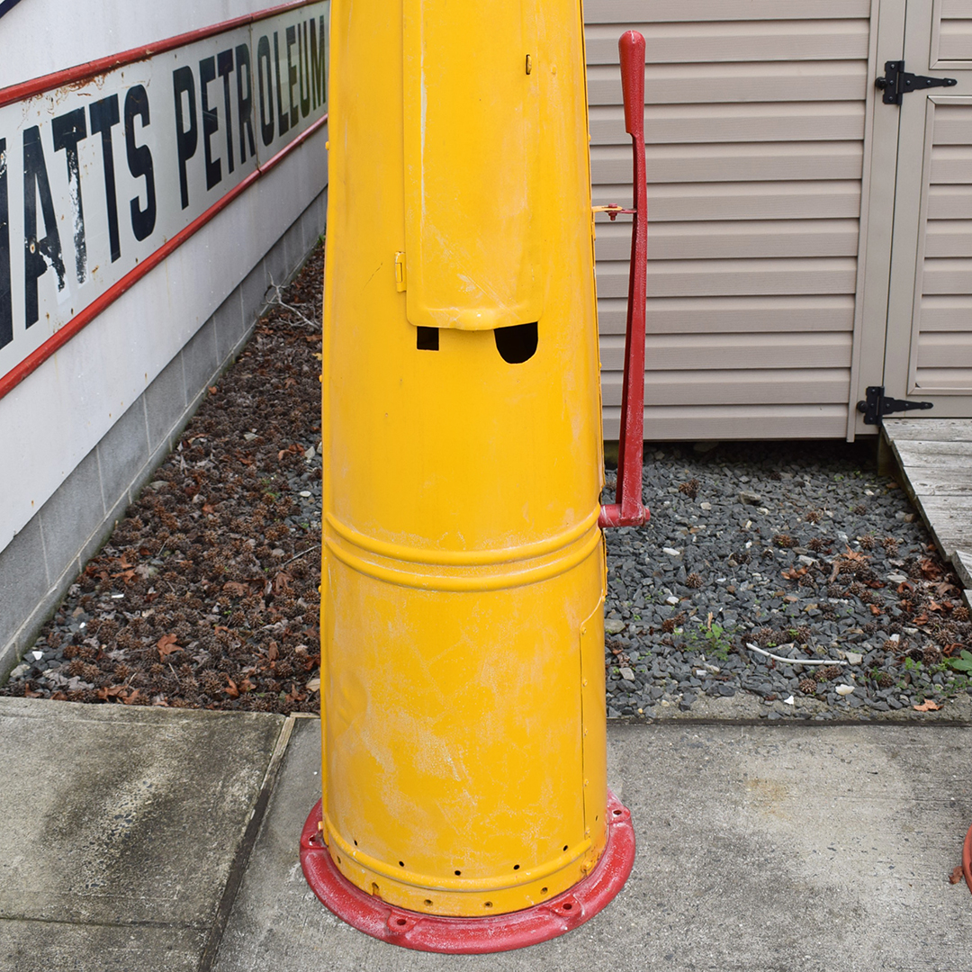 Outfitted in Shell colors, this 1927 Gilbert & Barker 176 5-gallon gravity-fed gas pump was a common sight in smaller, more rural towns. According to the information in “The Gas Pump Bible” book, this is the 4th version of the 176 model, produced by G&B. The pump stands approximately 120 inches tall, with a round base measuring 24 inches in diameter. The glass cylinder is cracked, but it displays very nicely. The iconic milk glass Shell globe atop the pump is also cracked on the left side, looking from the front of the pump. The pump has an older restoration in Shell colors and still looks very good for its age. Some minor marks are to be expected, with a few dings in the metal housing. The pump is missing the hose and nozzle. This pump is not a shippable item; it will require pickup at our location in Tasley, Virginia. 21360-QTPP