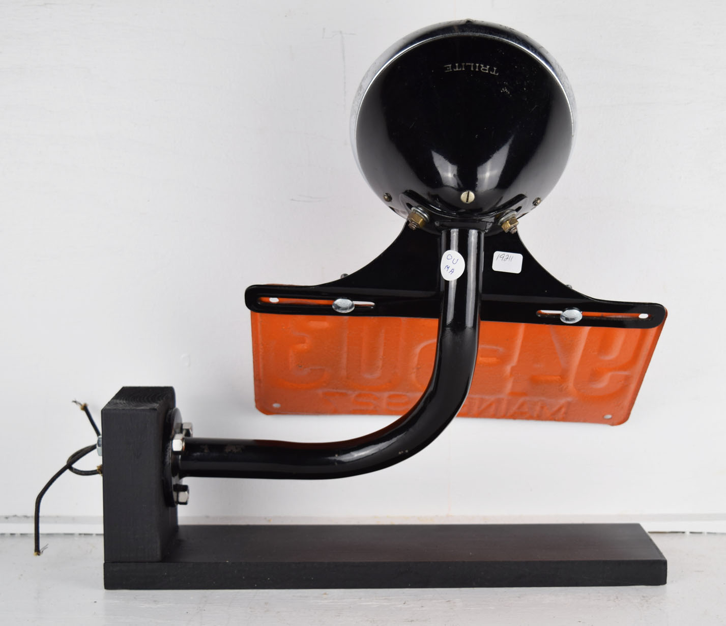 If you love old cars like we do, you will love this! Someone took a little bit of ingenuity and a 1930’s Buick tail light and combined them for this cool display! The Buick tail light measures six inches in diameter and has a three piece lens which houses a stop light, a reverse light, and a running light. The stop light has ‘Stop’ in the background that lights up, and the running light has ‘Buick’ engraved in it. The light also has a tag bracket attached to it with a 1927 Maine 5 digit license plate on it. The light and bracket are held to an original bracket that is bolted to a wooden base for display purposes. The housing of the light is stamped ‘Trilite’ on the top. The Maine license plate has some roughness in it with some wear on the numbers. The wire pigtails are exposed, so you can easily make this a cool night light! 19211-OU