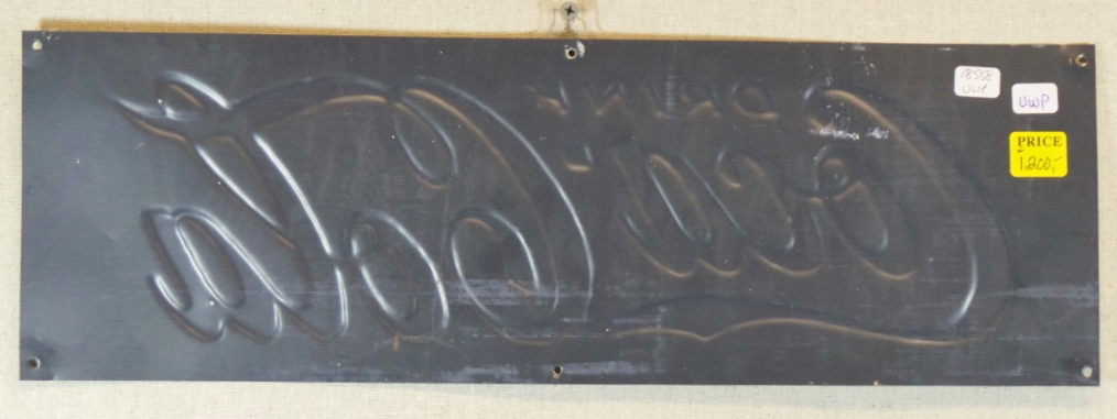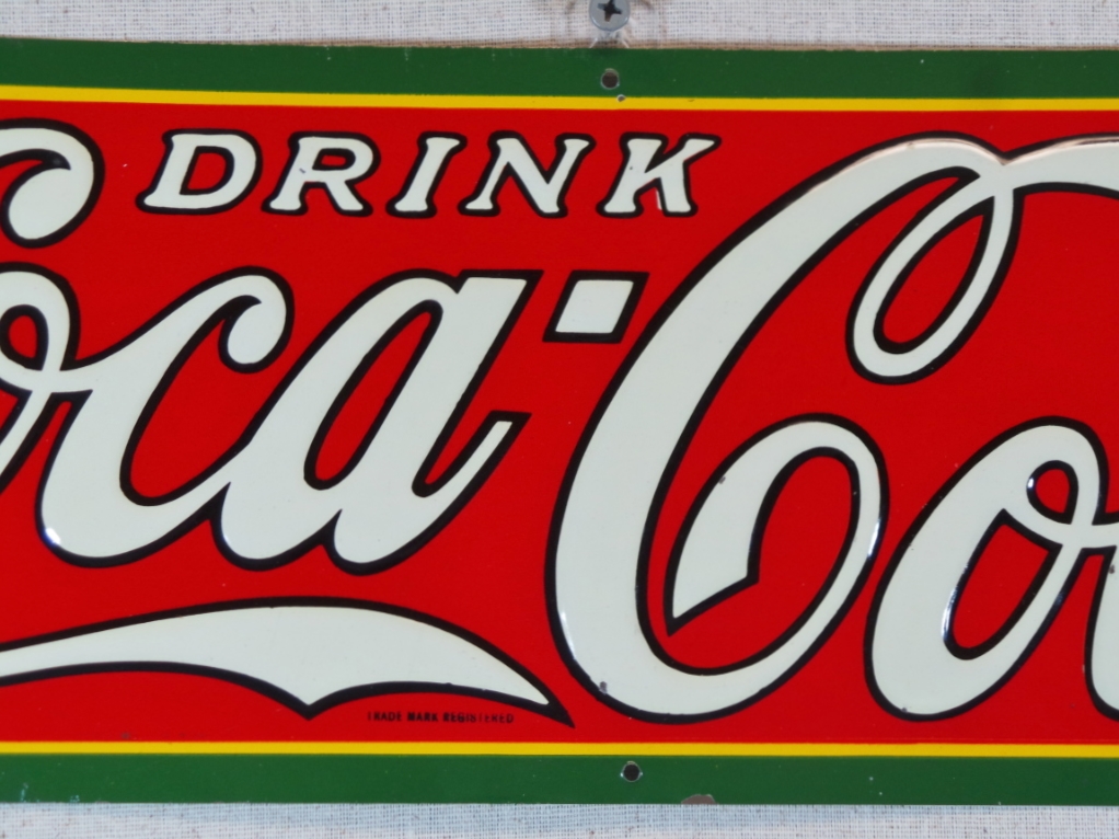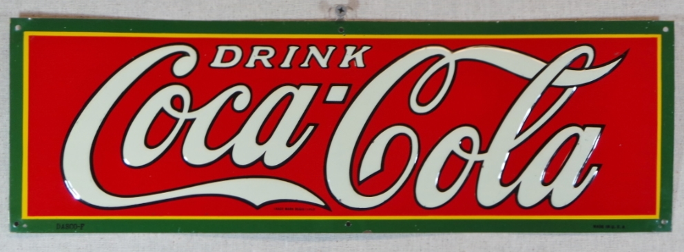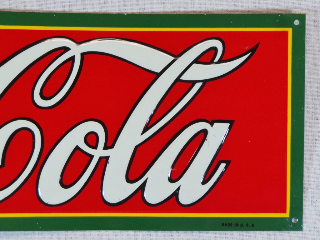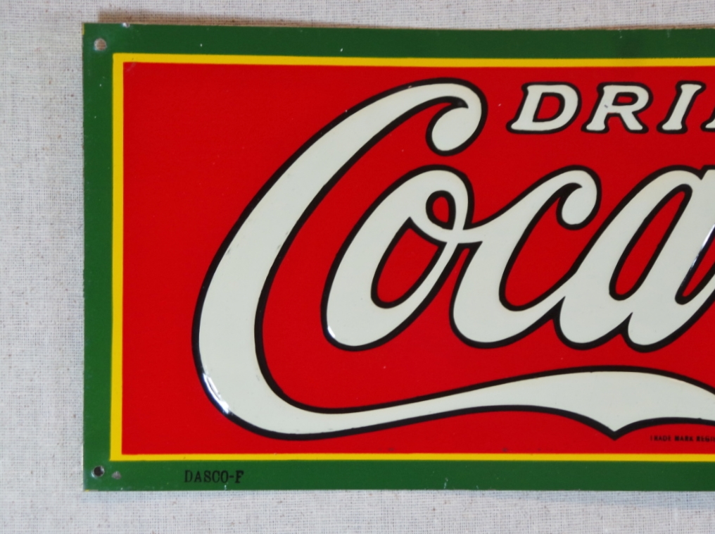 These smaller signs are getting harder and harder to come by, and most that you see are rough as a corn cob! Not this one, this is about as near mint as you can find one. The colors are amazing and it looks like it was never hung on the wall. All six mounting holes are raised to the touch, so if it had been hung, nails would have flattened them. The small bends around the holes happened in the factory when they stamped them when the sign was made. A small chip about a quarter of an inch long in the middle of the bottom edge, and a few small chips the size of a pencil tip in the “Cola” part of the sign and just below the middle top mounting hole. It is marked “Dasco-T” in the lower left, and “Made In U.S.A.” in the lower right. “Drink Coca-Cola” is embossed and looks amazing. Super nice and ready for you to display in your showcase. 18558-UWP