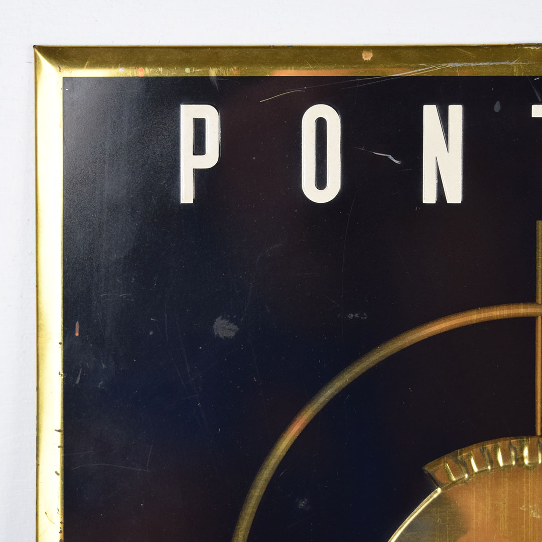 During the 1930s, Pontiac stylized their logo from the iconic Indian Head to a more streamlined, less “cartoonish” Native American, and this logo was the result. This embossed square metal sign features the logo in gold, with a black background, and white “Pontiac” letters across the top. It features a cardboard backer with a hanging string at the top with three small hooks on the bottom, and is marked “Copyright By Frank Cavanau Associates, Detroit 5, Michigan” across the top. Some light scratches with minor paint loss can be seen on the front, with a few small bends in the metal. The wear is typical, as this was a dealership sign and was moved around often. 20647-RUT