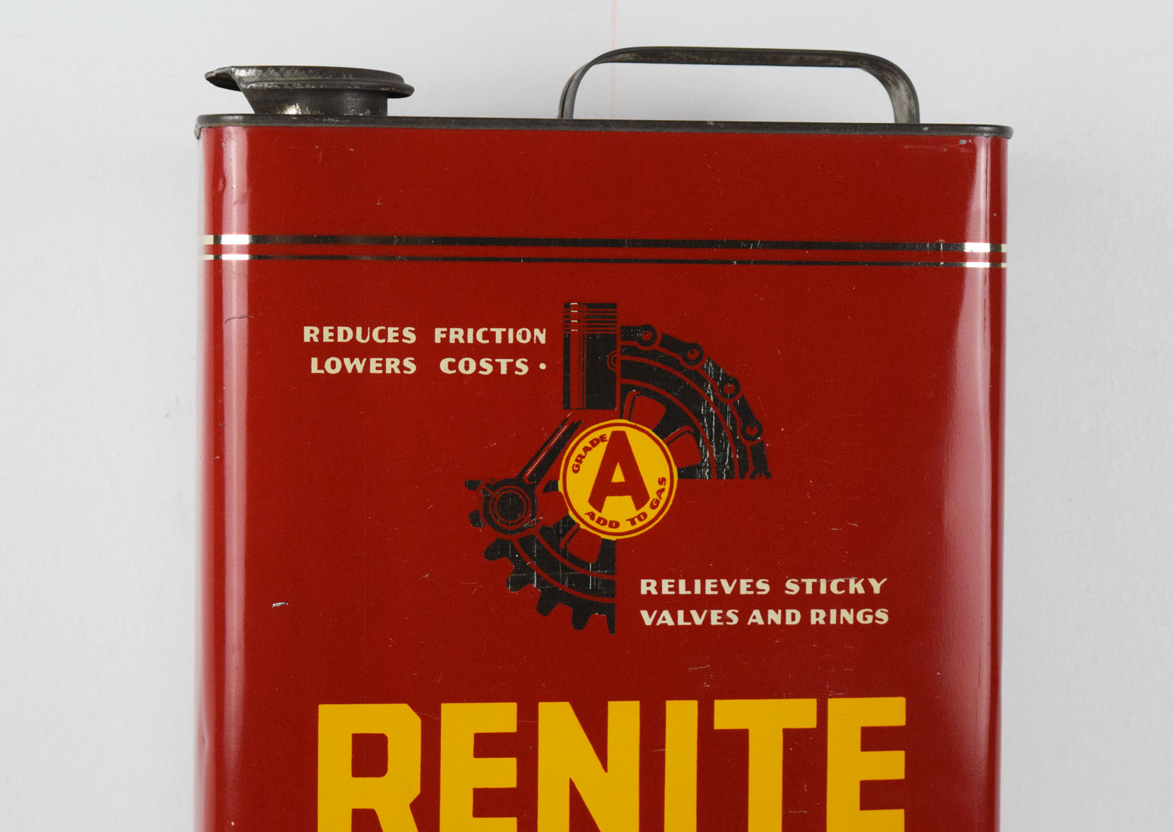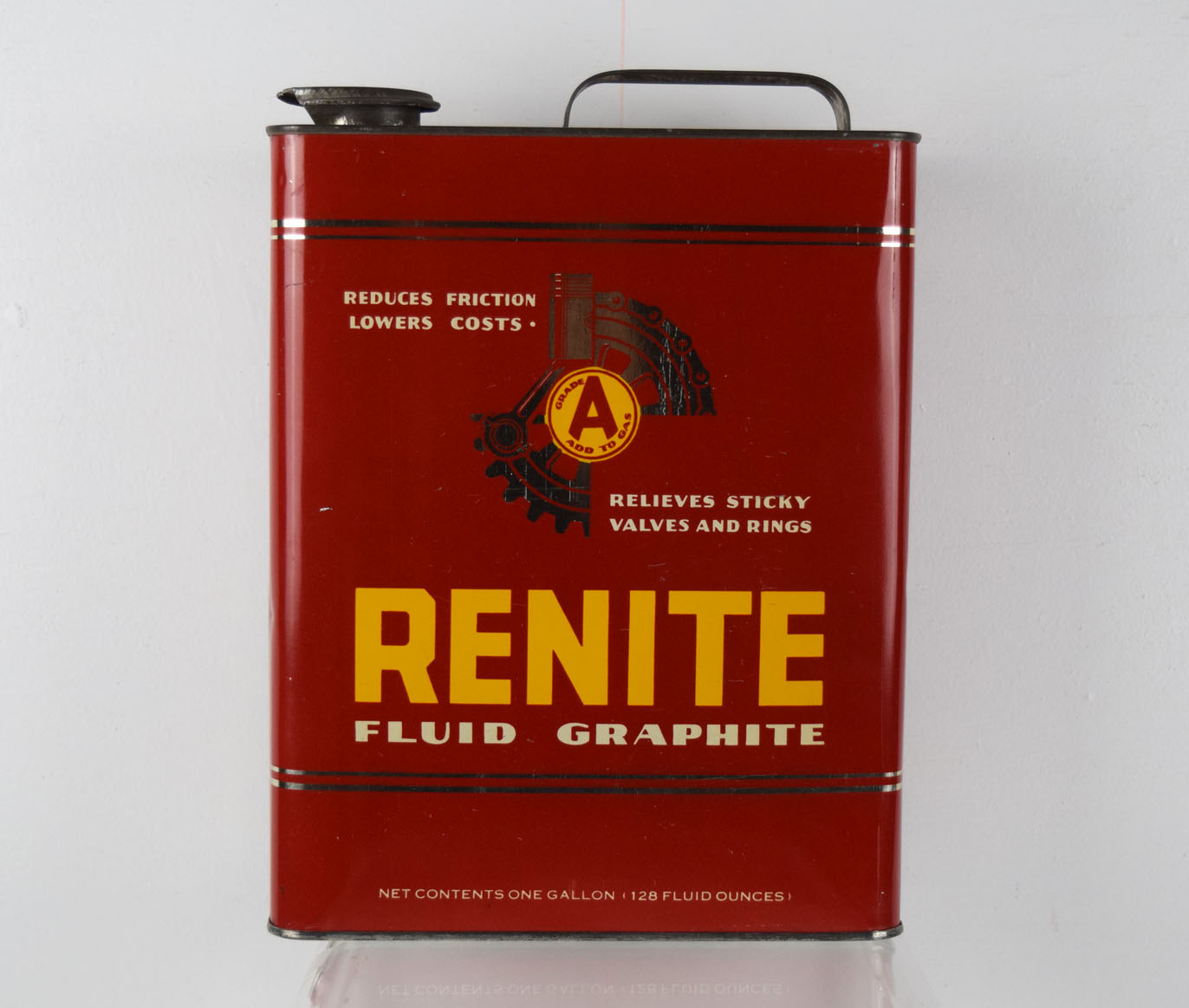 Renite Grade “A” was an additive used to clean the gum and varnish from sticky valves and rings in your cars engine. It was added to the gasoline to keep your engine running as it should, or could be poured directly into the carburetor or spark plug openings to free a stuck ring. The front reads “Renite Fluid Graphite” and shows a gear, a piston, and a timing chain. The back is full of directions and is marked “Copyright 1934 By Harry M. Reynolds, Columbus, Ohio”. Some minor scratches are on the can along with a small dent or two from use over the years. The cap is missing, and it has some solder residue on the handle. The can is red with bare metal highlights and yellow letters, so it stands out nicely against your other gallon cans in your collection. Because it is a one gallon can, it was used in your local service station or garage as needed. 19323-QPP