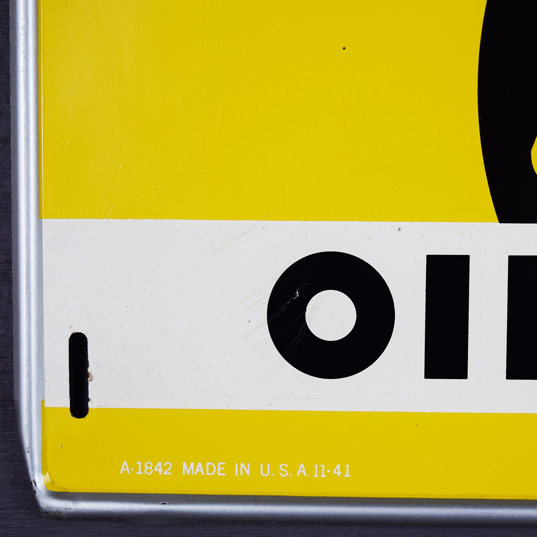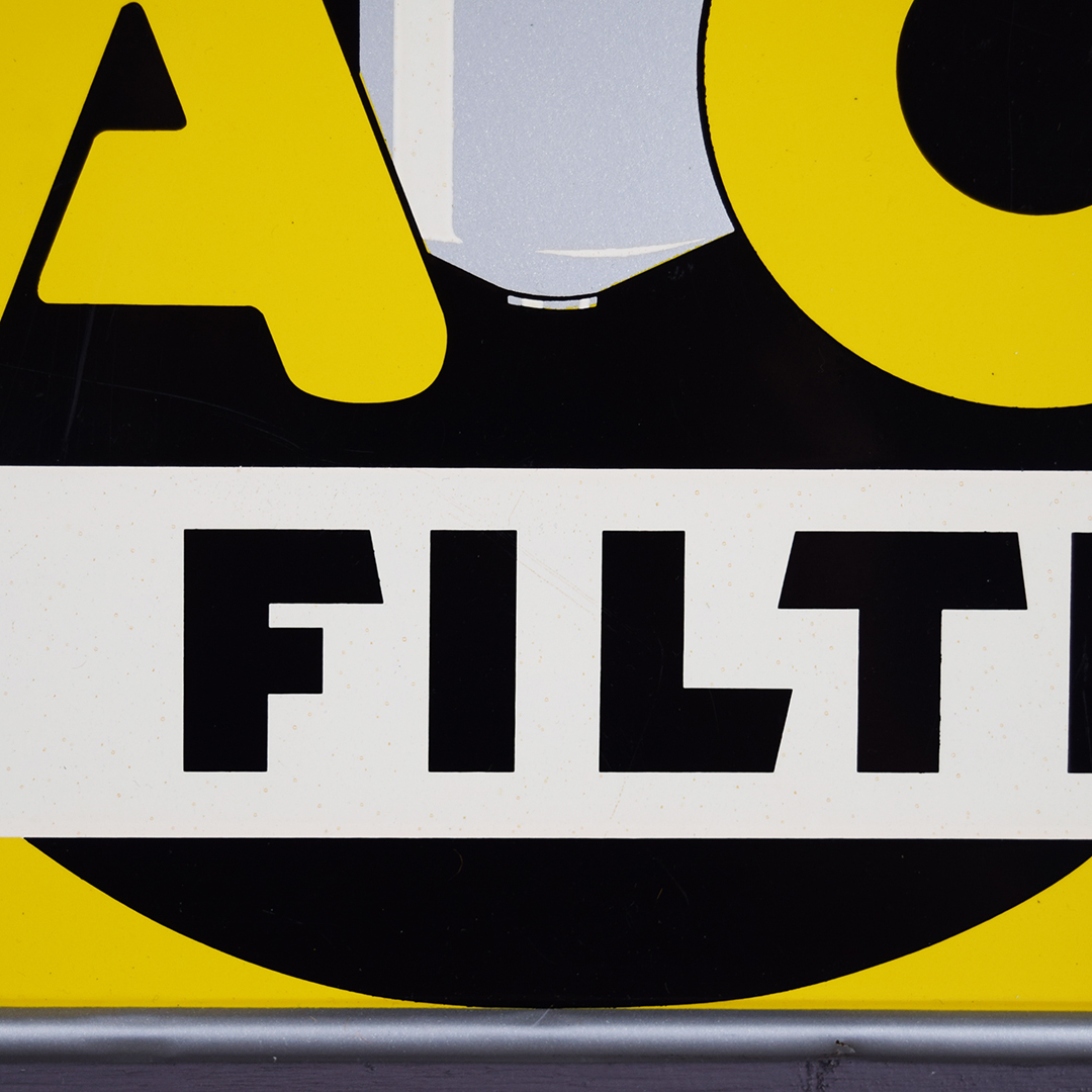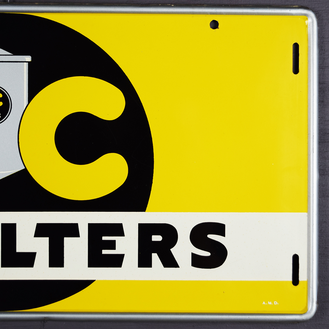How about this beauty? Dated 11-41 in the lower left corner, this tin self-framed AC Oil Filters sign measures 9 inches tall by 18 inches wide and will make a great addition to your collection. The colors really pop on this sign, which features the iconic canister logo in the black circle. Condition details: A small bend is visible in the lower left corner and along the top lip. There is also a bend and some paint loss around the upper left mounting hole, as well as a few light scratches on the left side of the sign. Do not miss your opportunity to add this example to your collection today! 21486-UTP