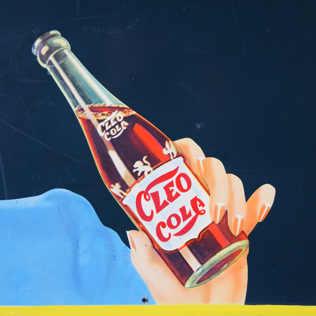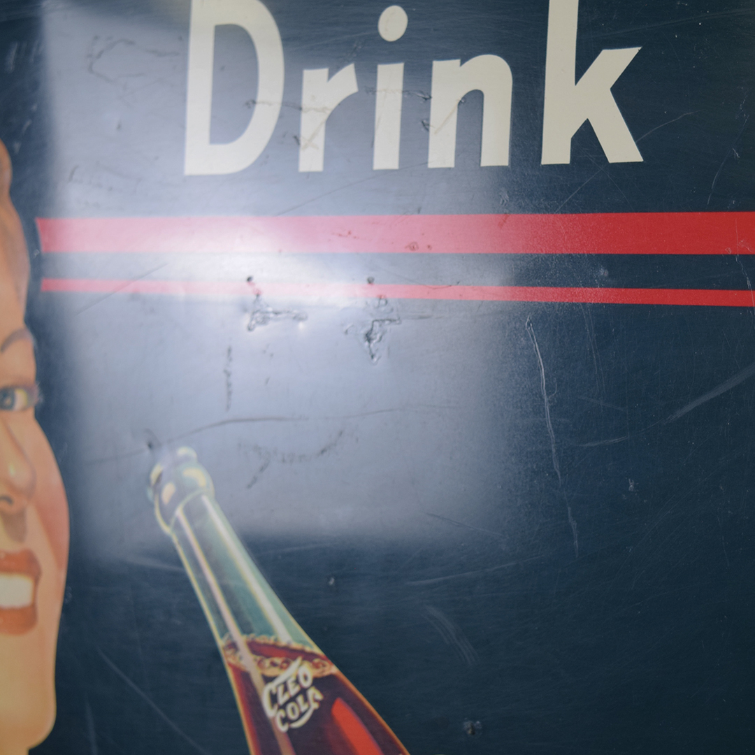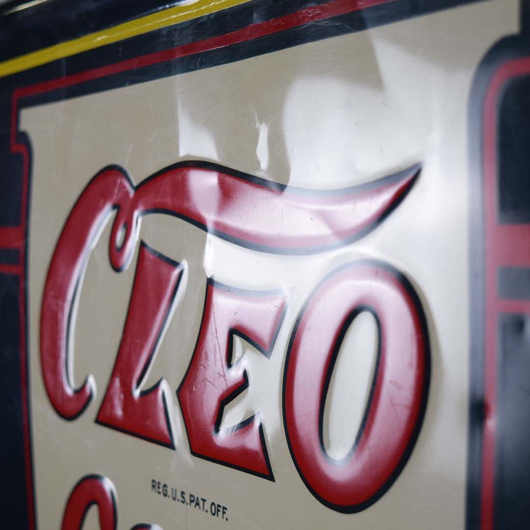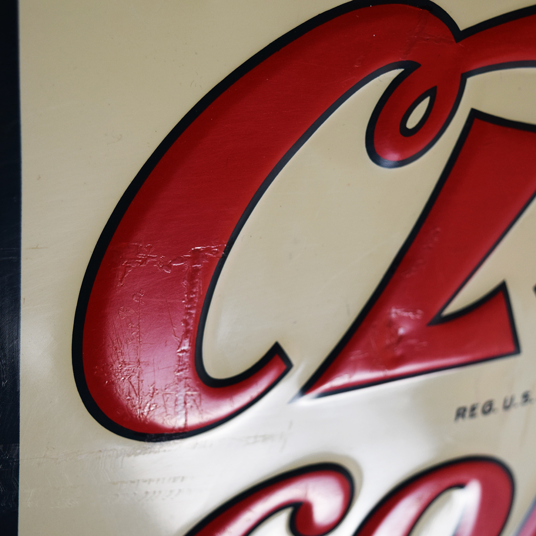 Rare sign enthusiasts, take note—here’s a true gem! This Cleo Cola embossed tin sign, dated 1941, is in superb condition. It measures 18.25 inches tall by 54 inches wide and features a self-framing design around the outside. The “Cleo Cola” letters are embossed, and the graphics show a smiling lady holding a bottle of Cleo Cola. Under close inspection, one can see some minor scratches with touch-up paint applied in those areas. Very minor bending is evident in the white background behind the Cleo Cola script. It is marked “Vess Beverage Co. 1941 CS-601” in the lower right corner. Signs such as this one do not surface very often, so don’t miss your opportunity to own this beauty! 21471-QITP