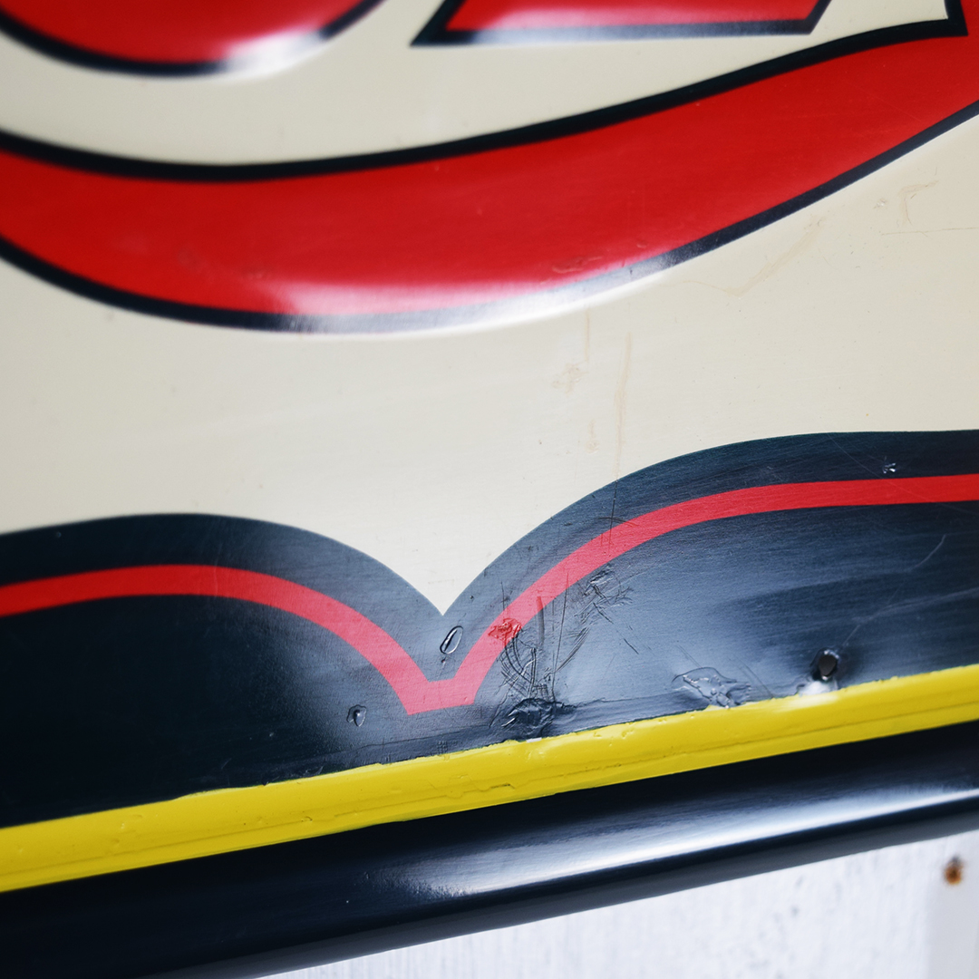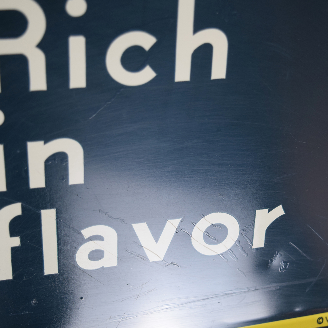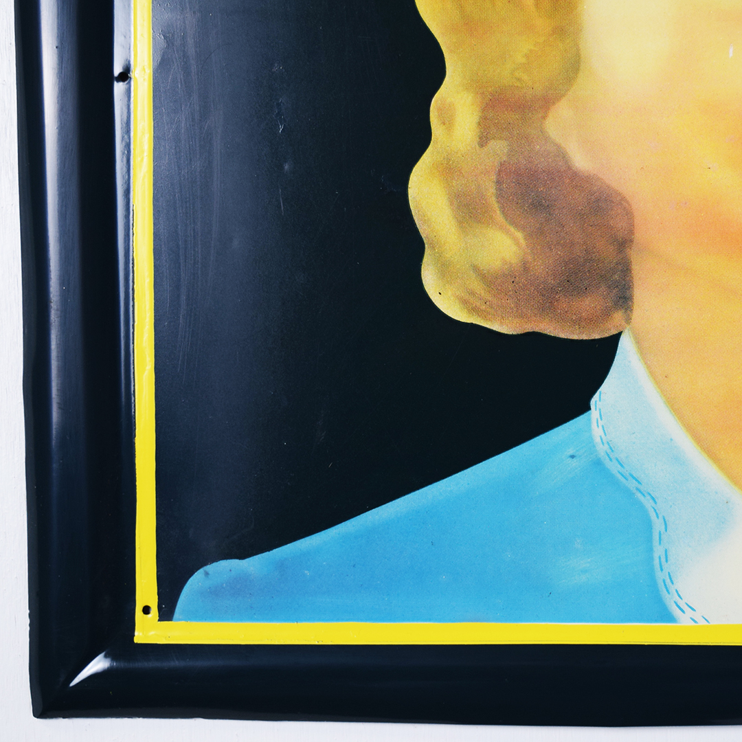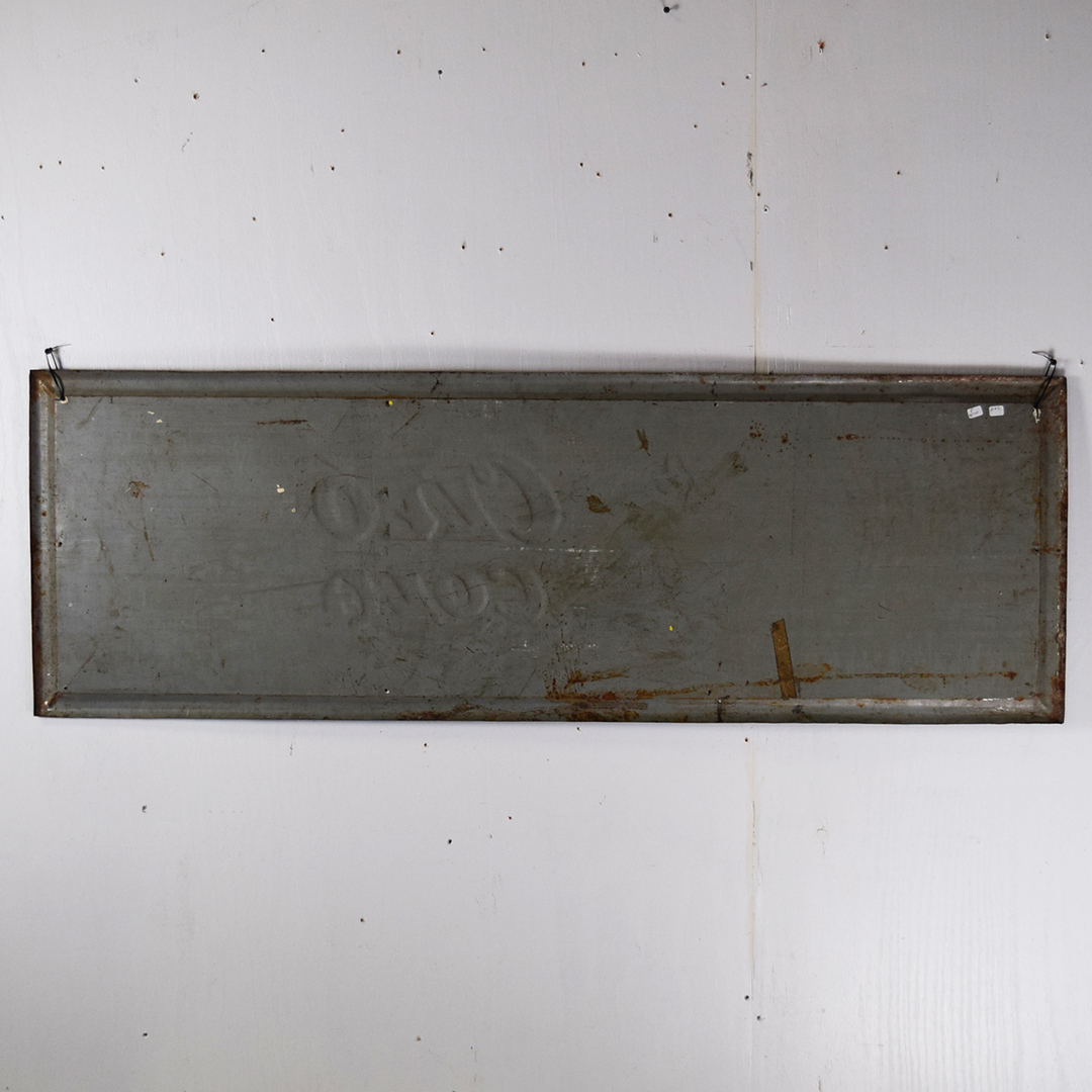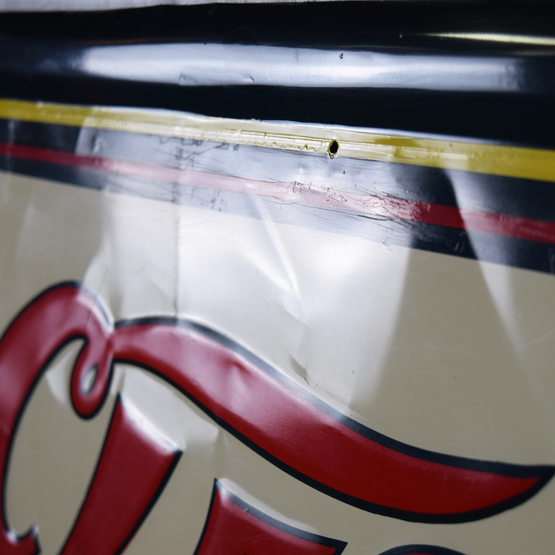 Rare sign enthusiasts, take note—here’s a true gem! This Cleo Cola embossed tin sign, dated 1941, is in superb condition. It measures 18.25 inches tall by 54 inches wide and features a self-framing design around the outside. The “Cleo Cola” letters are embossed, and the graphics show a smiling lady holding a bottle of Cleo Cola. Under close inspection, one can see some minor scratches with touch-up paint applied in those areas. Very minor bending is evident in the white background behind the Cleo Cola script. It is marked “Vess Beverage Co. 1941 CS-601” in the lower right corner. Signs such as this one do not surface very often, so don’t miss your opportunity to own this beauty! 21471-QITP