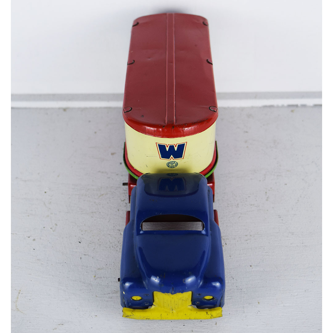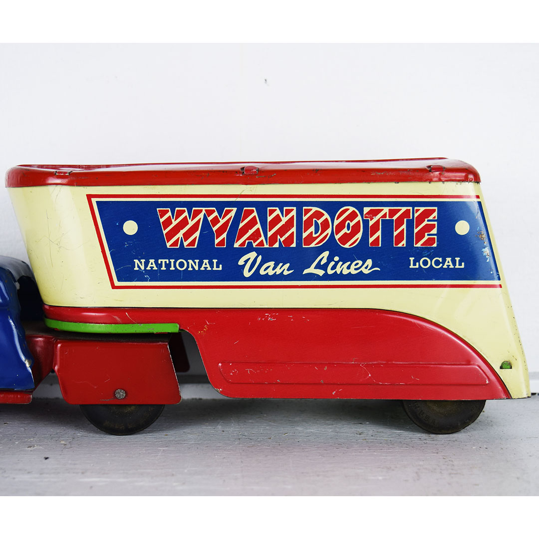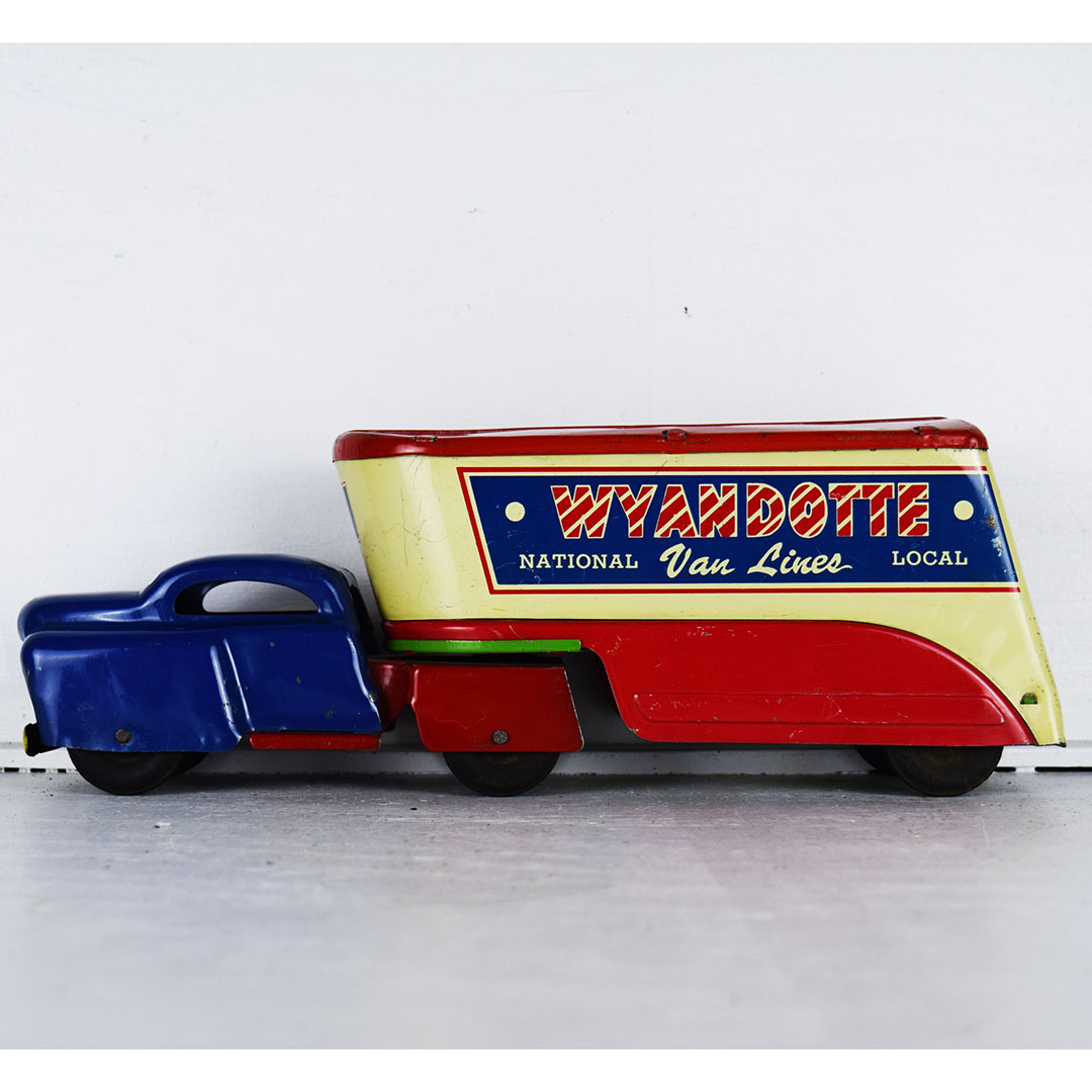 Produced in this style from 1947 to 1949, this Wyandotte Van Lines pressed steel toy truck garnered lots of time making deliveries on the living room floor. The moving trailer is attached to a bullet-nosed GMC cab and flows nicely with the aerodynamic trailer. Both the cab and the trailer have some scratches with paint loss. A ding on each side of the front of the trailer is seen just above the truck’s rear wheels. It features hard rubber tires and is in complete shape. It measures 15 inches long, 5 inches tall, and 4 inches wide. 20842-QYT