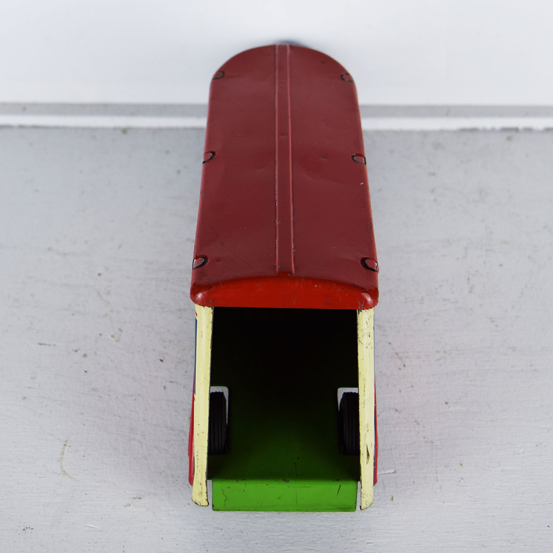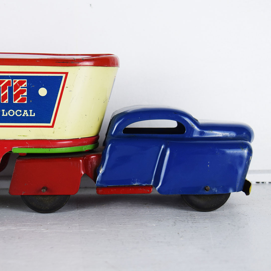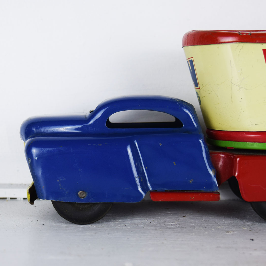 Produced in this style from 1947 to 1949, this Wyandotte Van Lines pressed steel toy truck garnered lots of time making deliveries on the living room floor. The moving trailer is attached to a bullet-nosed GMC cab and flows nicely with the aerodynamic trailer. Both the cab and the trailer have some scratches with paint loss. A ding on each side of the front of the trailer is seen just above the truck’s rear wheels. It features hard rubber tires and is in complete shape. It measures 15 inches long, 5 inches tall, and 4 inches wide. 20842-QYT