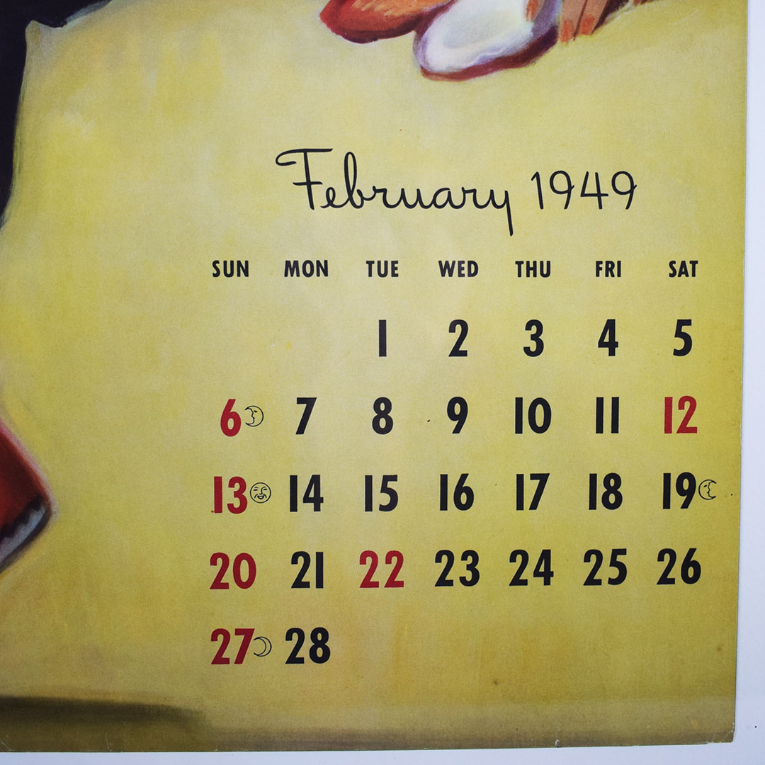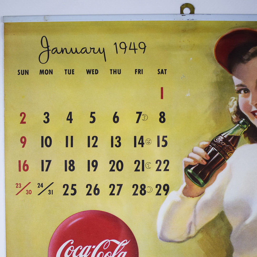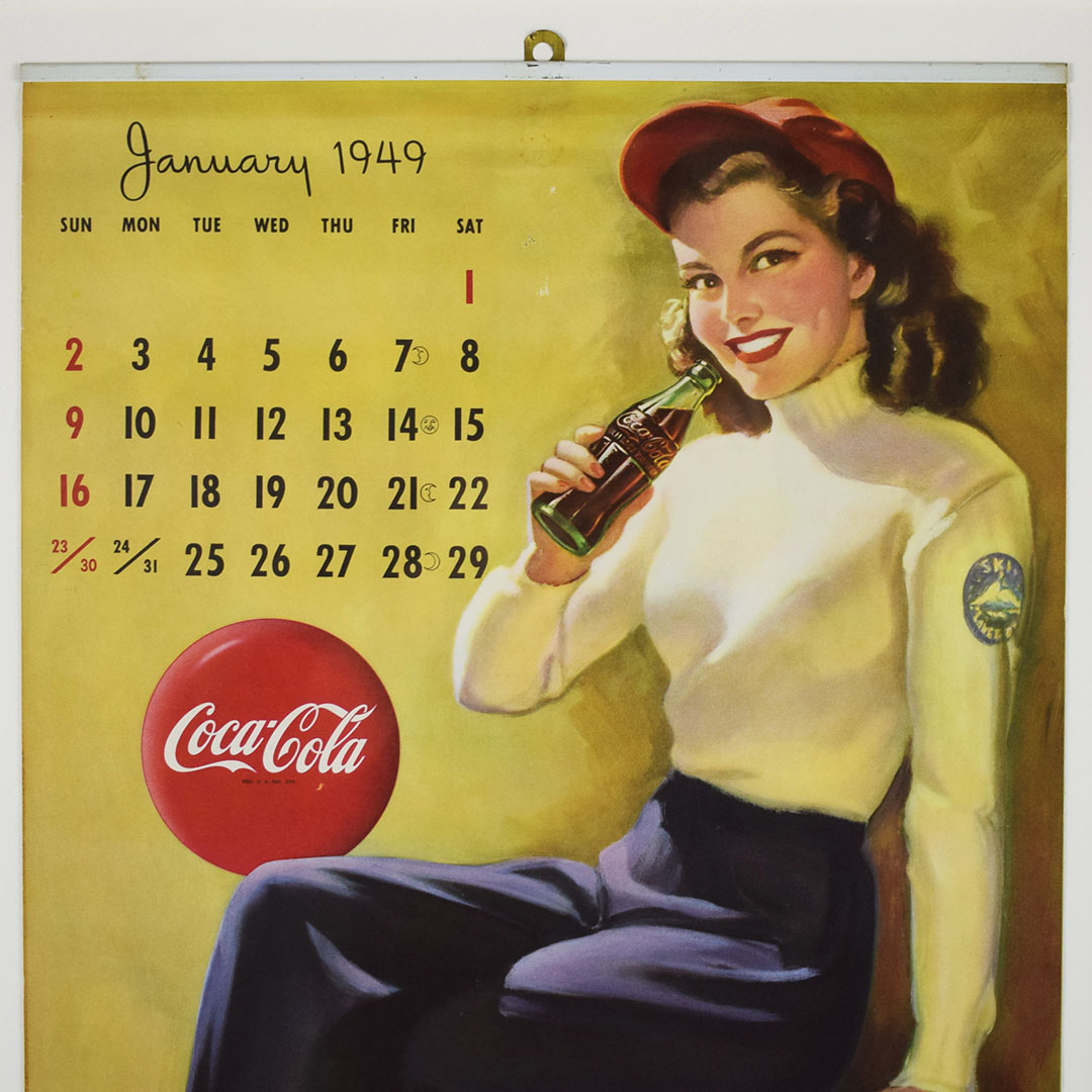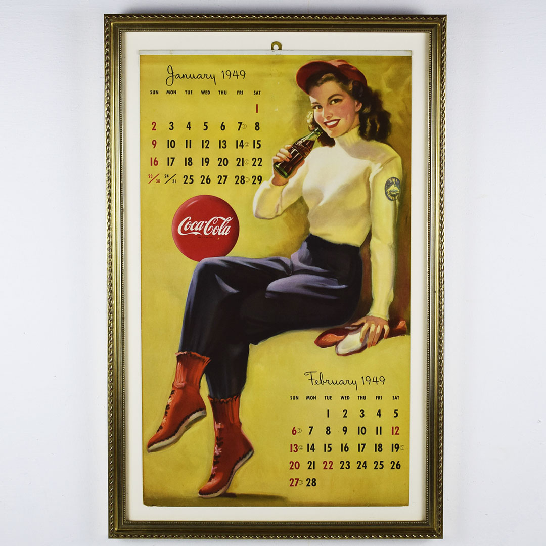 Before you had a calendar on your phone, wall calendars graced the walls of service stations, diners, and grocery stores. Coca-Cola knew this, and the route salesman dropped off these calendars for the new year around Christmas time. This 1949 wall calendar featured six pages, each with two months, and a pretty lady enjoying an ice-cold Coca-Cola. A metal bar with a hook is at the top of the calendar pages. The pages tore quickly from the metal bar once the two months had passed. It is rare to find a complete calendar such as this one. Light wear is along the bottom edge. The calendar features excellent colors and has been professionally framed to protect it and allow you to easily display it. 21263-WPP