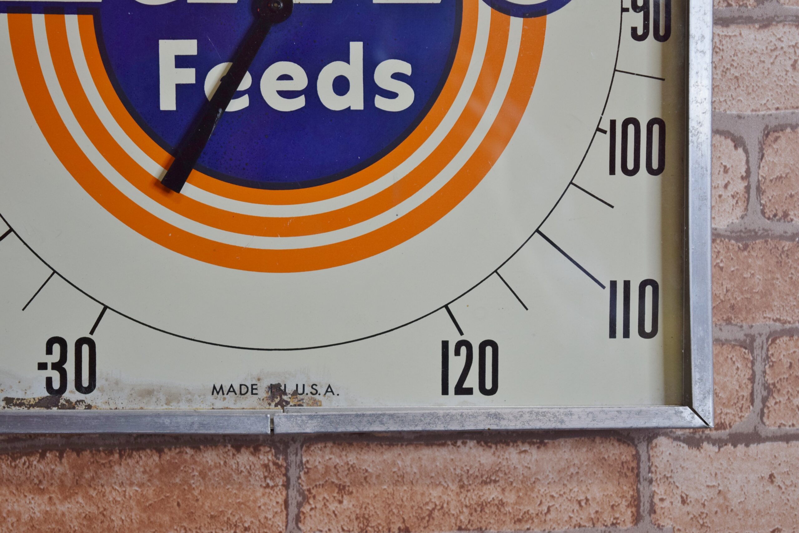 Agriculture and farming advertising is some of the rarest forms of advertising we see. Mostly because agriculture was more rural than city, so they did not have to make as many signs as say Coca Cola had to. Can you imagine seeing this Larro Feeds thermometer in downtown Manhattan? Don’t think so! This thermometer would have been right at home outside the local general store in rural America in the early 1950’s. The square aluminum case makes it different than the typical round thermometers you see from other advertisers and really catches your eyes. Beneath the glass cover, the aluminum face has some corrosion and paint chipping in the lower left corner. The face of the thermometer is very colorful with a small dent just below 45 degrees. The needle has some paint loss near the top, and is about 5 degrees off temperature wise. Some small dents on the outer corners of the aluminum case do not detract from its beauty. 18689-EPP