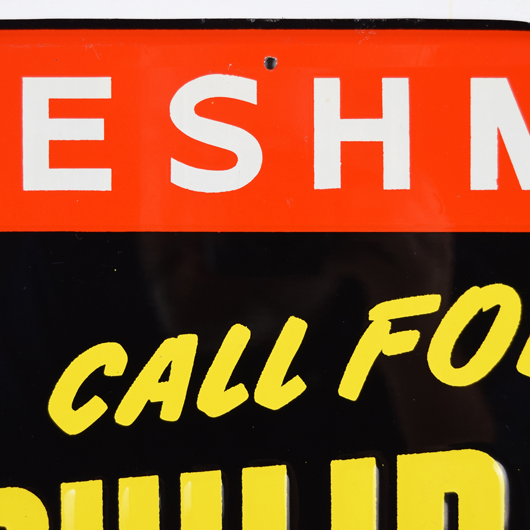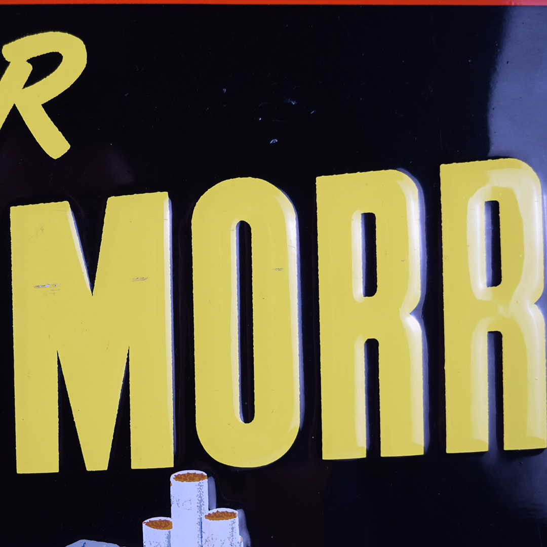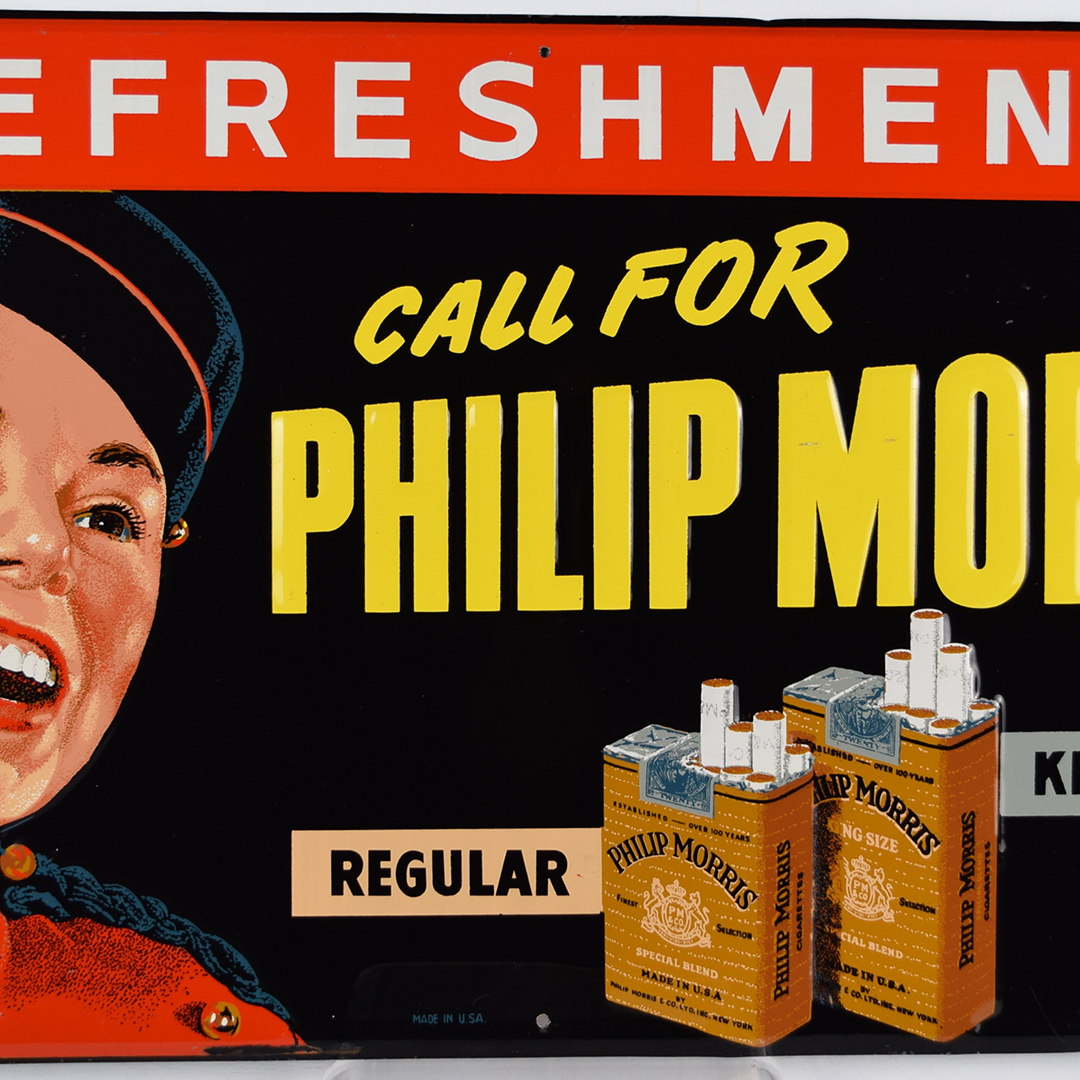 In the 1950s, cigarette advertisements were a prominent fixture of everyday life. They reflected the widespread popularity of smoking at the time. This Philip Morris embossed metal sign measures 15 1/4 inches tall by 27 1/4 inches wide. It advertises both the regular pack size and the king-size packs of Philip Morris’ cigarettes. The top red panel reads “Refreshments” in white letters. The mascot calls out, “Call for Philip Morris.” On this sign, the “Philip Morris” letters and the two packs of cigarettes are embossed. The gloss and colors on this 1953 sign make it stand out. Typical wear on the outer edges is very minor, with only small scratches on the “Morris” letters, and some small chips in the black background. 21462-QTPP