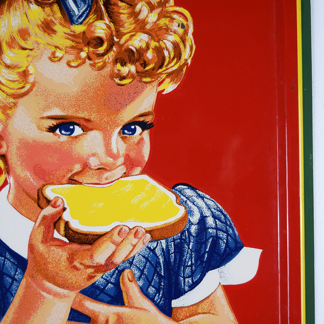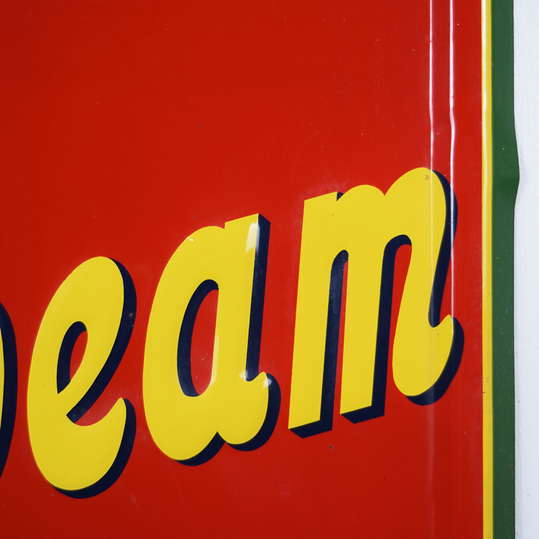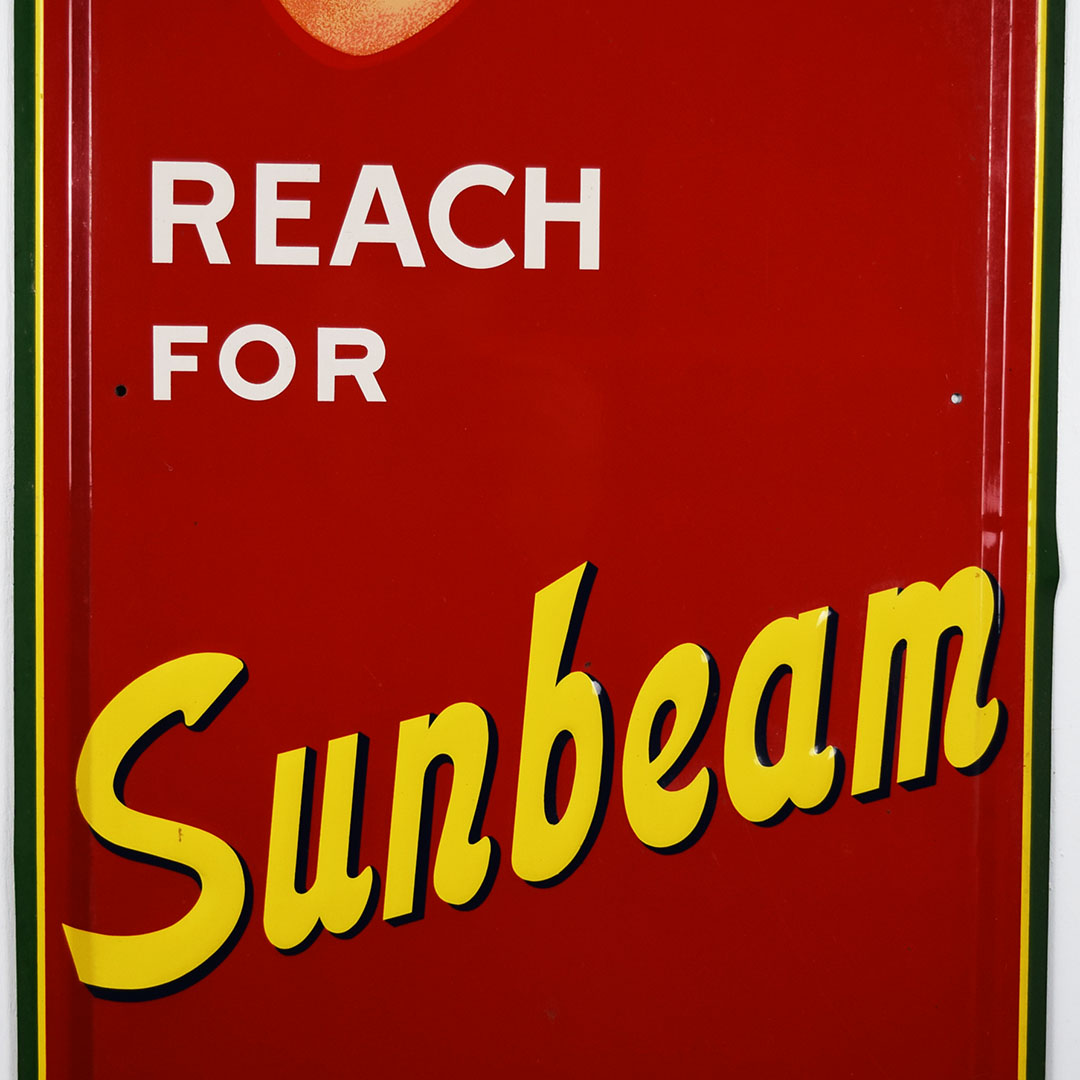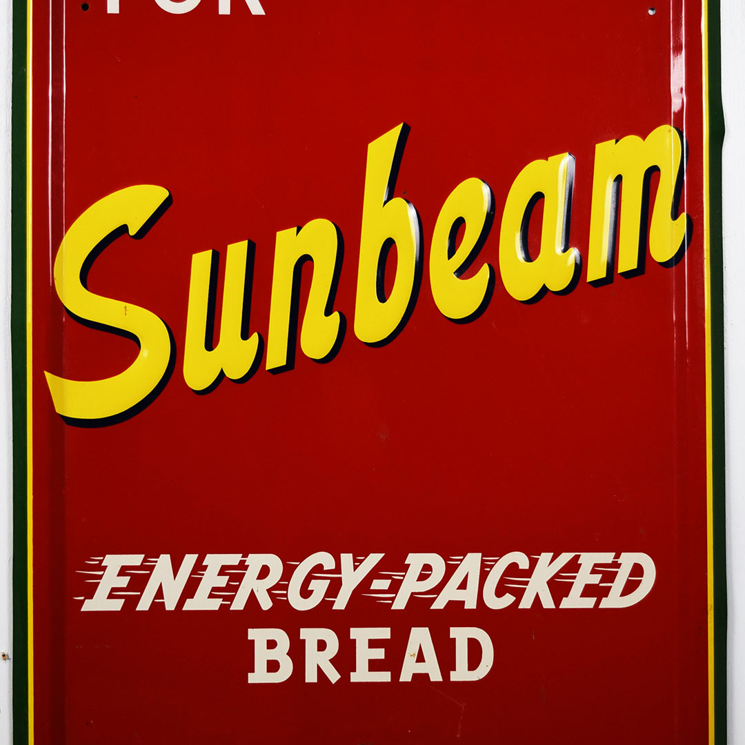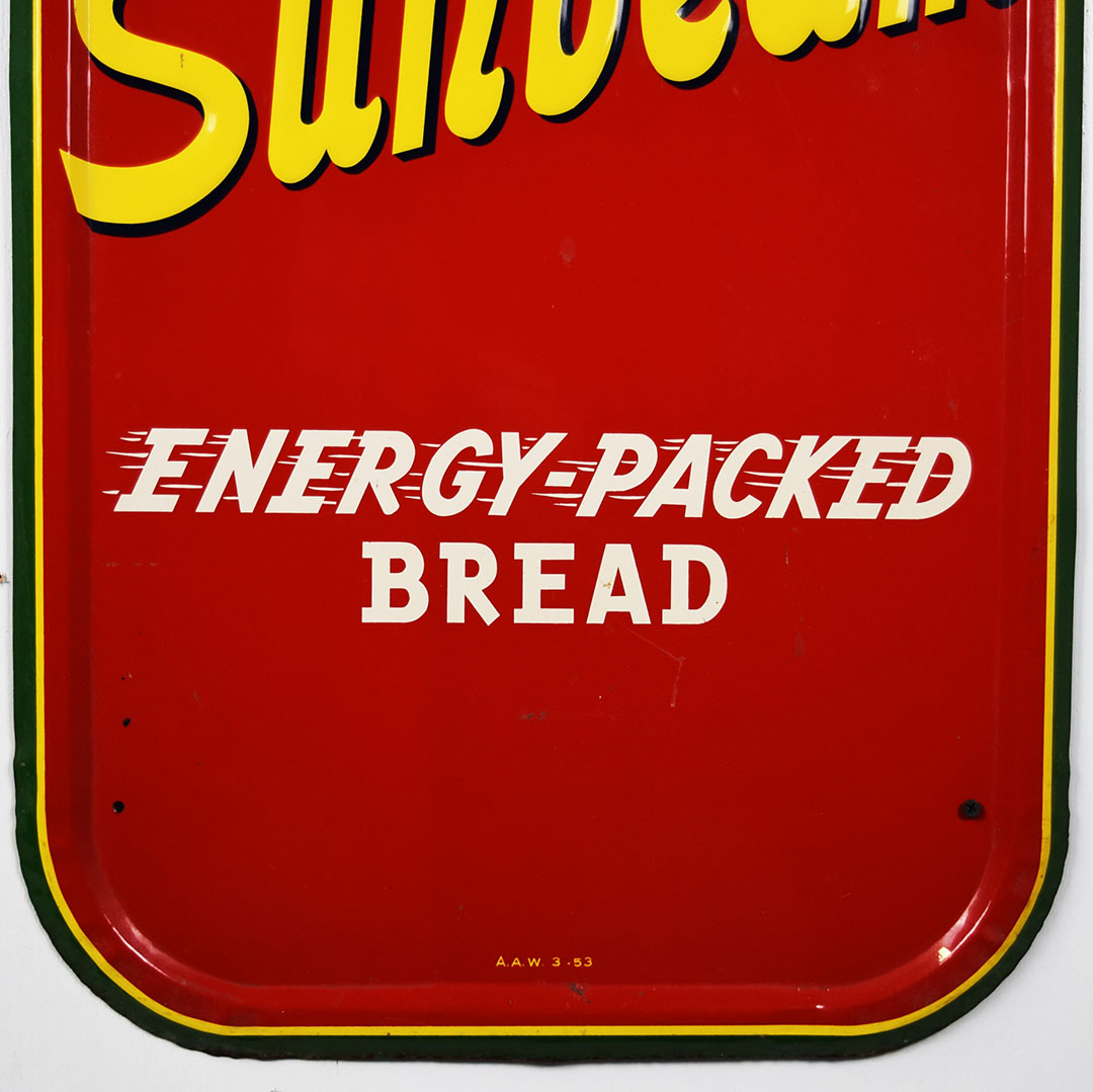 Full of color and life, this 55-inch vertical Sunbeam sign has all the must-haves crossed off! Beautiful embossed graphic of the iconic Sunbeam girl enjoying her bread at the top, plus sharp gloss up and down this metal sign. The outer edge is self-framed, with a strong color contrast between red, yellow, and green. The bright yellow “Sunbeam” is also embossed on the bottom half of this sign. Very minor marks on the face of this sign, with a small bend on the right side about 2/3 of the way down. It is marked “A. A. W. 3 – 53” along the bottom edge, as it was produced by American Art Works in March of 1953. On the reverse, some minor surface rust is along the very bottom edge. The sign measures 55 inches tall by 19 inches wide and is ready for your wall! 21546-QYIP