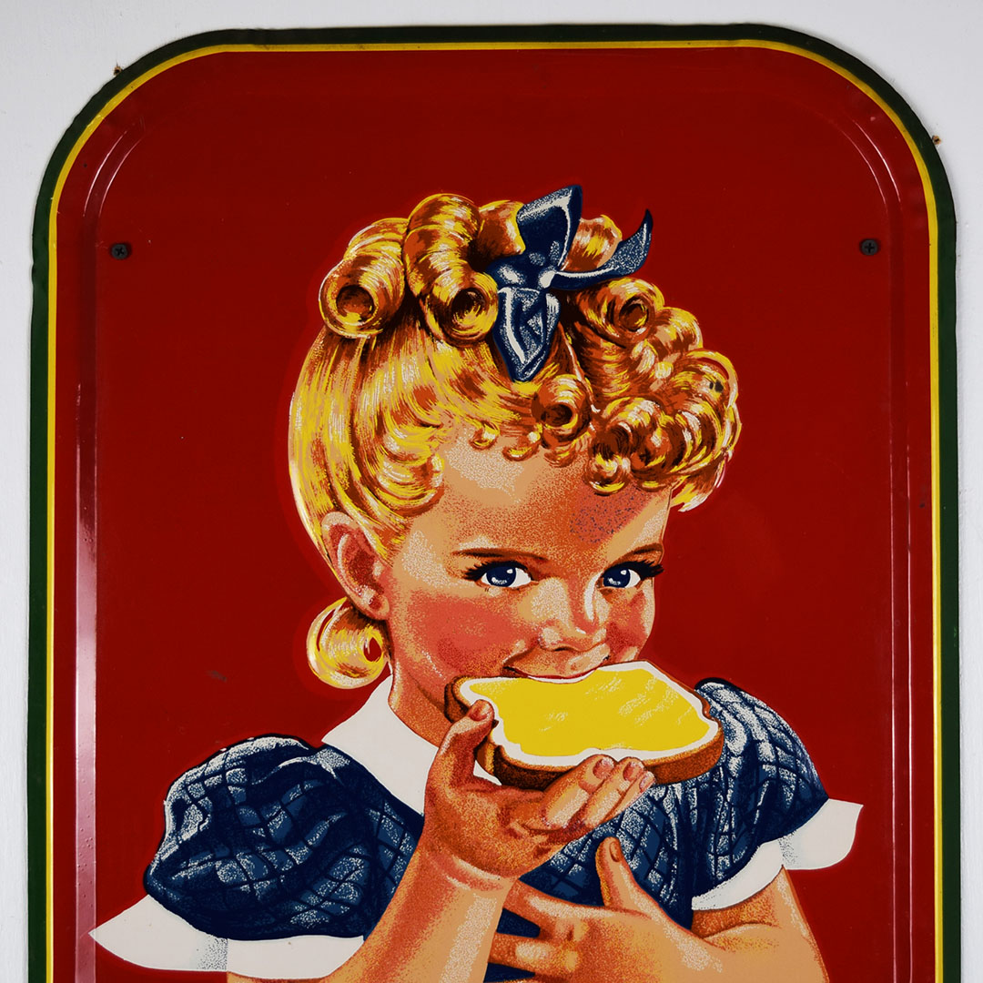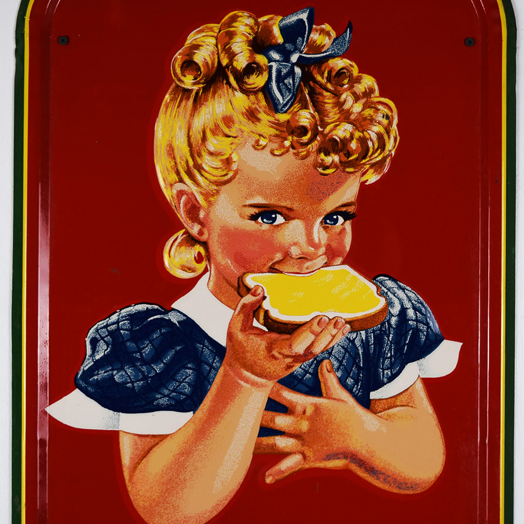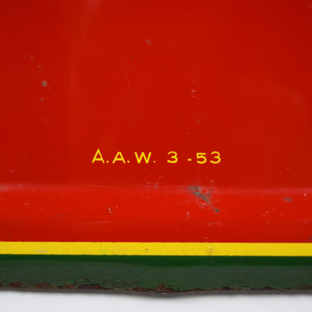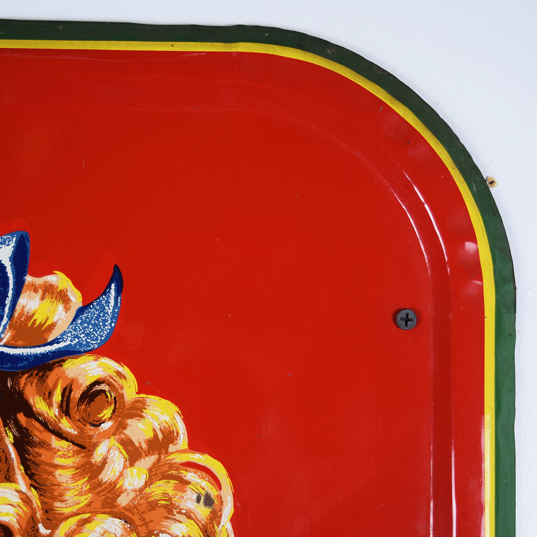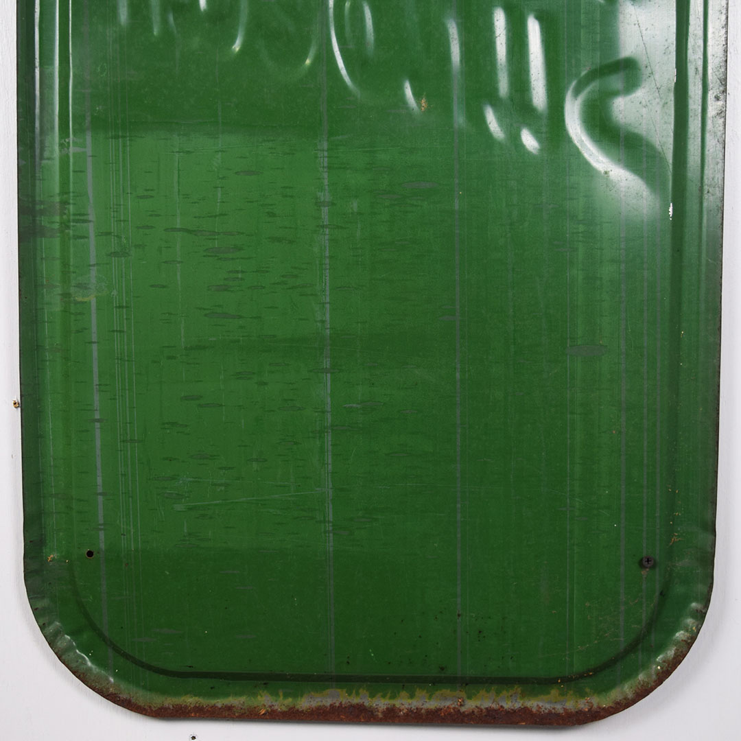 Full of color and life, this 55-inch vertical Sunbeam sign has all the must-haves crossed off! Beautiful embossed graphic of the iconic Sunbeam girl enjoying her bread at the top, plus sharp gloss up and down this metal sign. The outer edge is self-framed, with a strong color contrast between red, yellow, and green. The bright yellow “Sunbeam” is also embossed on the bottom half of this sign. Very minor marks on the face of this sign, with a small bend on the right side about 2/3 of the way down. It is marked “A. A. W. 3 – 53” along the bottom edge, as it was produced by American Art Works in March of 1953. On the reverse, some minor surface rust is along the very bottom edge. The sign measures 55 inches tall by 19 inches wide and is ready for your wall! 21546-QYIP