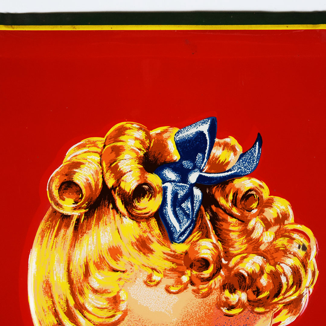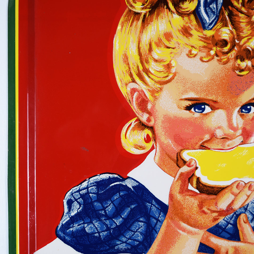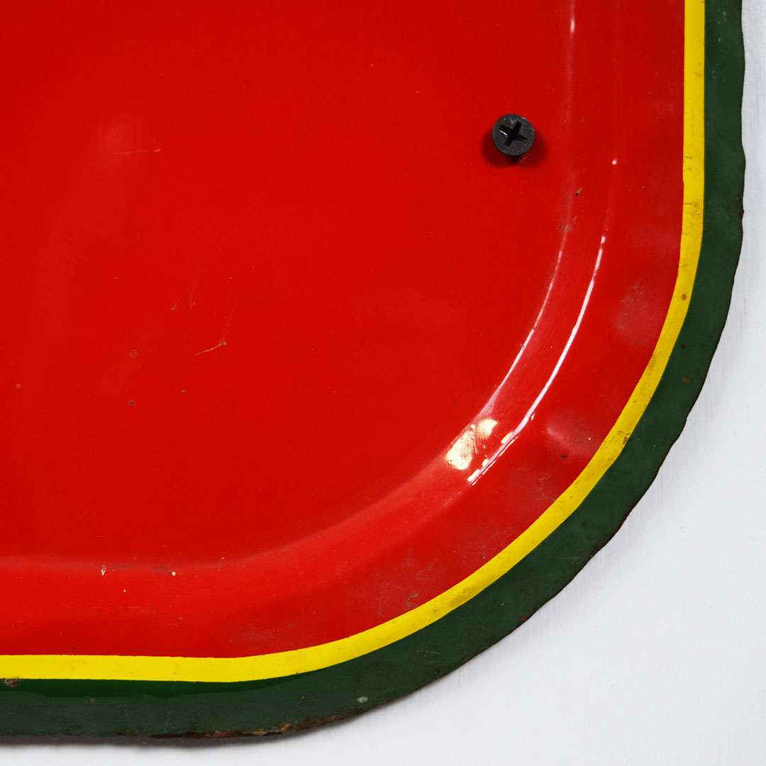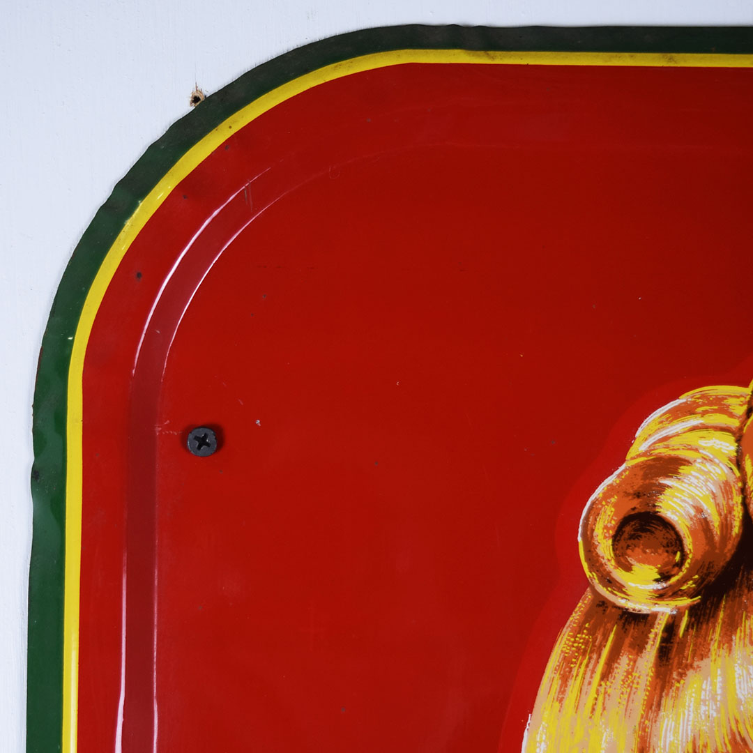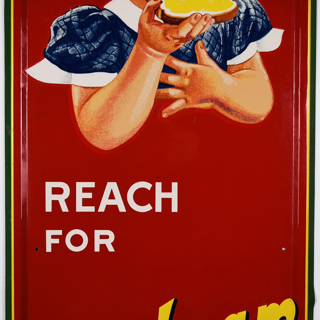 Full of color and life, this 55-inch vertical Sunbeam sign has all the must-haves crossed off! Beautiful embossed graphic of the iconic Sunbeam girl enjoying her bread at the top, plus sharp gloss up and down this metal sign. The outer edge is self-framed, with a strong color contrast between red, yellow, and green. The bright yellow “Sunbeam” is also embossed on the bottom half of this sign. Very minor marks on the face of this sign, with a small bend on the right side about 2/3 of the way down. It is marked “A. A. W. 3 – 53” along the bottom edge, as it was produced by American Art Works in March of 1953. On the reverse, some minor surface rust is along the very bottom edge. The sign measures 55 inches tall by 19 inches wide and is ready for your wall! 21546-QYIP