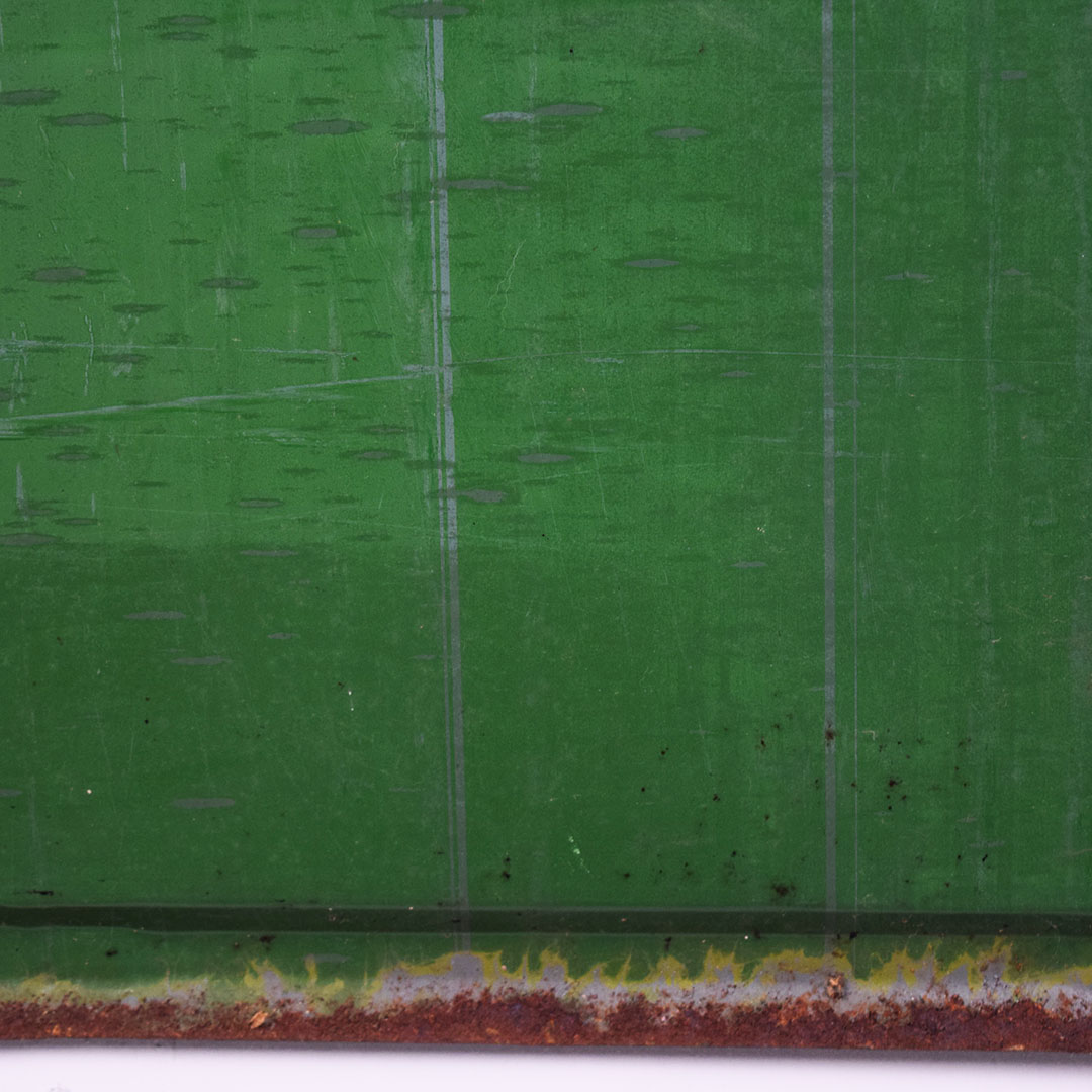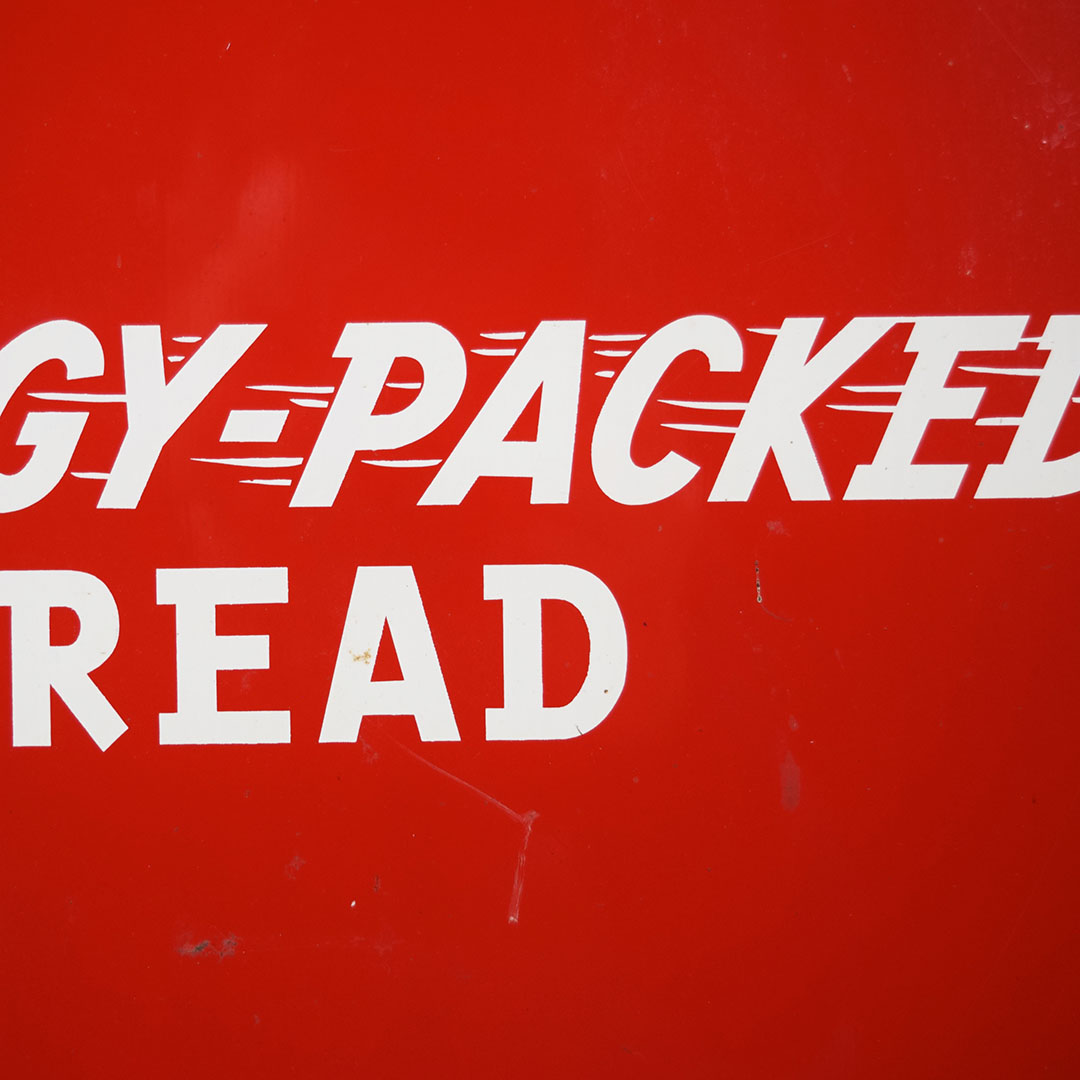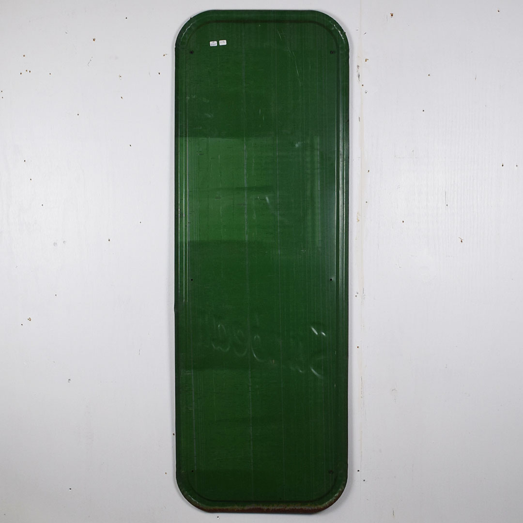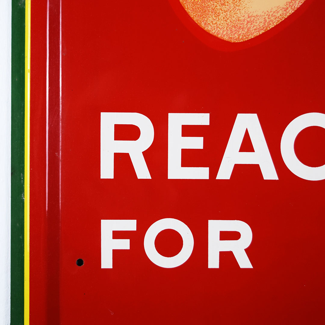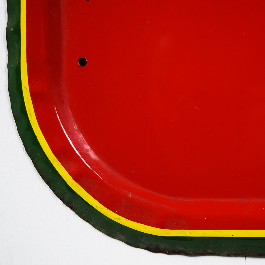 Full of color and life, this 55-inch vertical Sunbeam sign has all the must-haves crossed off! Beautiful embossed graphic of the iconic Sunbeam girl enjoying her bread at the top, plus sharp gloss up and down this metal sign. The outer edge is self-framed, with a strong color contrast between red, yellow, and green. The bright yellow “Sunbeam” is also embossed on the bottom half of this sign. Very minor marks on the face of this sign, with a small bend on the right side about 2/3 of the way down. It is marked “A. A. W. 3 – 53” along the bottom edge, as it was produced by American Art Works in March of 1953. On the reverse, some minor surface rust is along the very bottom edge. The sign measures 55 inches tall by 19 inches wide and is ready for your wall! 21546-QYIP