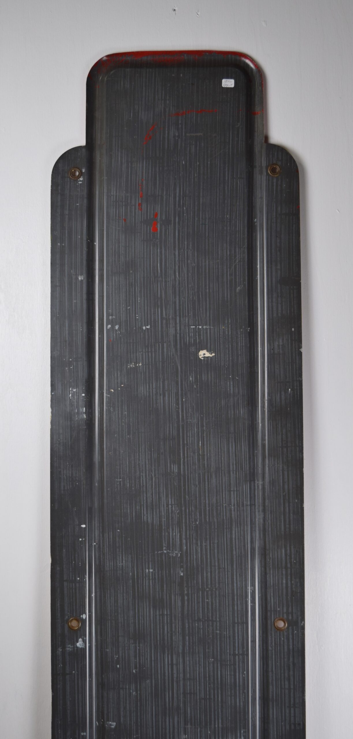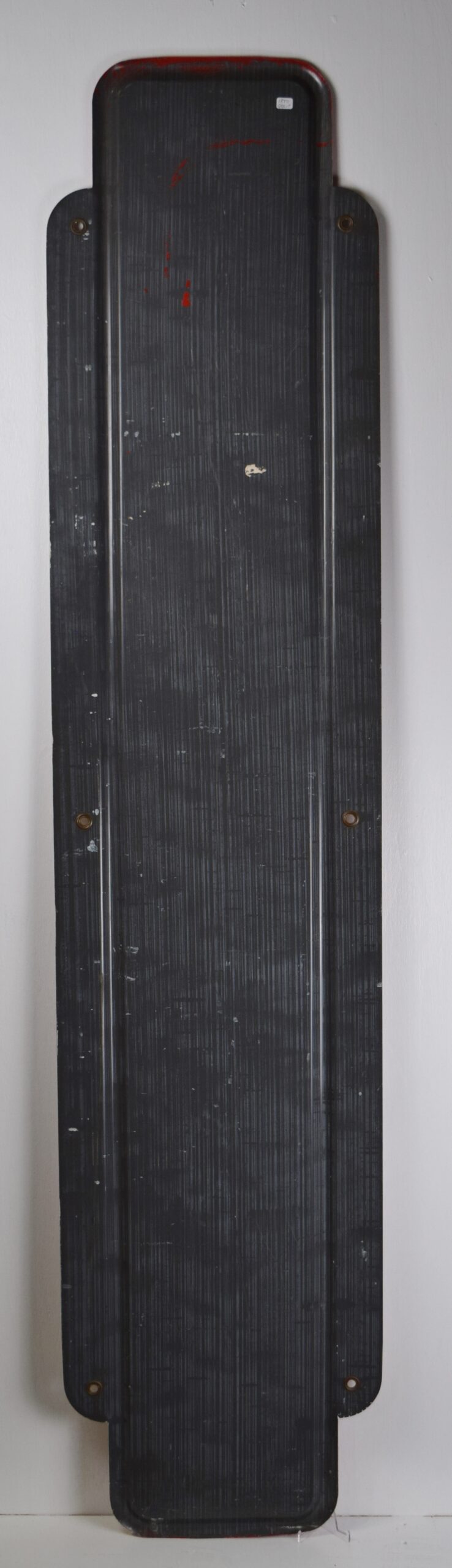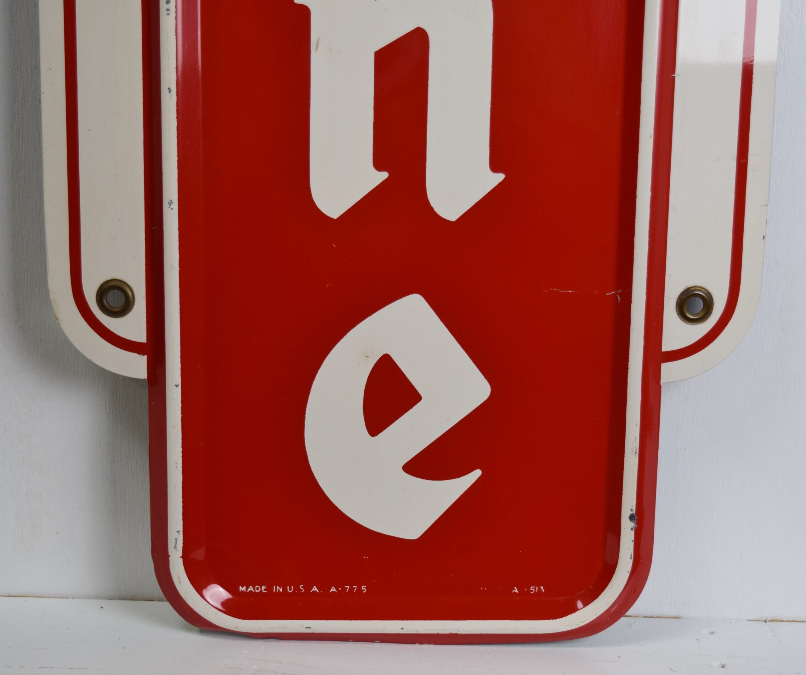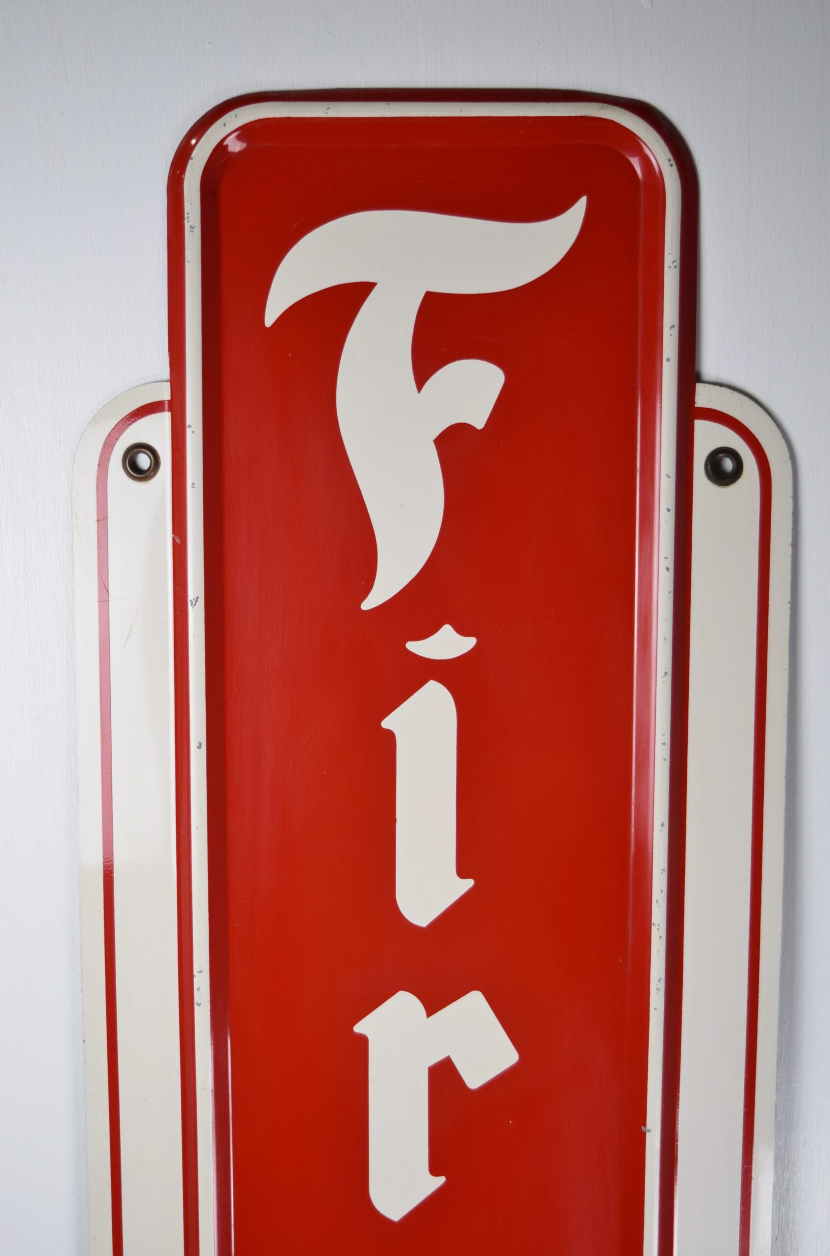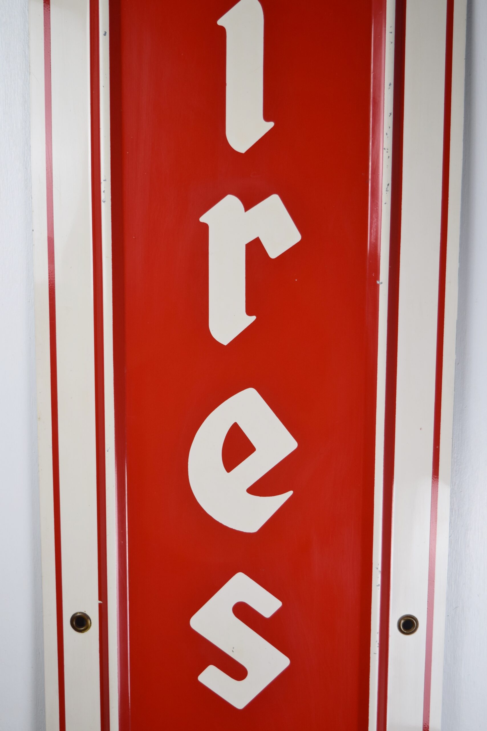 Large vertical signs were a great fit between service station garage doors, and many automotive related companies knew this! Everything from batteries, to oil, and tires were advertised on these narrow signs that were always over four feet tall and narrow! This one is very simple with white”Firestone” letters down the middle on a red background and white wings on each side. Around the center it is self framed, and the sides are die cut to give it that cool 1960’s fee. It is marked “Made In U.S.A. A-775” and “A-513” on the bottom of the sign. Some minor chipping has occurred on the self framed area in various places and a few small chips in the center of the sign. The six brass grommets are original and will easily hold the sign up nicely in your collection. On the bottom lip, a few small bends have occurred over the years. Many collectors love these signs because they are narrow and you can hang many of them together in on a small wall! Add this great one to your collection today! This item is larger than UPS will allow. Please contact us for shipping or delivery quote. 18771-QQWT