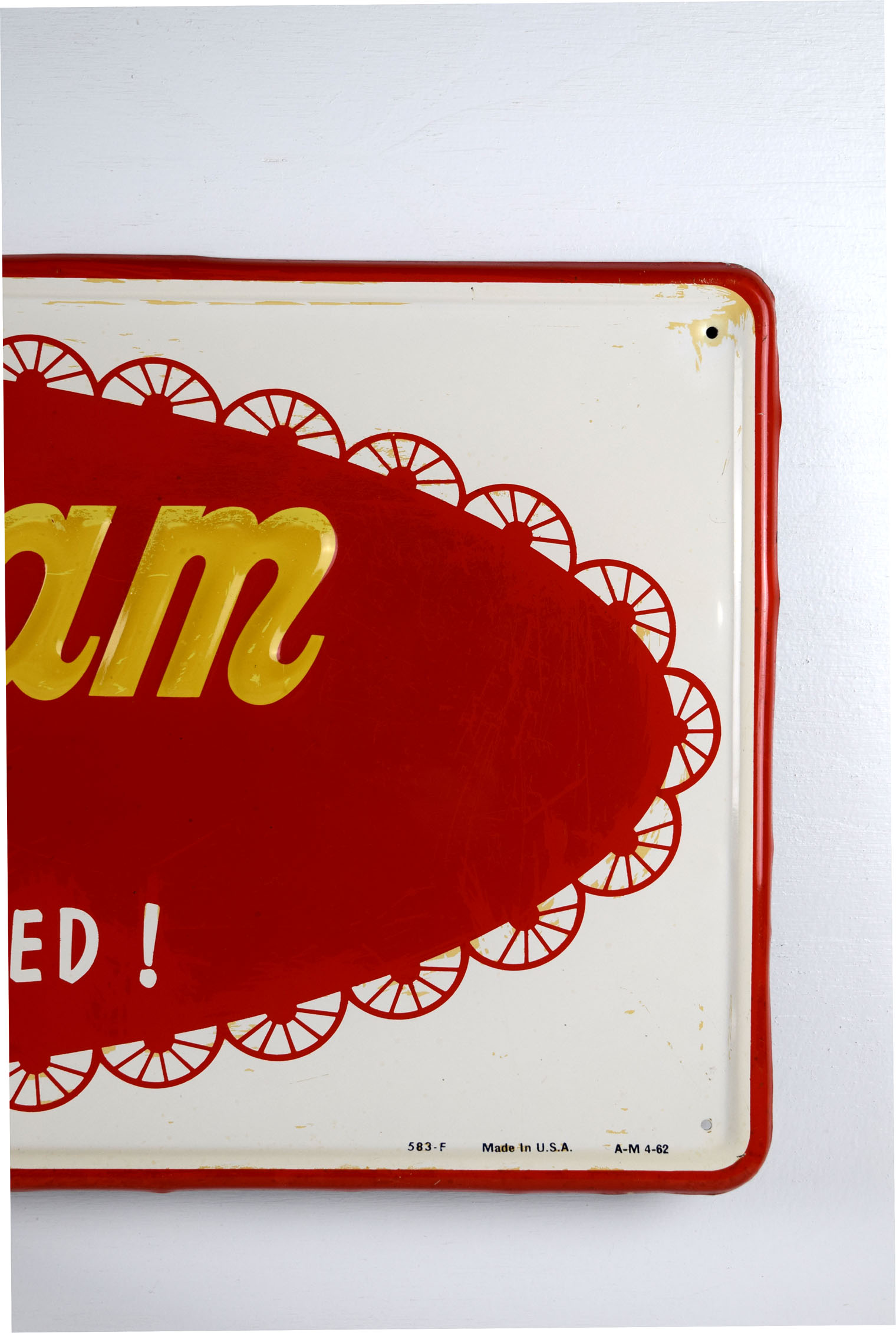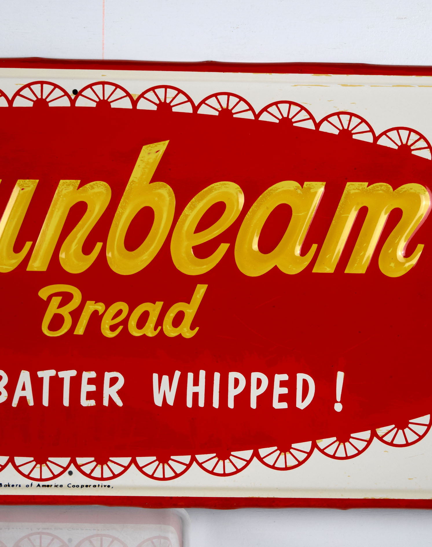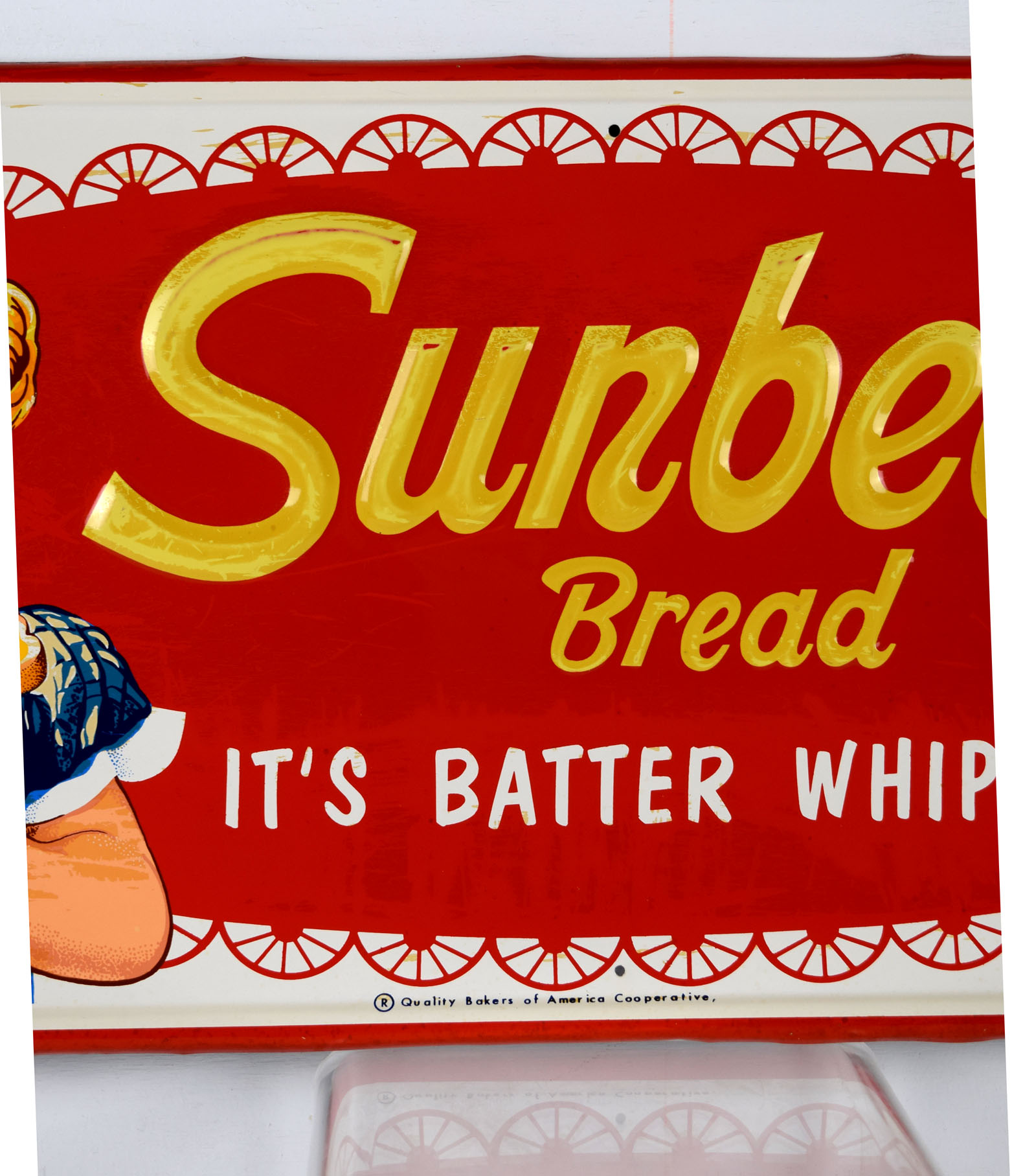 Sunbeam Bread signs seem to get rarer every time we see one, when we are lucky enough to see one! This one has the rare white background with the Sunbeam girl on the left and “It’s Batter Whipped” along with ‘Sunbeam Bread” on red. The face of the sign has some surface wear, probably from paper residue that someone tried to clean off. The outer self framing has some minor edge wear with some slight edge bends. The gloss looks amazing on this sign, and it has some great colors. It comes with authentication from The Authentication Company, number #037902, and is graded an 8 out of a possible 10. Don’t miss this one! 19497-QWYT