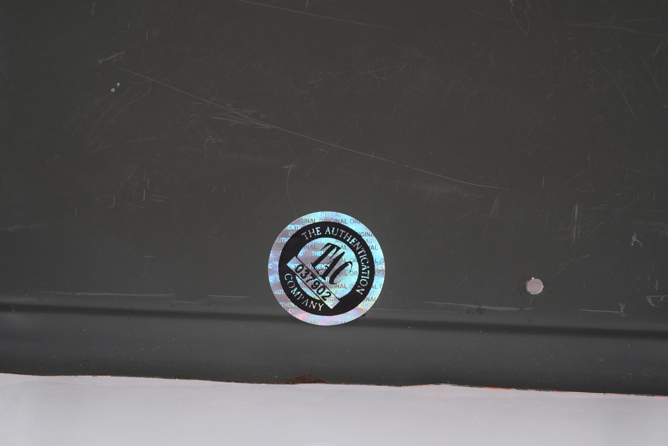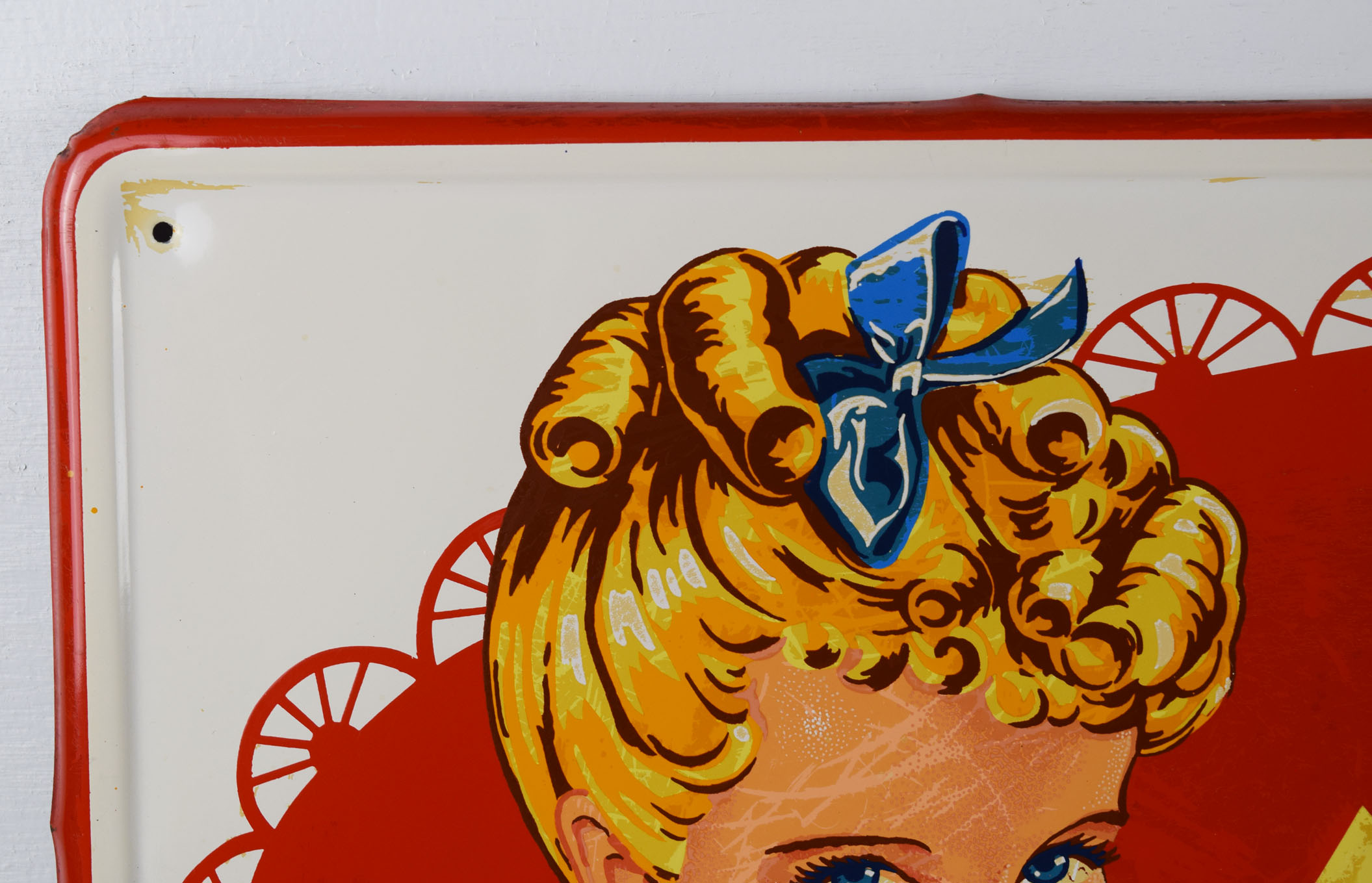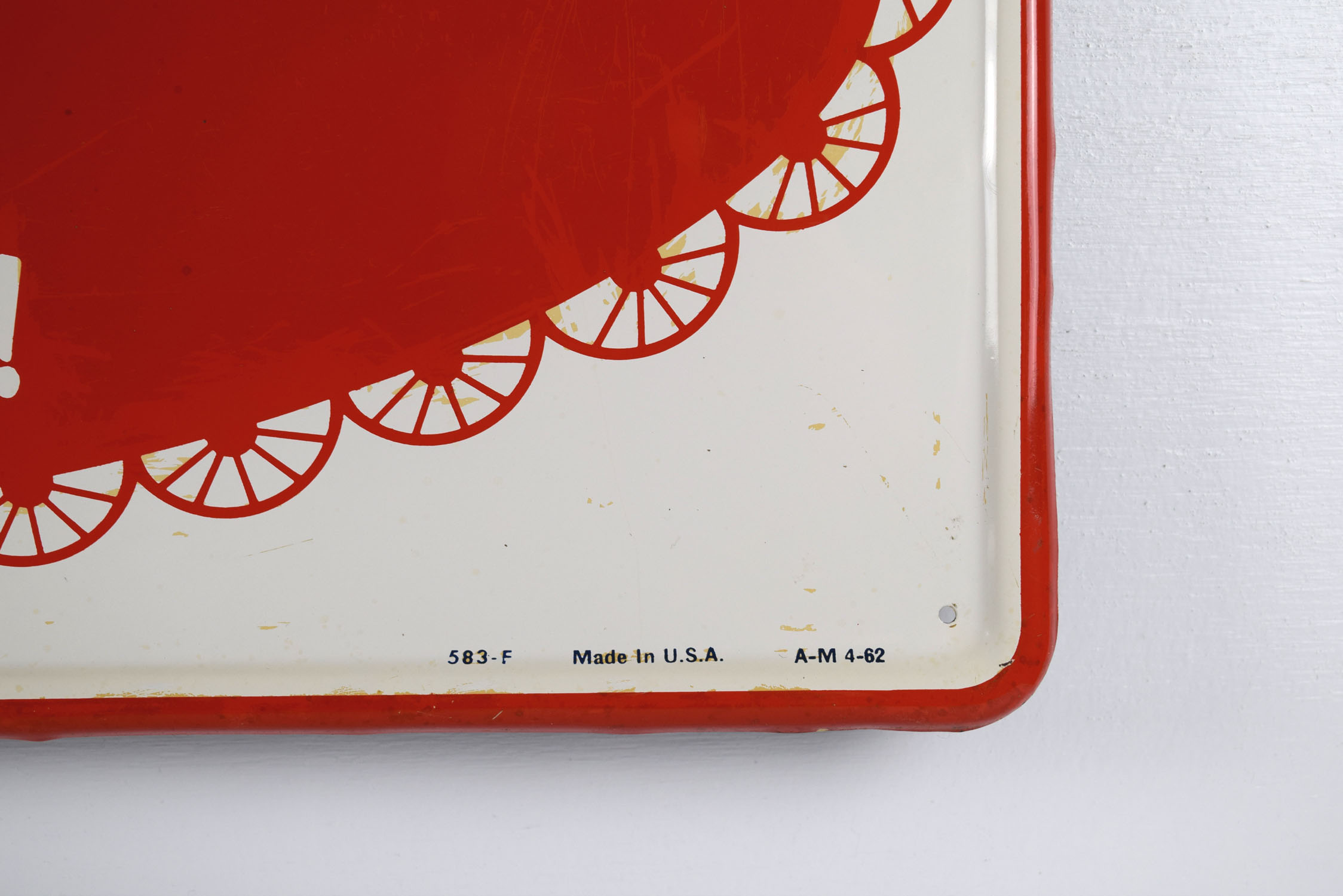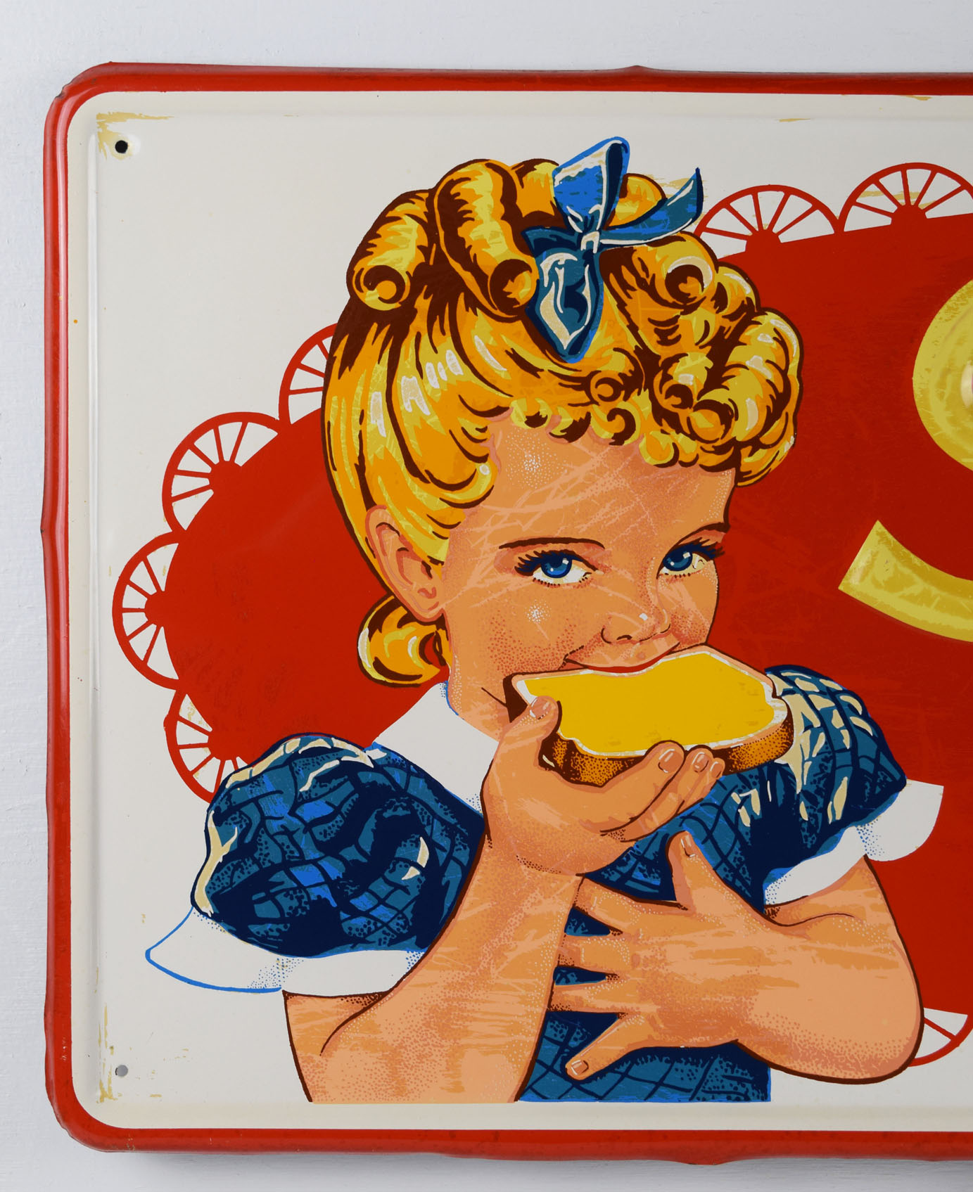 Sunbeam Bread signs seem to get rarer every time we see one, when we are lucky enough to see one! This one has the rare white background with the Sunbeam girl on the left and “It’s Batter Whipped” along with ‘Sunbeam Bread” on red. The face of the sign has some surface wear, probably from paper residue that someone tried to clean off. The outer self framing has some minor edge wear with some slight edge bends. The gloss looks amazing on this sign, and it has some great colors. It comes with authentication from The Authentication Company, number #037902, and is graded an 8 out of a possible 10. Don’t miss this one! 19497-QWYT