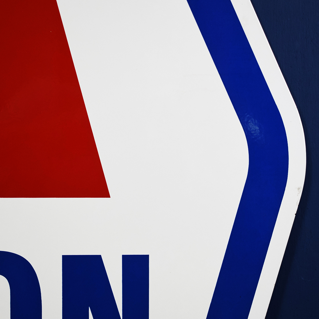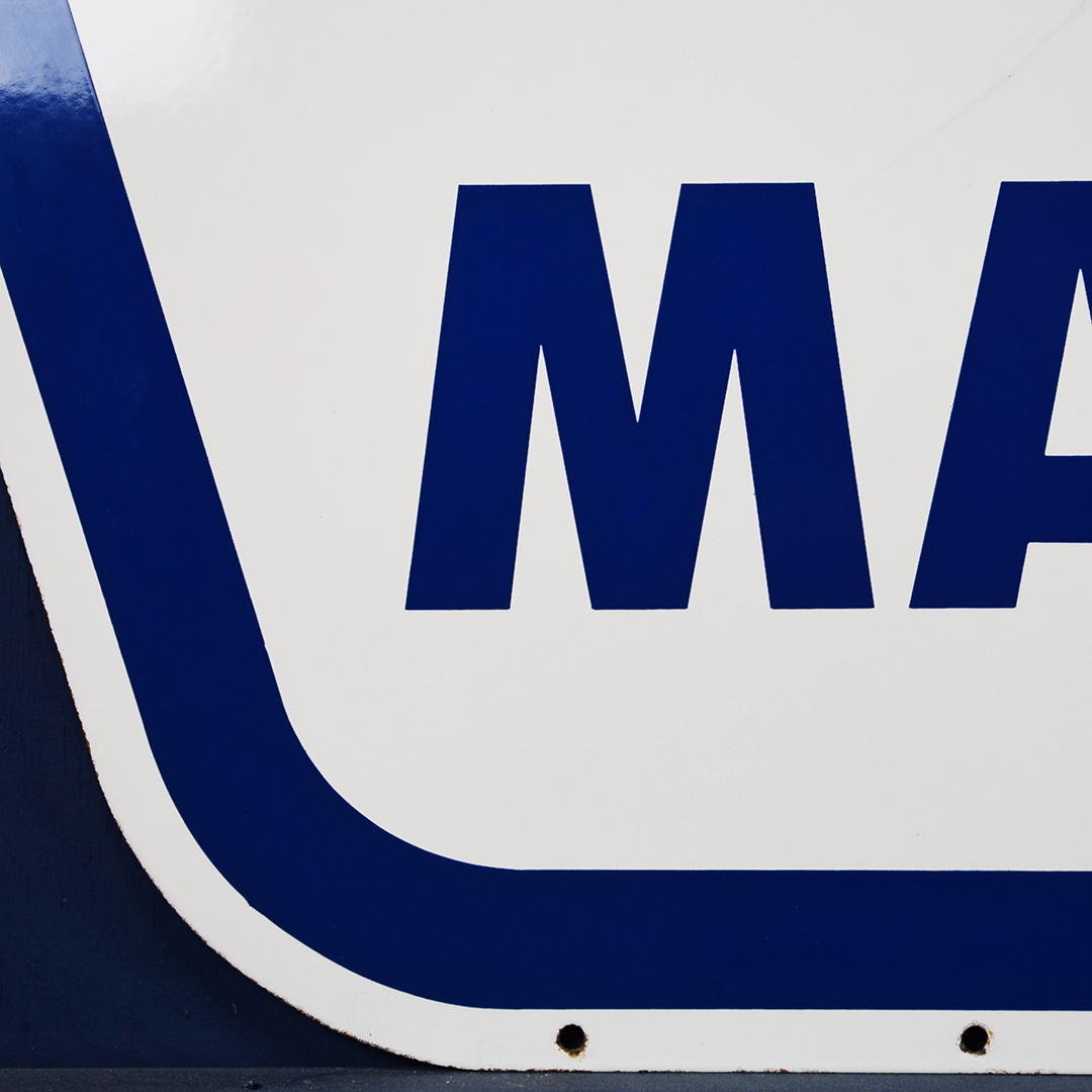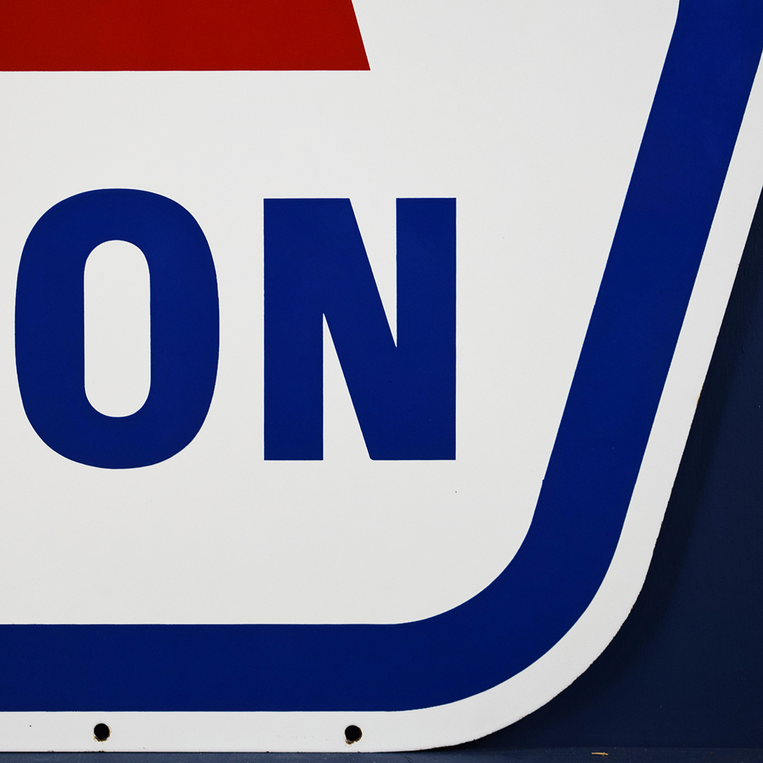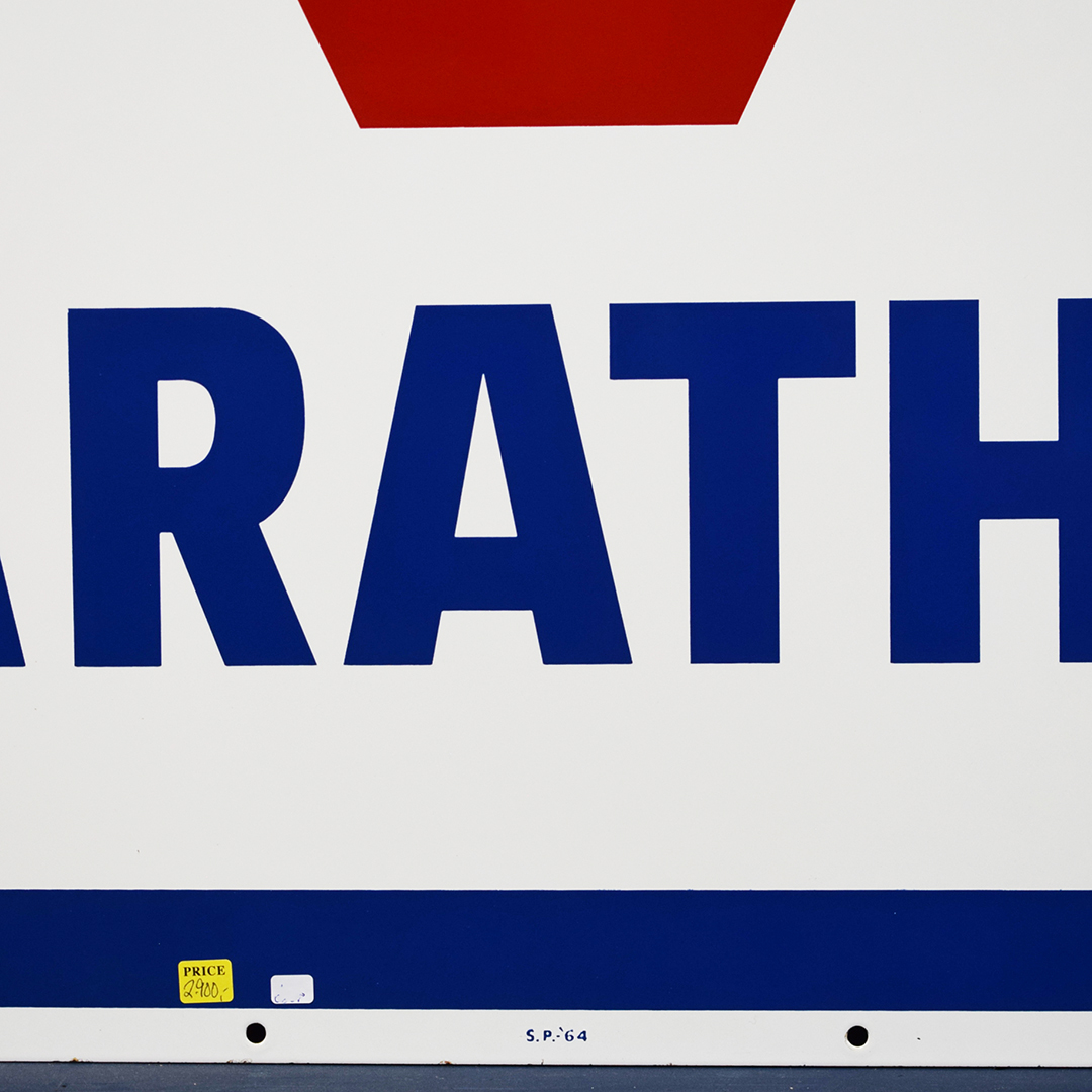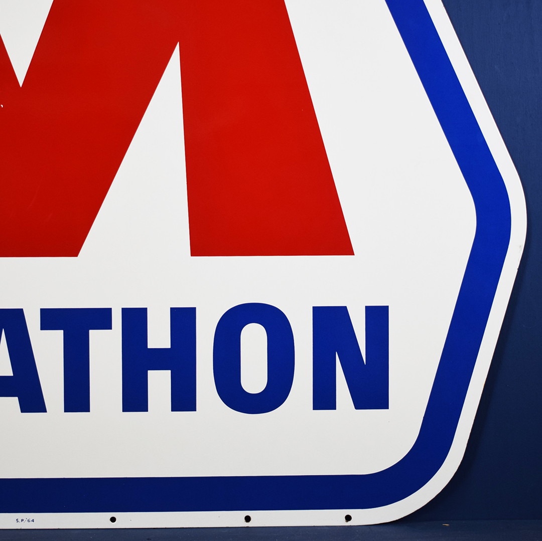 A welcome sign to see for weary travelers, Marathon gasoline stations were located throughout the Midwest. The simple design and eye-catching colors allowed customers to pick out the gas station location from afar, as this porcelain pole sign stood above the rest. It measures 46.75 inches high by 60 inches wide with an irregular hexagon shape. This sign features sharp colors and a beautiful gloss finish and is marked “S. P. – ’64” along the bottom edge. This denotes that S. P. Signs produced the sign in 1964. The face has two small chips in the red “M”, with a scratch below it. The backside is white, with a larger scratch. A few minor chips are around the outer edge as well. This sign is not a shippable item, but we can meet you at one of our shows. 21387-QUUP