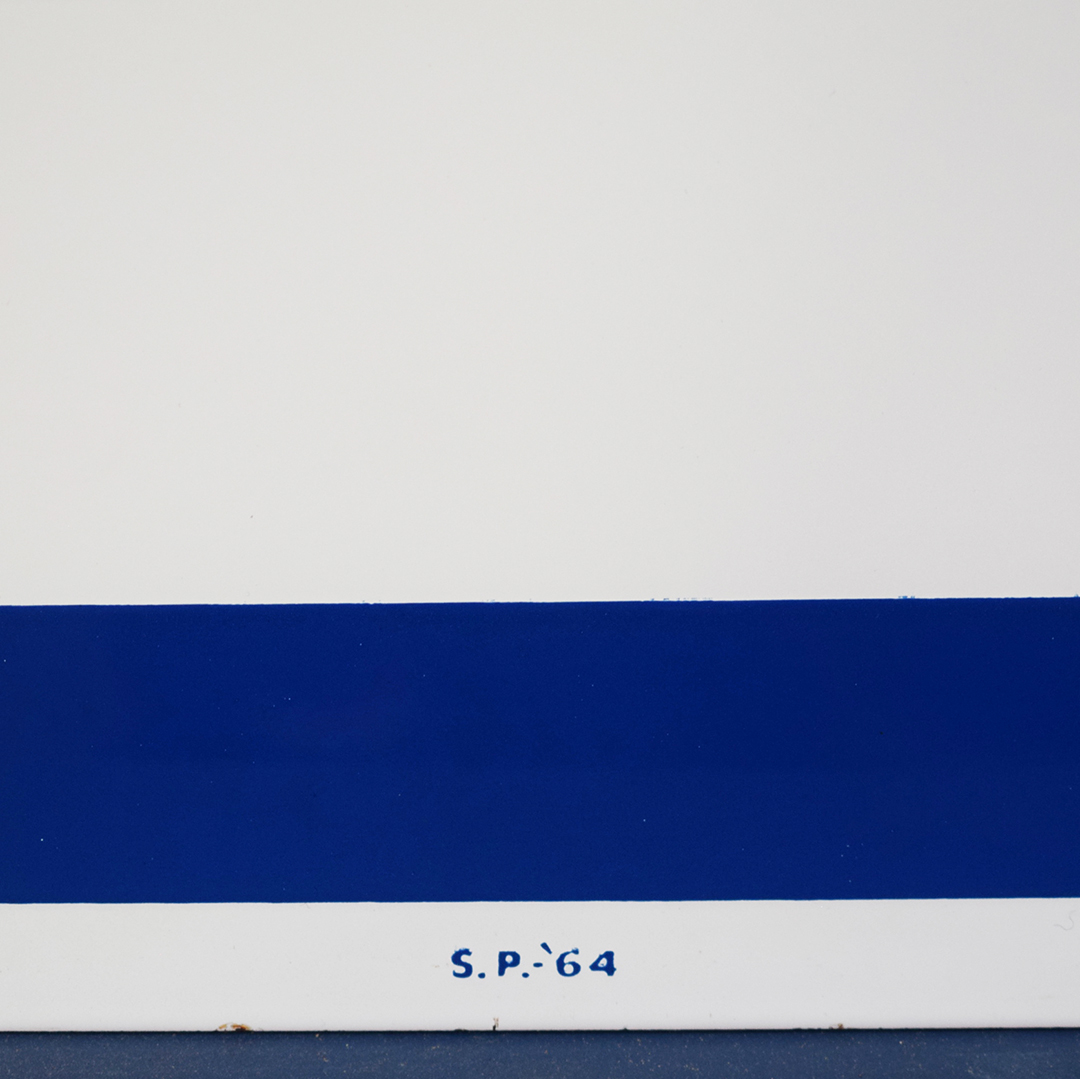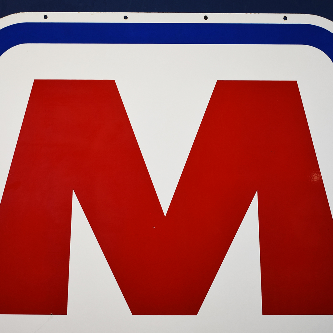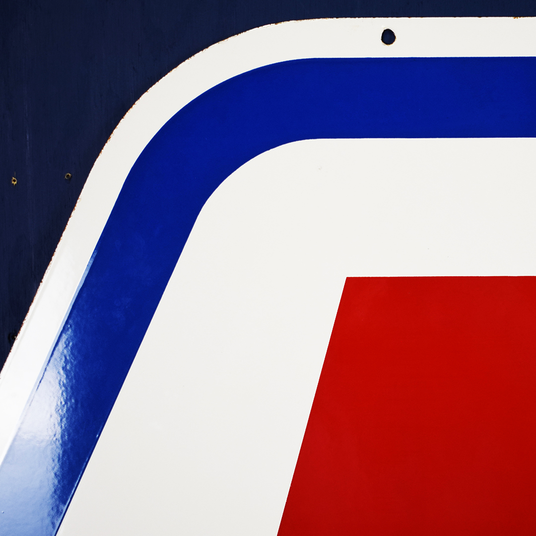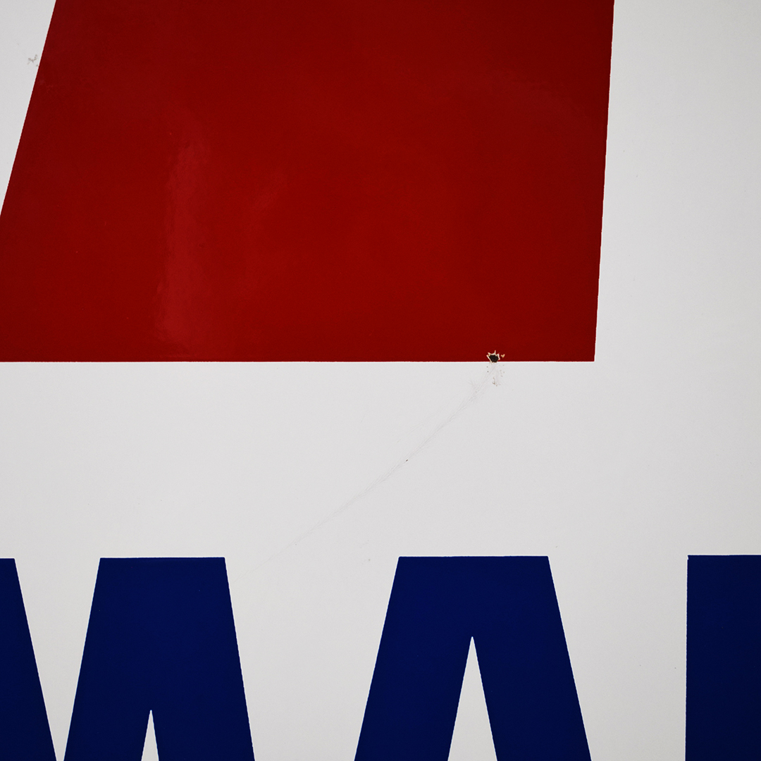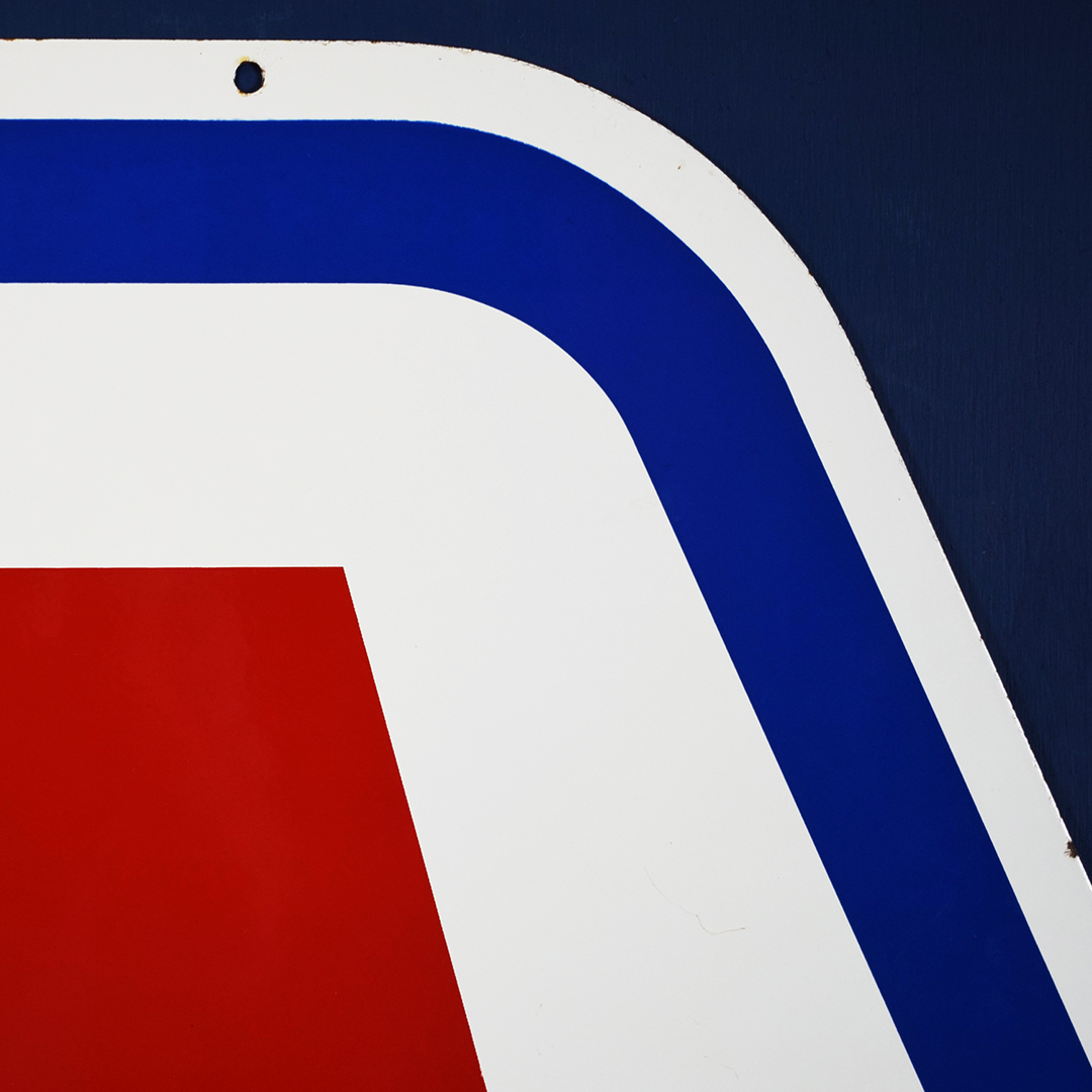 A welcome sign to see for weary travelers, Marathon gasoline stations were located throughout the Midwest. The simple design and eye-catching colors allowed customers to pick out the gas station location from afar, as this porcelain pole sign stood above the rest. It measures 46.75 inches high by 60 inches wide with an irregular hexagon shape. This sign features sharp colors and a beautiful gloss finish and is marked “S. P. – ’64” along the bottom edge. This denotes that S. P. Signs produced the sign in 1964. The face has two small chips in the red “M”, with a scratch below it. The backside is white, with a larger scratch. A few minor chips are around the outer edge as well. This sign is not a shippable item, but we can meet you at one of our shows. 21387-QUUP