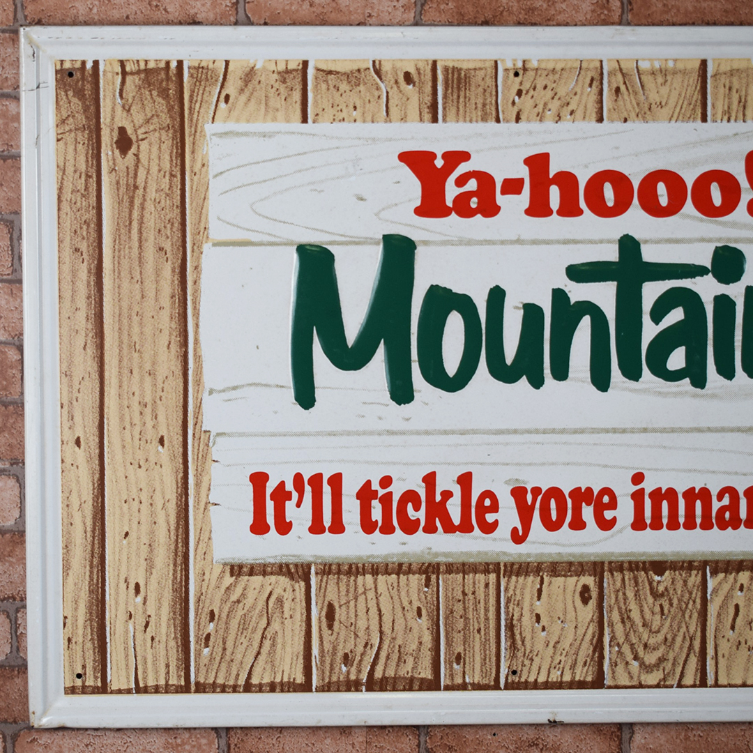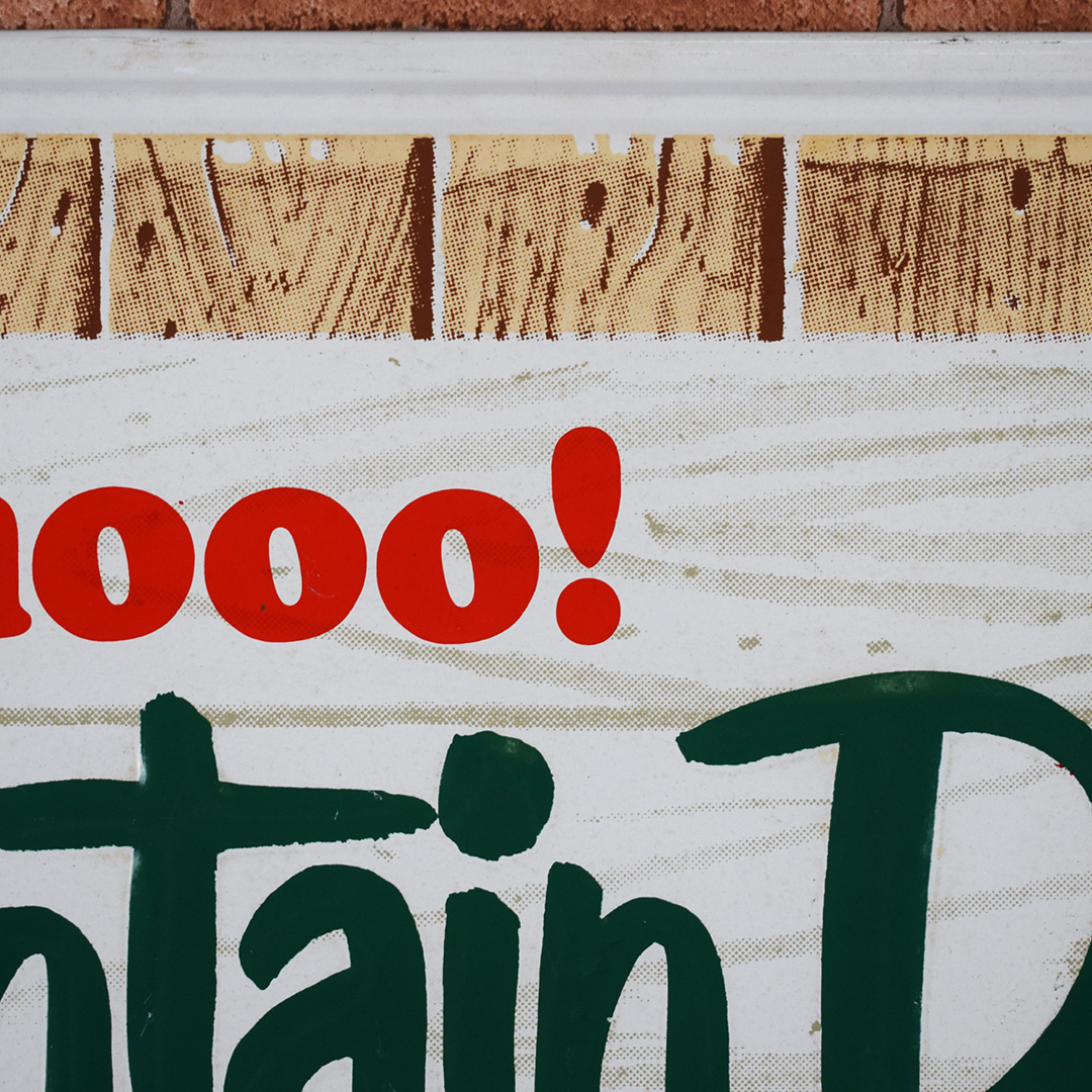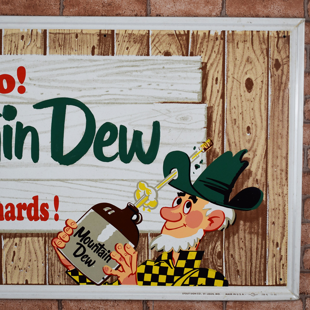 “It’ll tickle yore innards” is the famous slogan on this 1966 Mountain Dew embossed metal sign that is referred to by collectors as the Mountain Dew “Hillbilly” sign. It measures 17.25 inches tall by 35 inches wide, features a raised outer frame, and is marked “Stout Sign Co., St. Louis, MO.” along the bottom edge. It is also dated “11-66” on the same line, and features embossed “Mountain Dew” letters in the center of the sign. The center field of this graphic sign looks great, with sharp colors and a nice gloss. The outer self-framed edge has some light scratches with paint loss, along with a small wrinkle along the top edge. This will be a nice addition to your Mountain Dew collection! 21391-EURP
