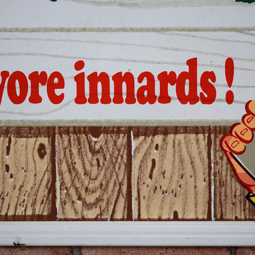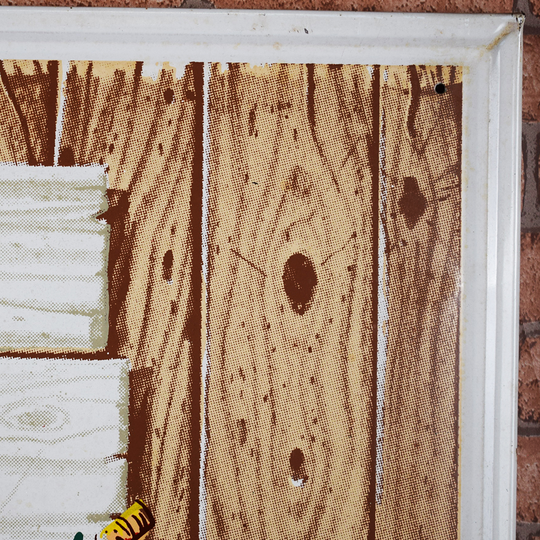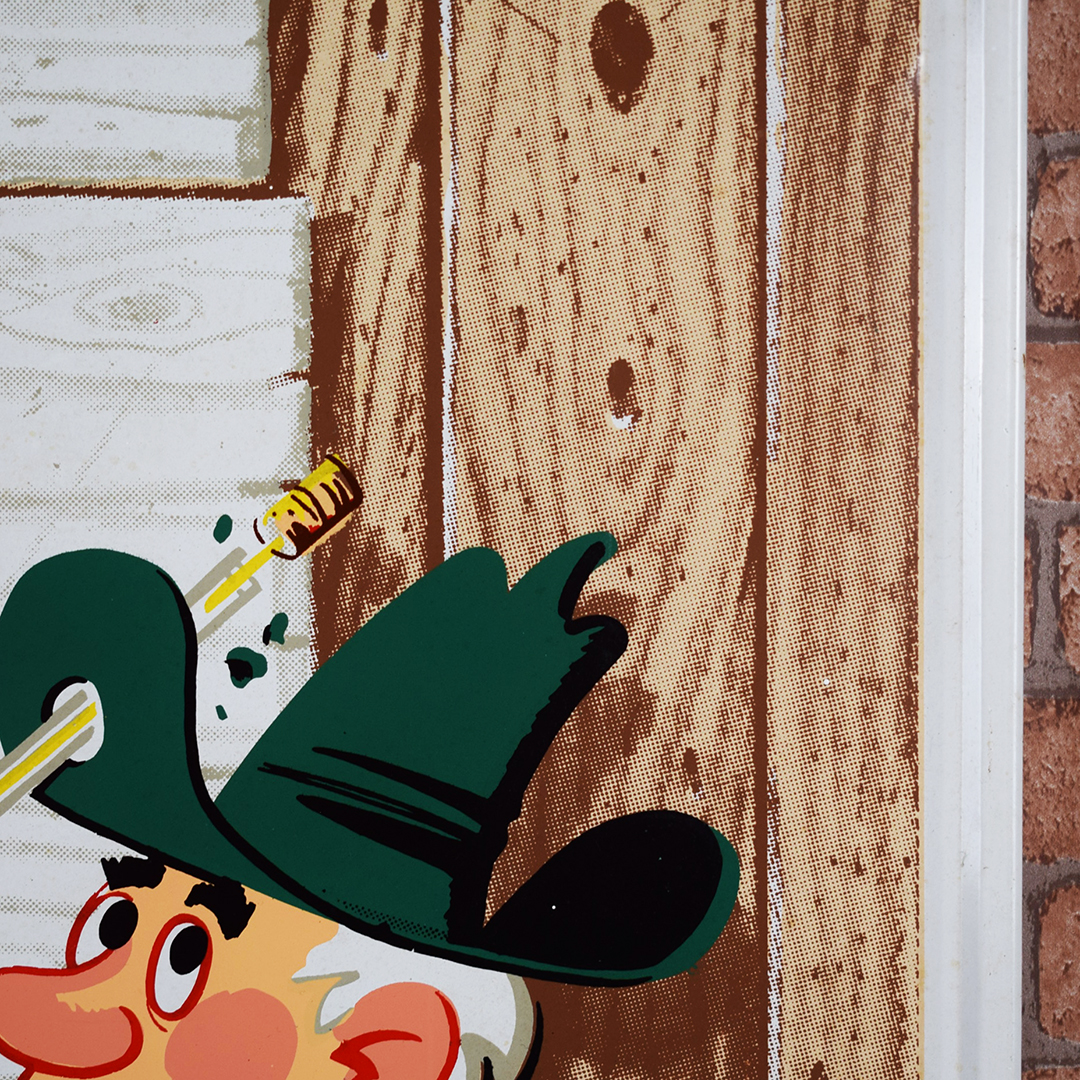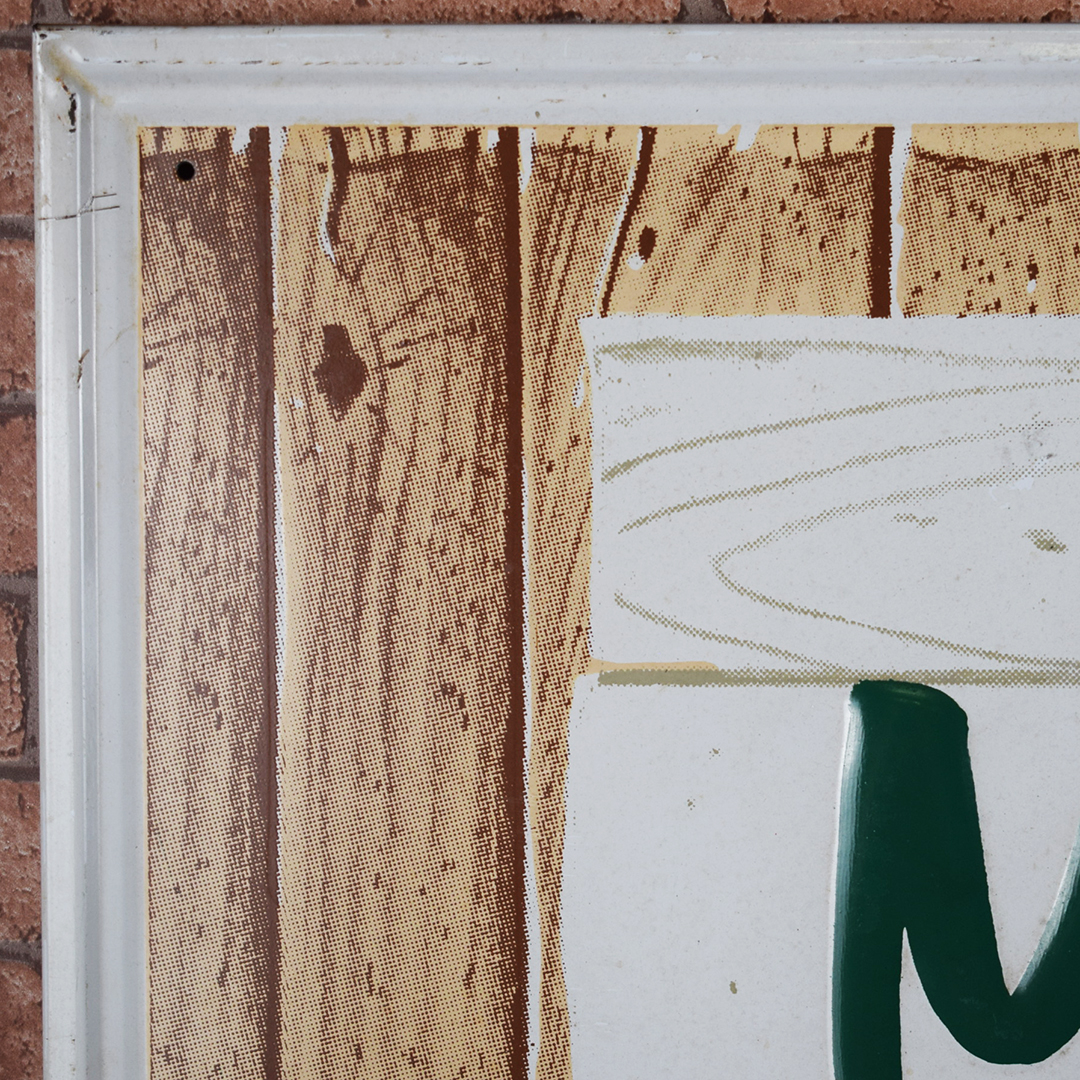 “It’ll tickle yore innards” is the famous slogan on this 1966 Mountain Dew embossed metal sign that is referred to by collectors as the Mountain Dew “Hillbilly” sign. It measures 17.25 inches tall by 35 inches wide, features a raised outer frame, and is marked “Stout Sign Co., St. Louis, MO.” along the bottom edge. It is also dated “11-66” on the same line, and features embossed “Mountain Dew” letters in the center of the sign. The center field of this graphic sign looks great, with sharp colors and a nice gloss. The outer self-framed edge has some light scratches with paint loss, along with a small wrinkle along the top edge. This will be a nice addition to your Mountain Dew collection! 21391-EURP