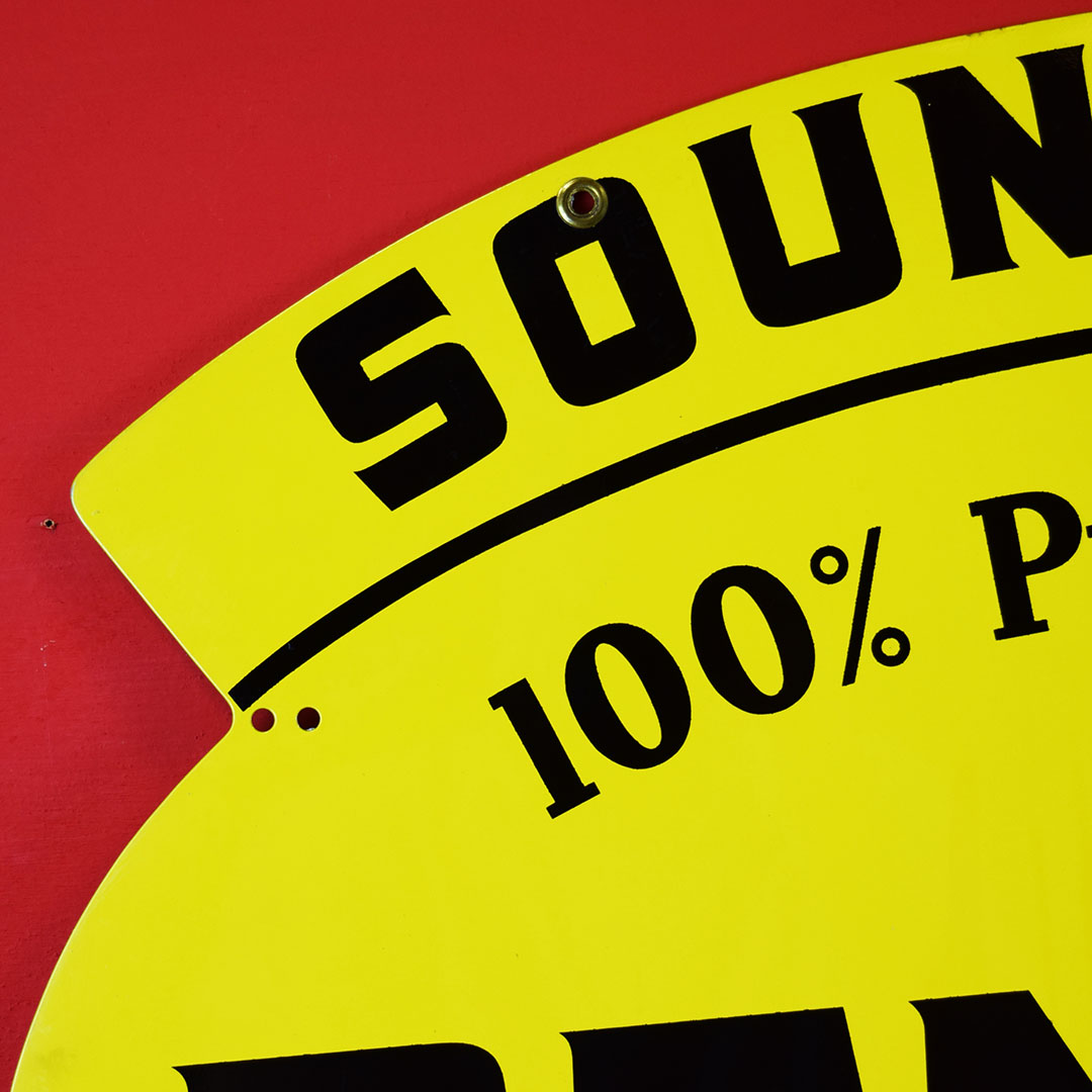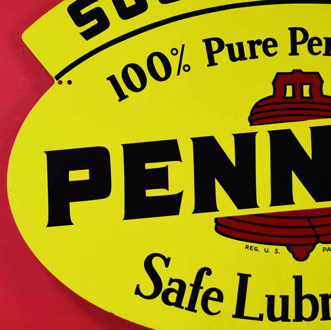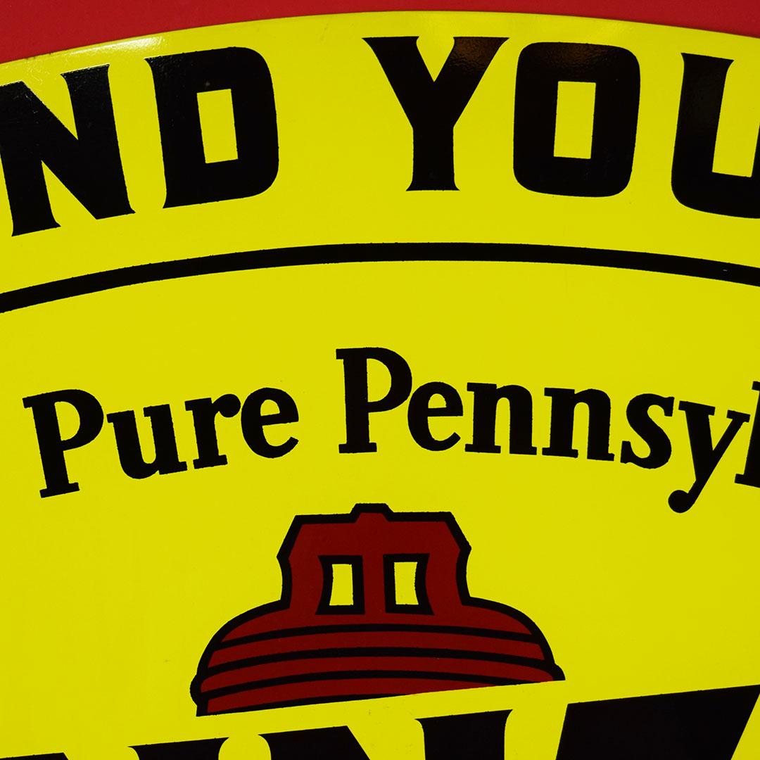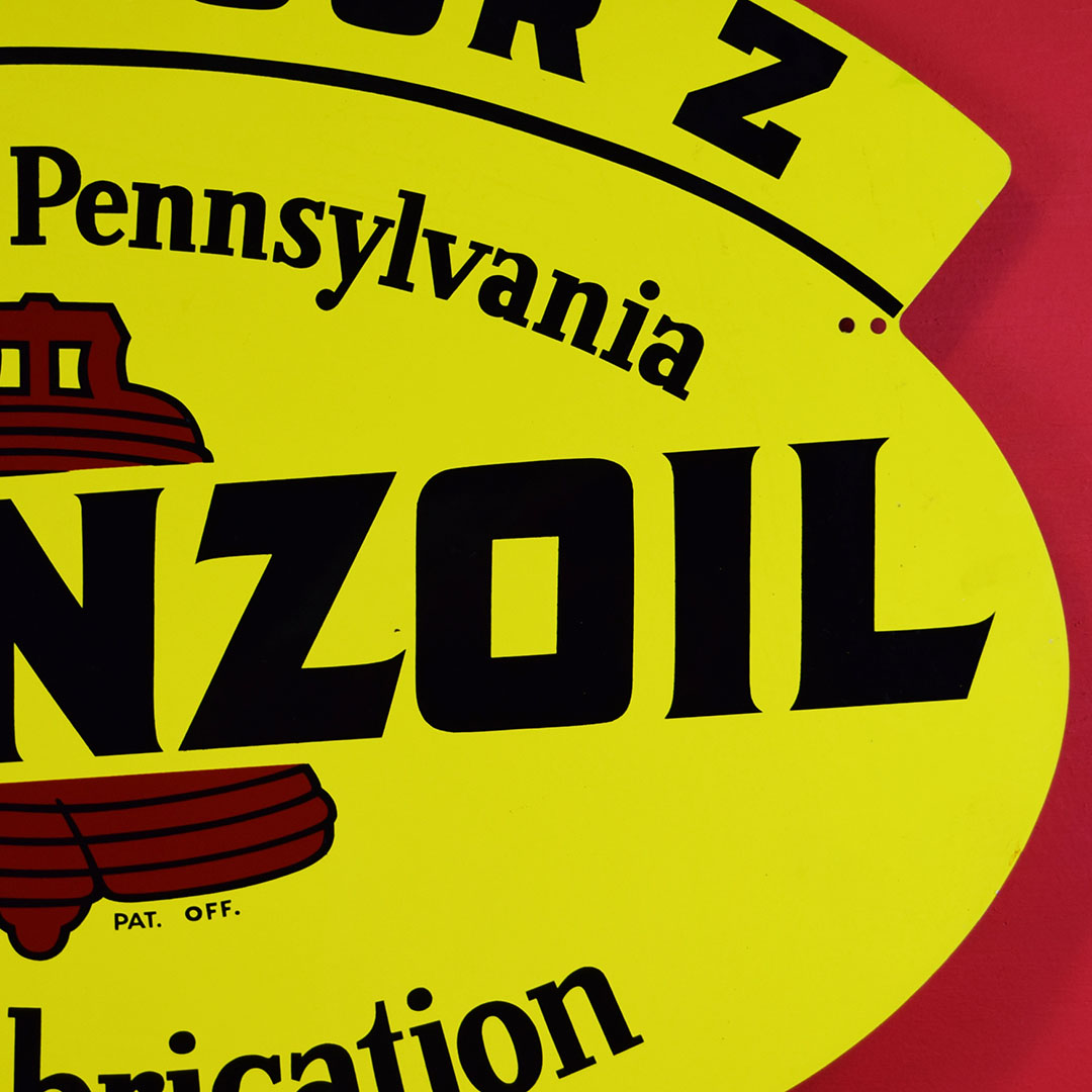 Designed to attract attention, this Pennzoil “Sound Your Z” metal sign is in absolutely fantastic shape and ready for your collection. Measuring 22 inches tall by 31 inches wide, it is marked “A-M 2-66” along the bottom edge. For new collectors, this marking designates this sign as being produced by the Allen-Morrison sign shop in Lynchburg, Virginia. The 2 designated the month of February, and the 66 meant 1966. Condition-wise, this sign has minor chips around the outer edge, along with two chips in the black Pennzoil letters on one side and a small chip in the yellow background on the other. The gloss is shiny on this large Pennzoil sign, which retains the original brass grommets along the top edge. 21054-UPP