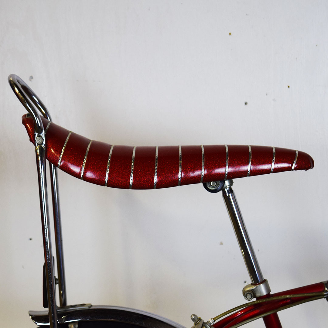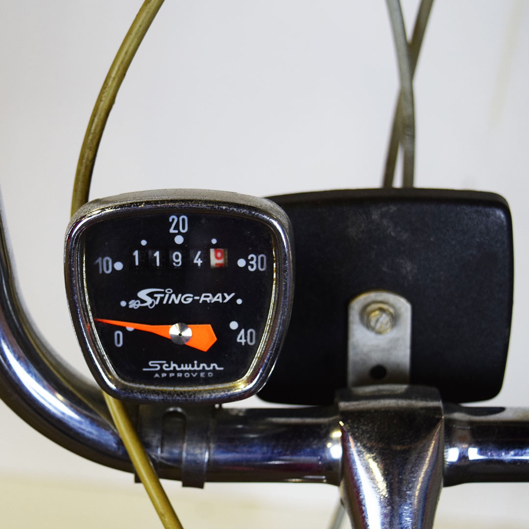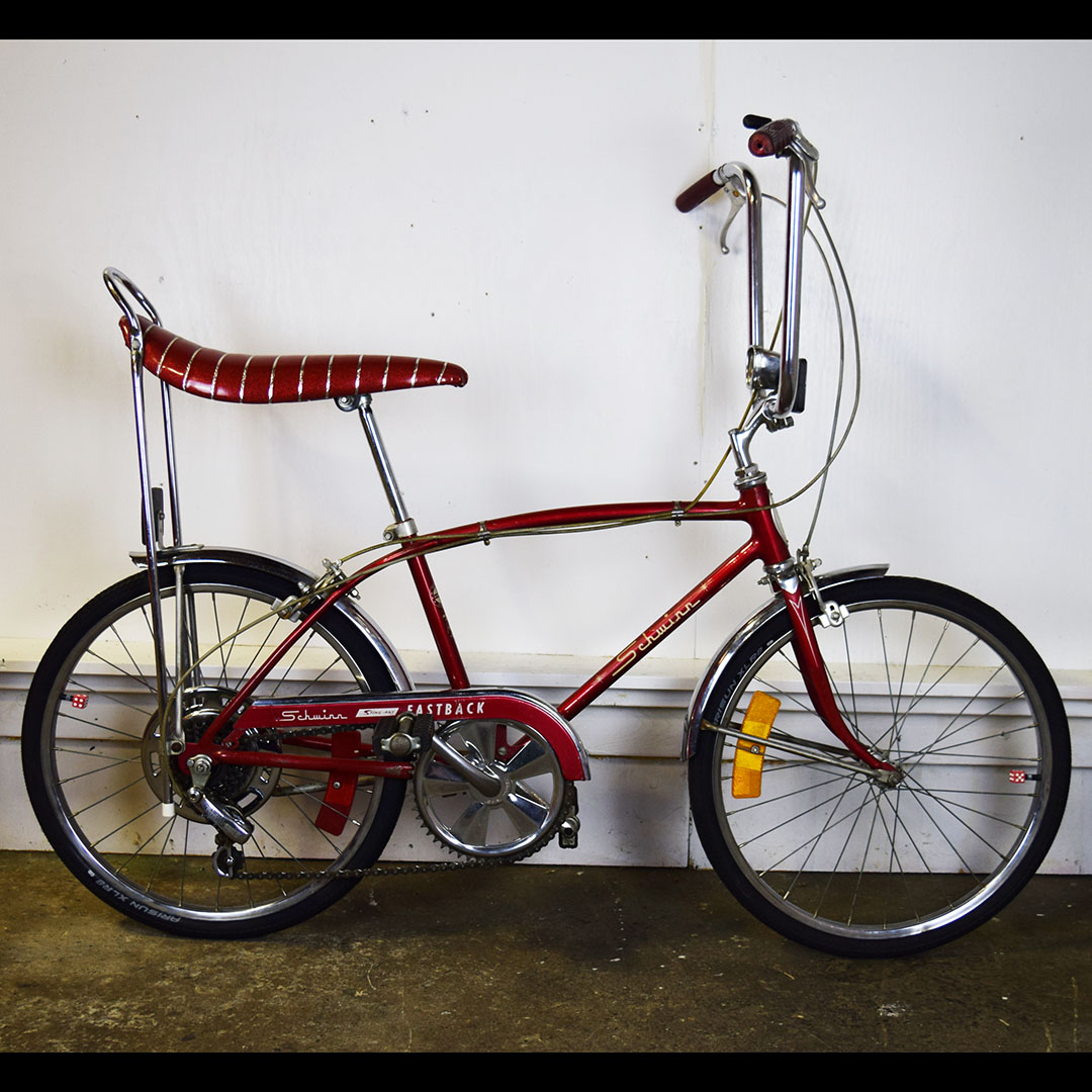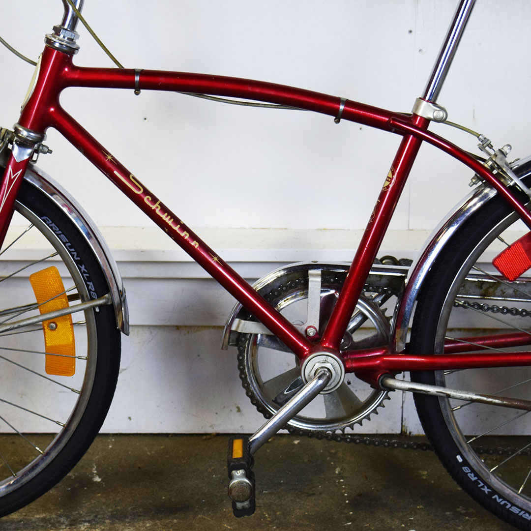 Just what every boy dreamed about, this 1974 Schwinn Sting-Ray is a super cool ride! This bike is painted in Opaque Red paint. The Deluxe edition has chrome-plated fenders, a bucket-style seat, a narrow line 20-inch front tire, and a Gripper rear tire. Everything on this vintage bicycle is original, from the rubber hand grips, the Sting-Ray speedometer, the 5-speed gearbox, and the banana seat. The paint looks excellent, with a minor touchup on the frame and front forks. Typical of use, some minor chips can also be seen in various places. Both the tires and tubes have been replaced, and it is ready to ride! Super great piece of nostalgia! 20078-QQQT