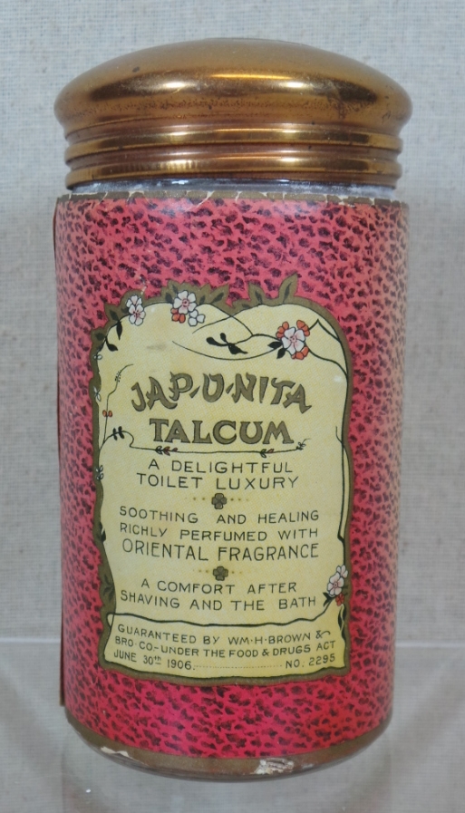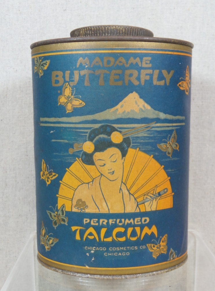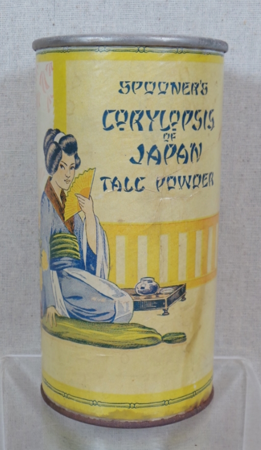 Three vintage Oriental talcum containers with great graphics and different looks! The Jap-U-Nita is a glass container with the original brass screw top. The paper label is very colorful and very nice, it is full and has the original tax stamp on the base. Made by Wm. A Brown & Bro-Co., Baltimore, Md, it measures 5” tall. The Madame Butterfly is a perfumed talcum made of tin with a colorful printed label. Made by Chicago Cosmetics Co. Chicago, it is an oval type can with the same graphic on both sides. The top has some discoloration, but the paper label is in wonderful condition and is 5.5” tall. The third is a paper cardboard round container, made by Spooner’s Corylopsis of Japan. The label has a lovely oriental lady sitting with her fan and measures 6” tall. The cardboard back does have a thumb print bend in back. All three look lovely on a shelf, and would be lovely in your bathroom or bedroom. 1015-RT