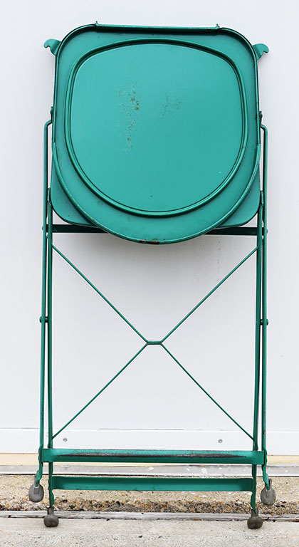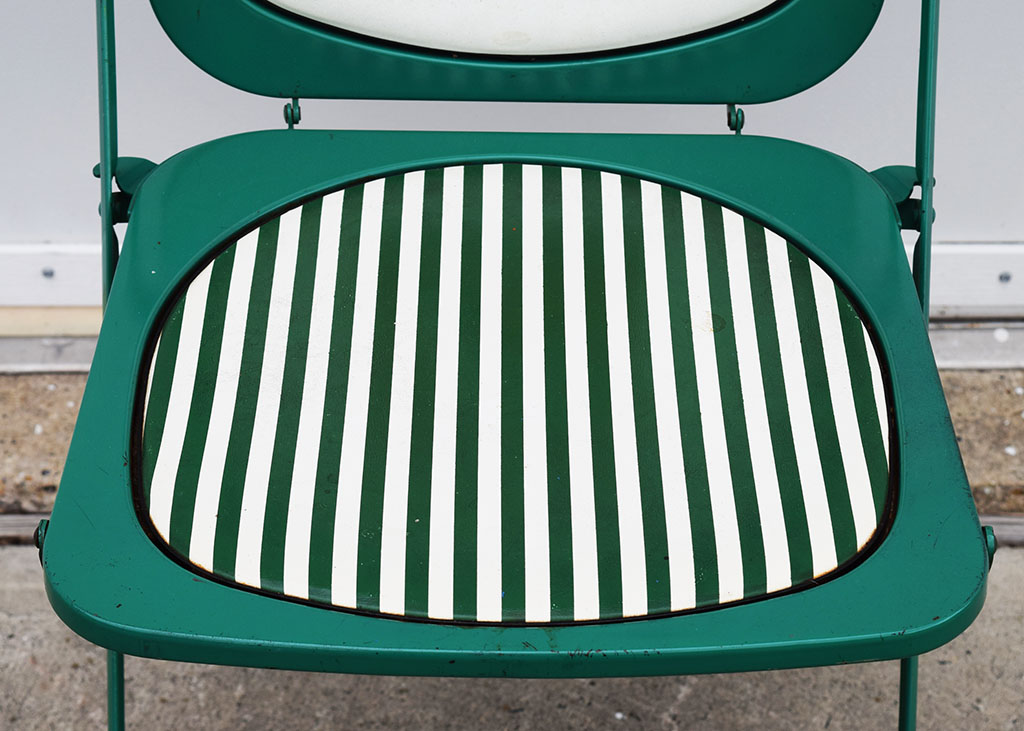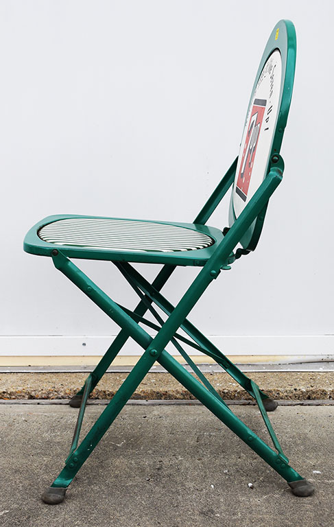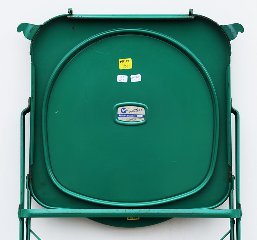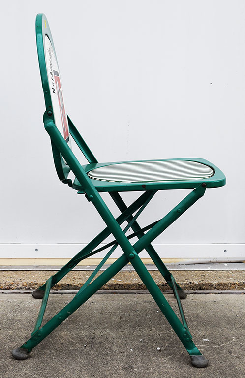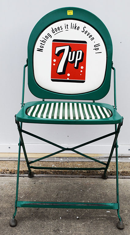 This rare 7UP folding chair is ready and waiting for you to add to your soda fountain! Appearing in new old stock condition, this great looking chair has been authenticated by The Authentication Company, TAC# 024803, and carries a 9.0 rating. This chair features shiny green paint, a padded vinyl seat, and the 7UP vinyl back which reads “Nothing does it like Seven Up!” The Brewer-Titchener Corp produced these Hostess chairs plain and also for soda companies in the 1950’s for soda fountains. Pepsi Cola, Royal Crown Cola, and 7UP were among the sodas that were featured on these folding chairs. In excellent shape, it shows just the smallest amount of wear where it folds, with some paint loss on the top of the curved back, and it even has the original rubber feet on the legs! 20361-YOP