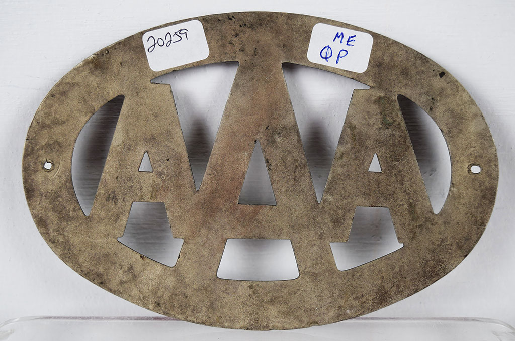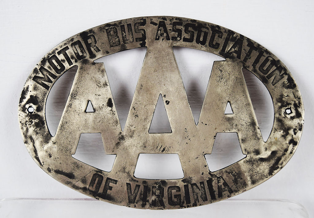 Measuring four inches tall by six inches wide, this oval Motor Bus Association of Virginia AAA badge is made of aluminum and was used to let other drivers know they were a triple A member. Some wear over the years can be seen, along with some small bends. Great patina on this vintage piece! 20259-QP