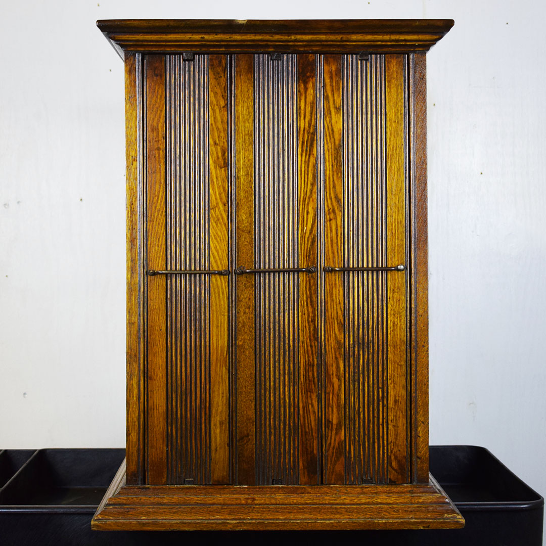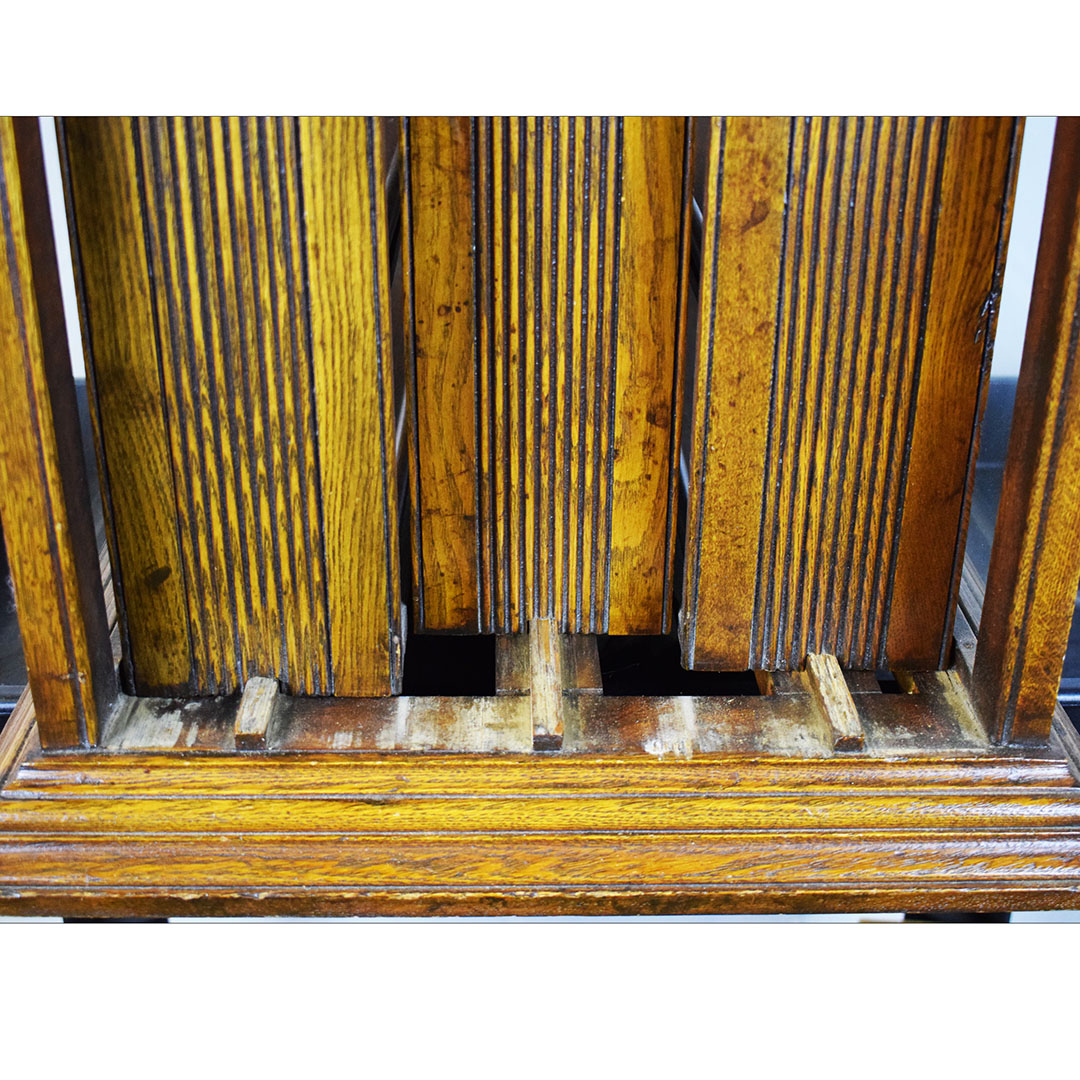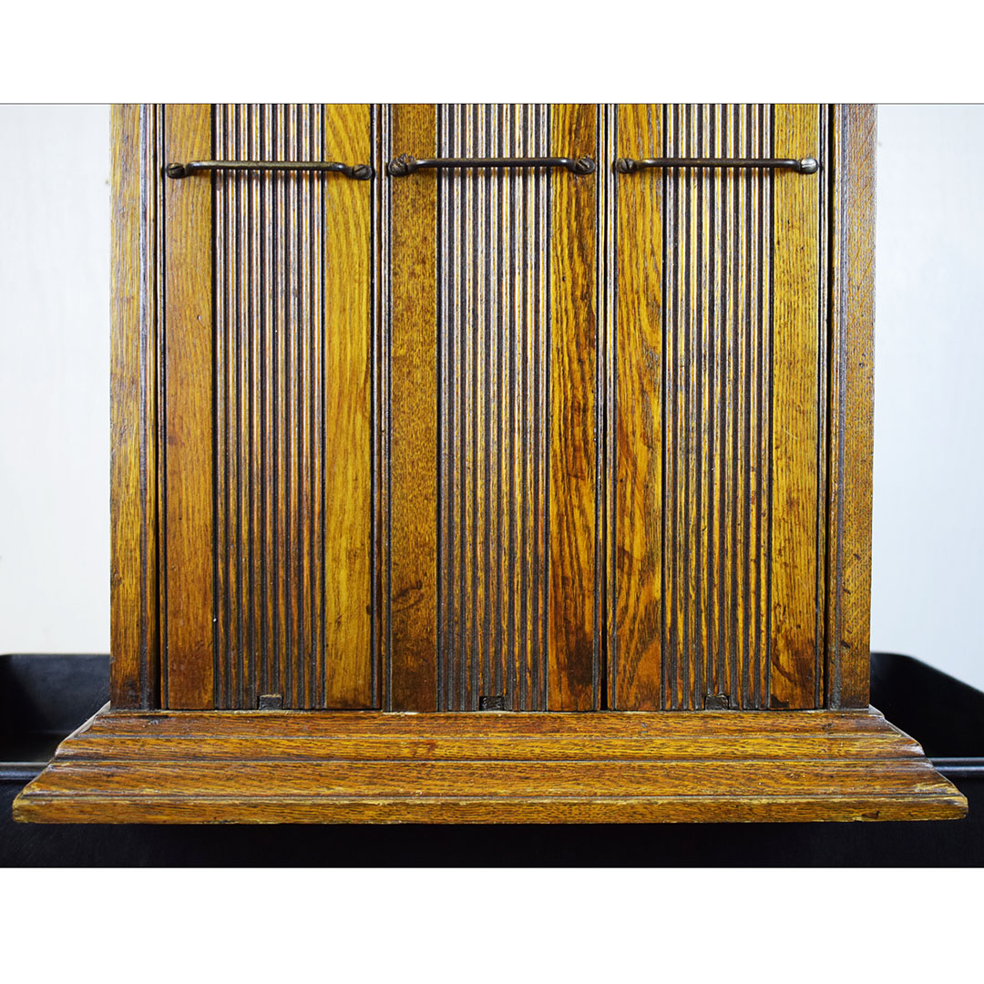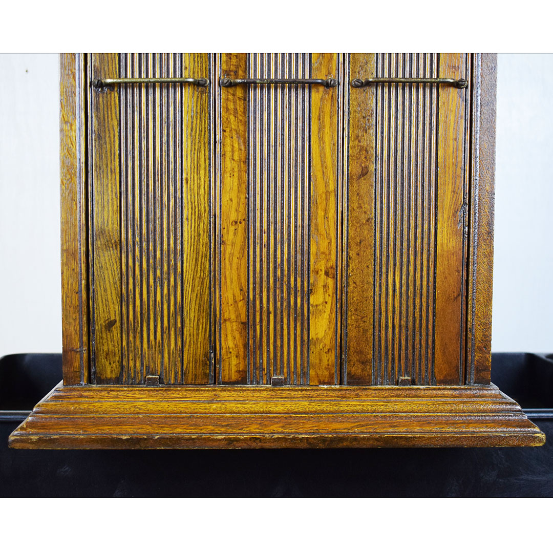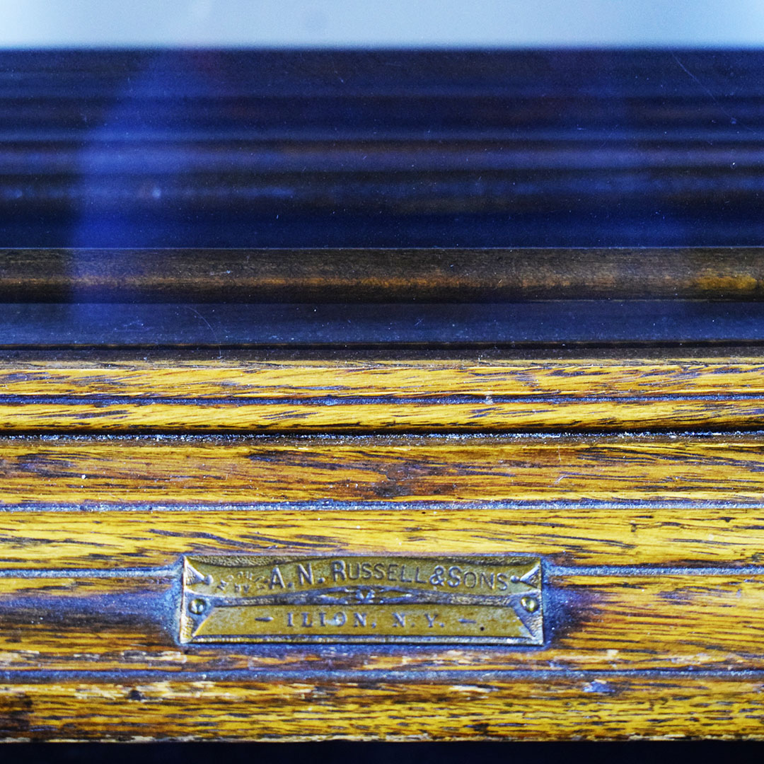 A. N. Russell & Sons designed ribbon cabinets that allowed general stores to display ribbons for sale. This oak cabinet measures 18 inches wide, 25.75 inches tall, and 29 inches long. The beautiful oak wood is impressive, with intricate detail throughout. The front and back feature plate glass, which allows customers to see which ribbons are in stock and ready to purchase. The three sliding middle sections set this piece apart from other ribbon cabinets. Horizontal handles are attached to the wooden drawers, allowing the customer to open the sections from either side easily. Each section has four shelves measuring 3 inches wide. The engraved plate on the front reads “A. N. Russell & Sons,” and “Ilion, N. Y.”. Some light scratches are on the wood finish, and a small dent in the top. 21210-TWT