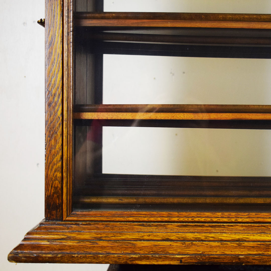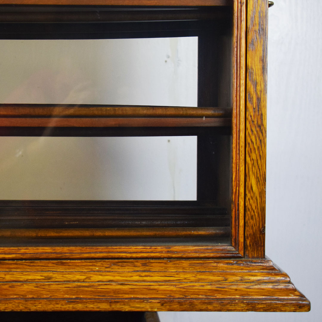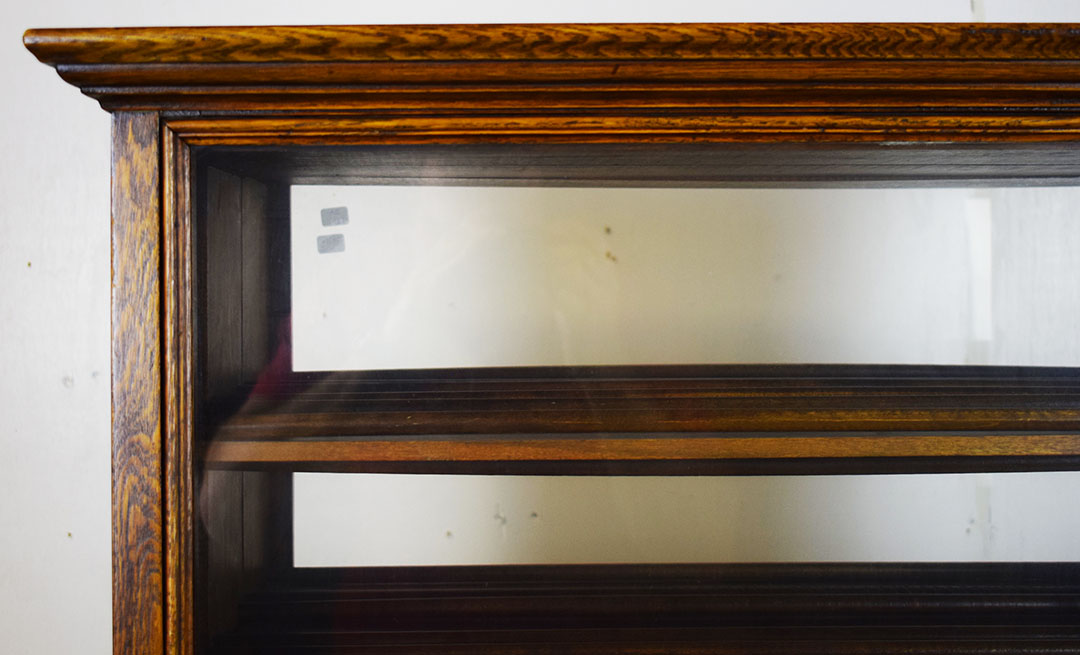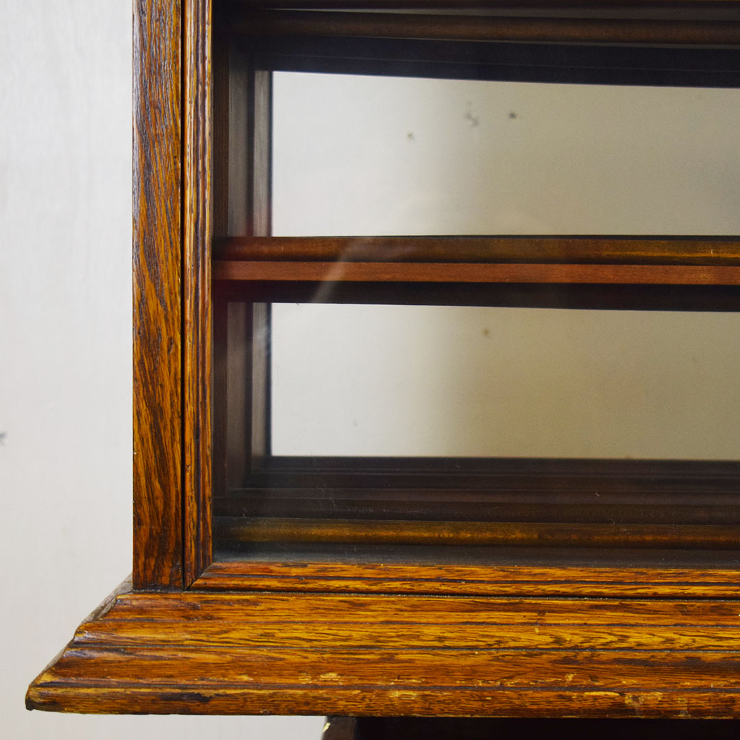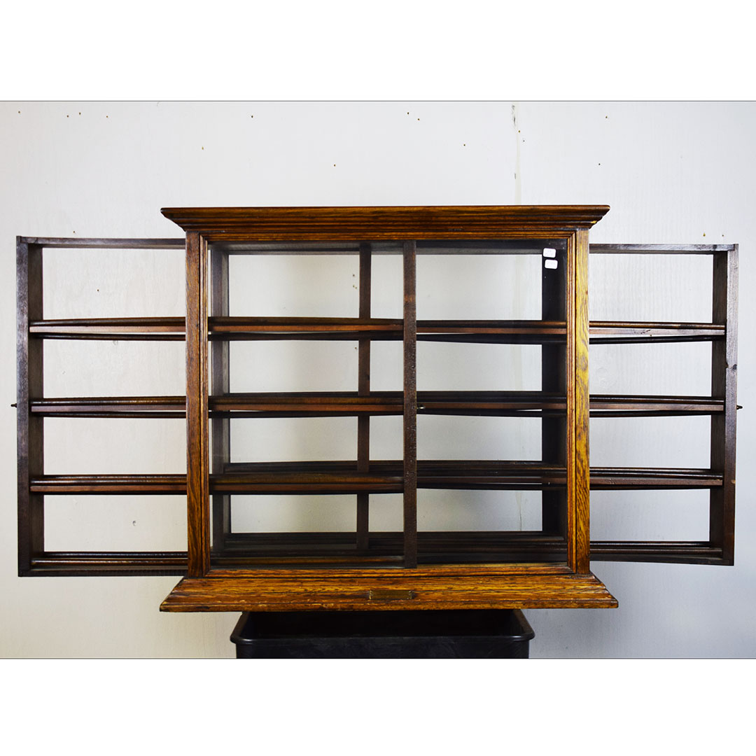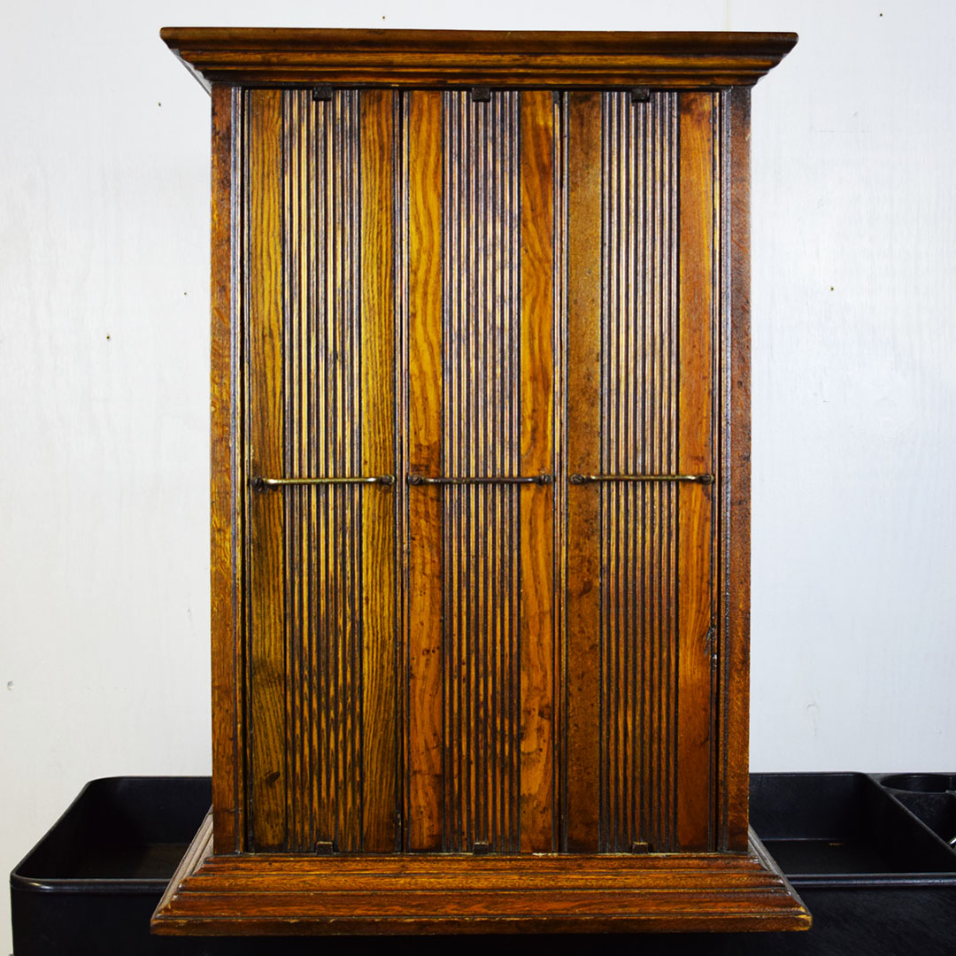 A. N. Russell & Sons designed ribbon cabinets that allowed general stores to display ribbons for sale. This oak cabinet measures 18 inches wide, 25.75 inches tall, and 29 inches long. The beautiful oak wood is impressive, with intricate detail throughout. The front and back feature plate glass, which allows customers to see which ribbons are in stock and ready to purchase. The three sliding middle sections set this piece apart from other ribbon cabinets. Horizontal handles are attached to the wooden drawers, allowing the customer to open the sections from either side easily. Each section has four shelves measuring 3 inches wide. The engraved plate on the front reads “A. N. Russell & Sons,” and “Ilion, N. Y.”. Some light scratches are on the wood finish, and a small dent in the top. 21210-TWT