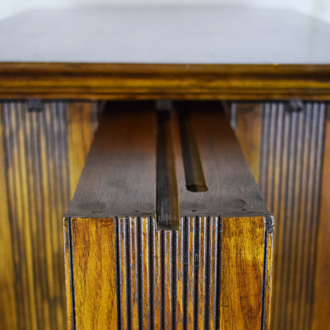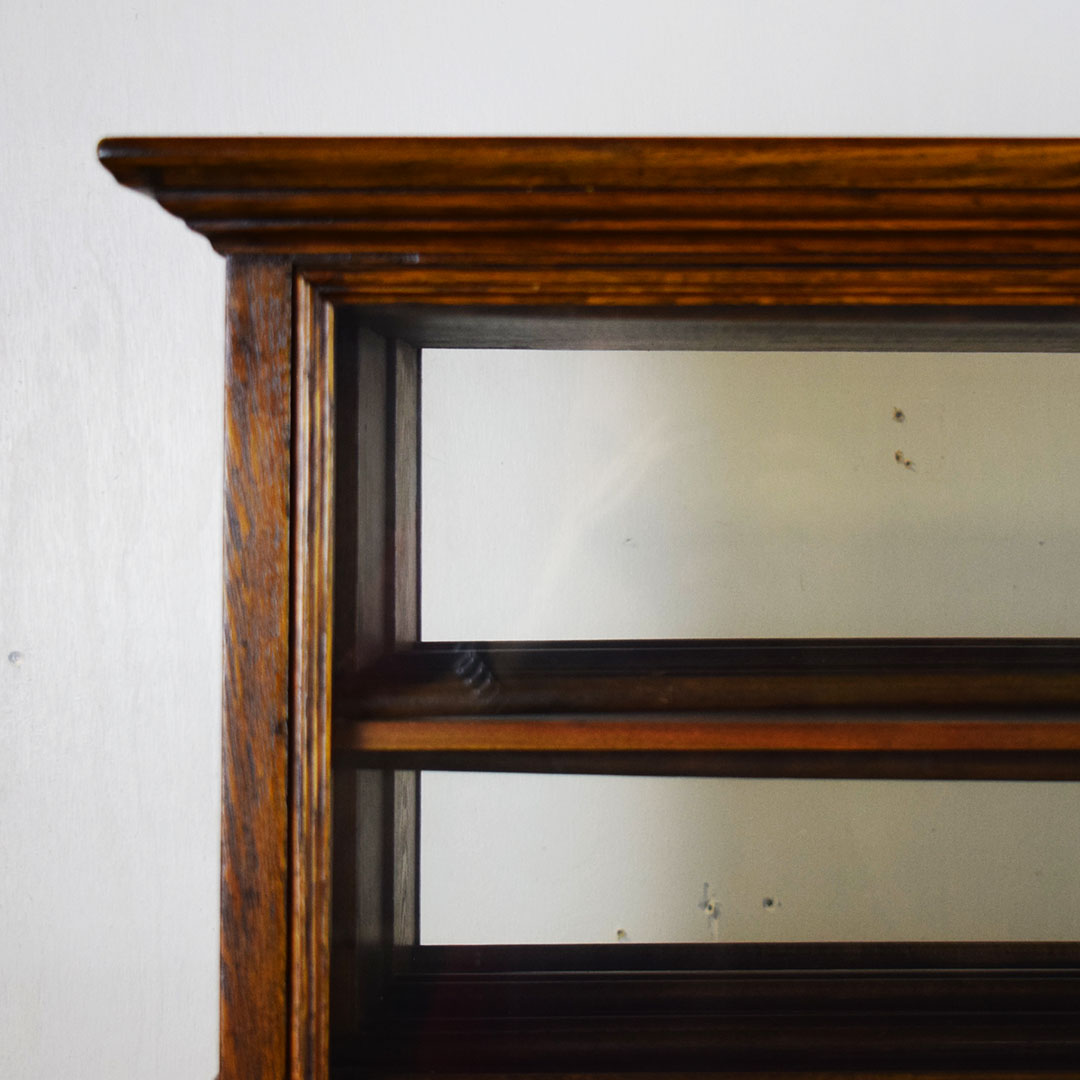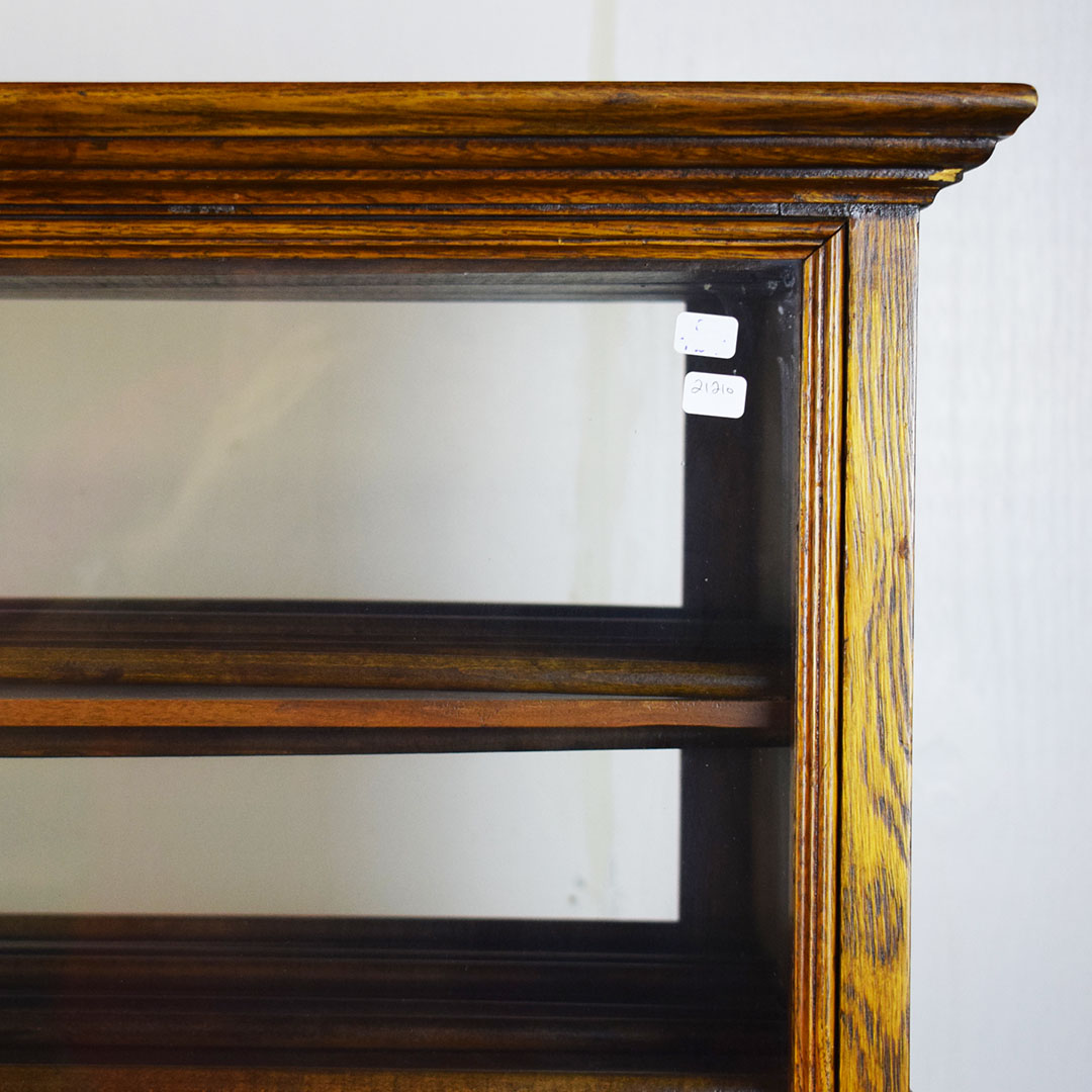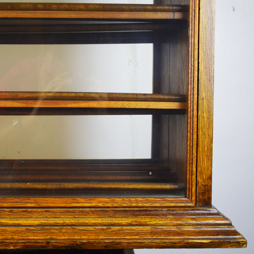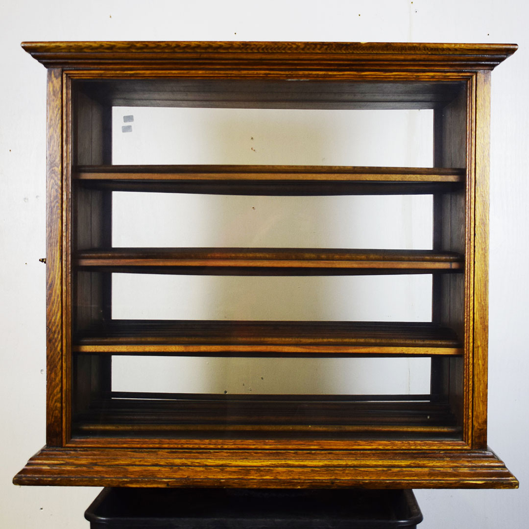 A. N. Russell & Sons designed ribbon cabinets that allowed general stores to display ribbons for sale. This oak cabinet measures 18 inches wide, 25.75 inches tall, and 29 inches long. The beautiful oak wood is impressive, with intricate detail throughout. The front and back feature plate glass, which allows customers to see which ribbons are in stock and ready to purchase. The three sliding middle sections set this piece apart from other ribbon cabinets. Horizontal handles are attached to the wooden drawers, allowing the customer to open the sections from either side easily. Each section has four shelves measuring 3 inches wide. The engraved plate on the front reads “A. N. Russell & Sons,” and “Ilion, N. Y.”. Some light scratches are on the wood finish, and a small dent in the top. 21210-TWT
