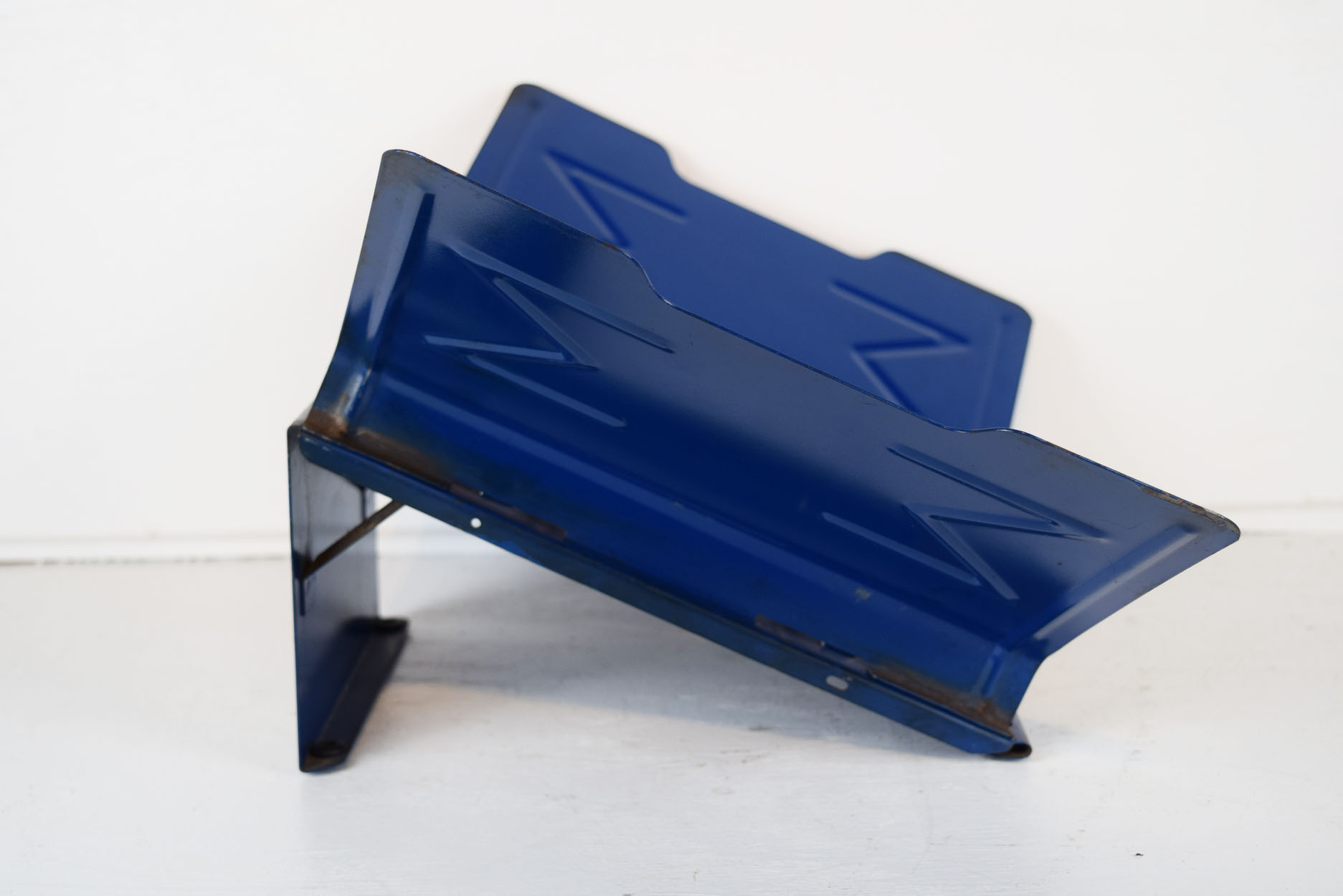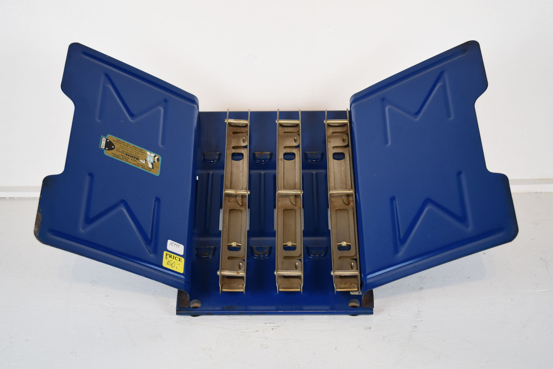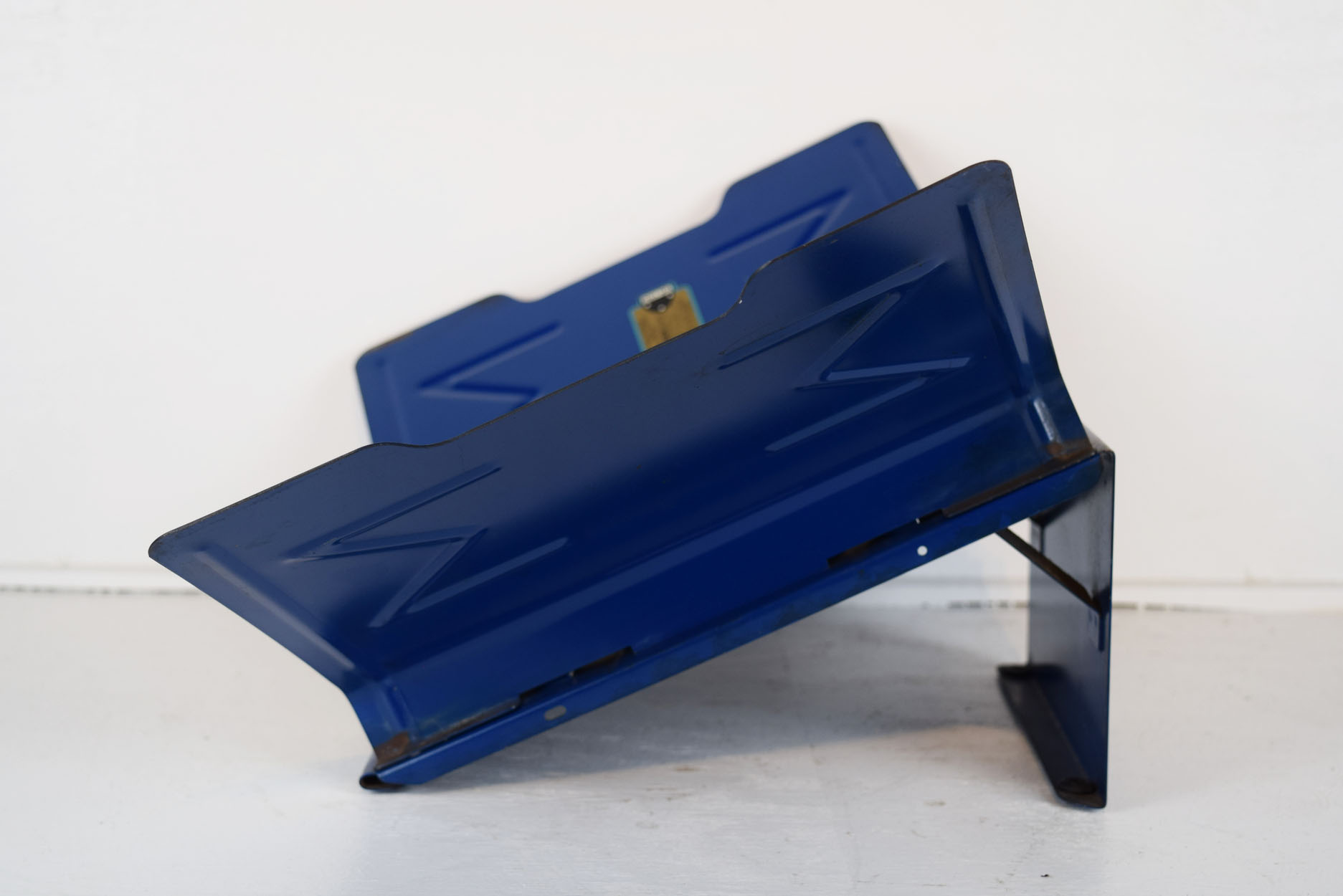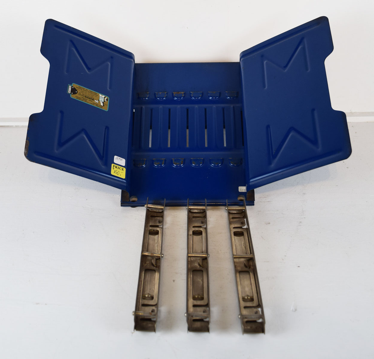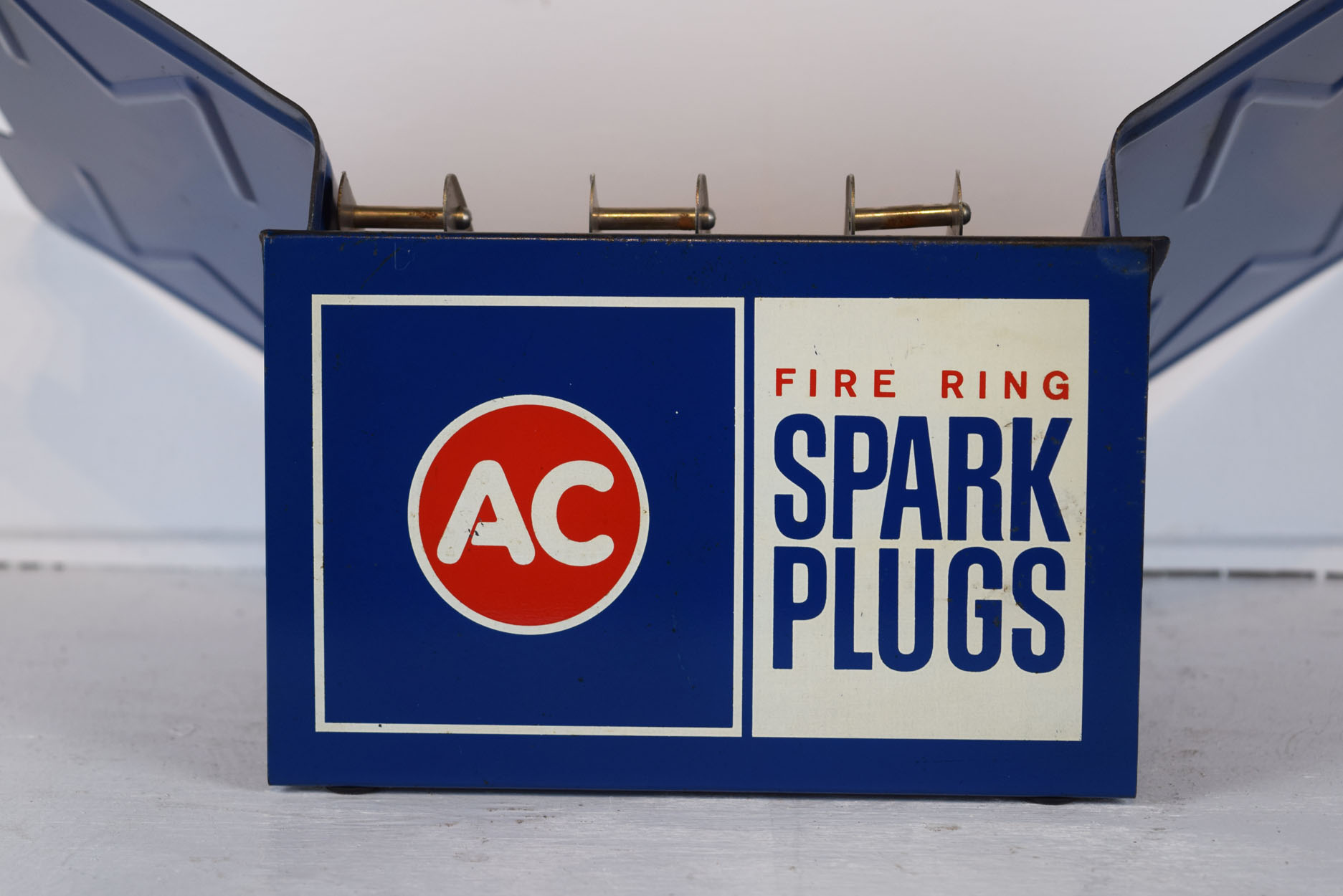 Walk into any parts store in the 1950’s and you would see metal racks on the counter lined up full of parts catalogs for anything you needed. Most were huge and held multiple books, as many as eight or twelve, but this smaller one was reserved just for AC Delco spark plus, so it is set up to hold three catalogs, but could hold six in a pinch. The side that the public sees has the AC Delco logo with “Fire Ring Spark Plugs” on the right, and the entire rack is painted blue. The side that the parts counterperson sees does not have any advertising, but three removable metal binders that held the catalogs. The blue wings on the sides let the catalogs lay open while you searched for part numbers for your customer. Some chipping on the left side wing, along with some chipping on the center of the rack. If you have a parts counter set up in your man cave, you really need this to complete it! 18795-9075