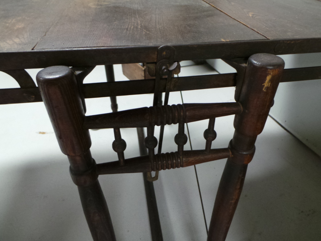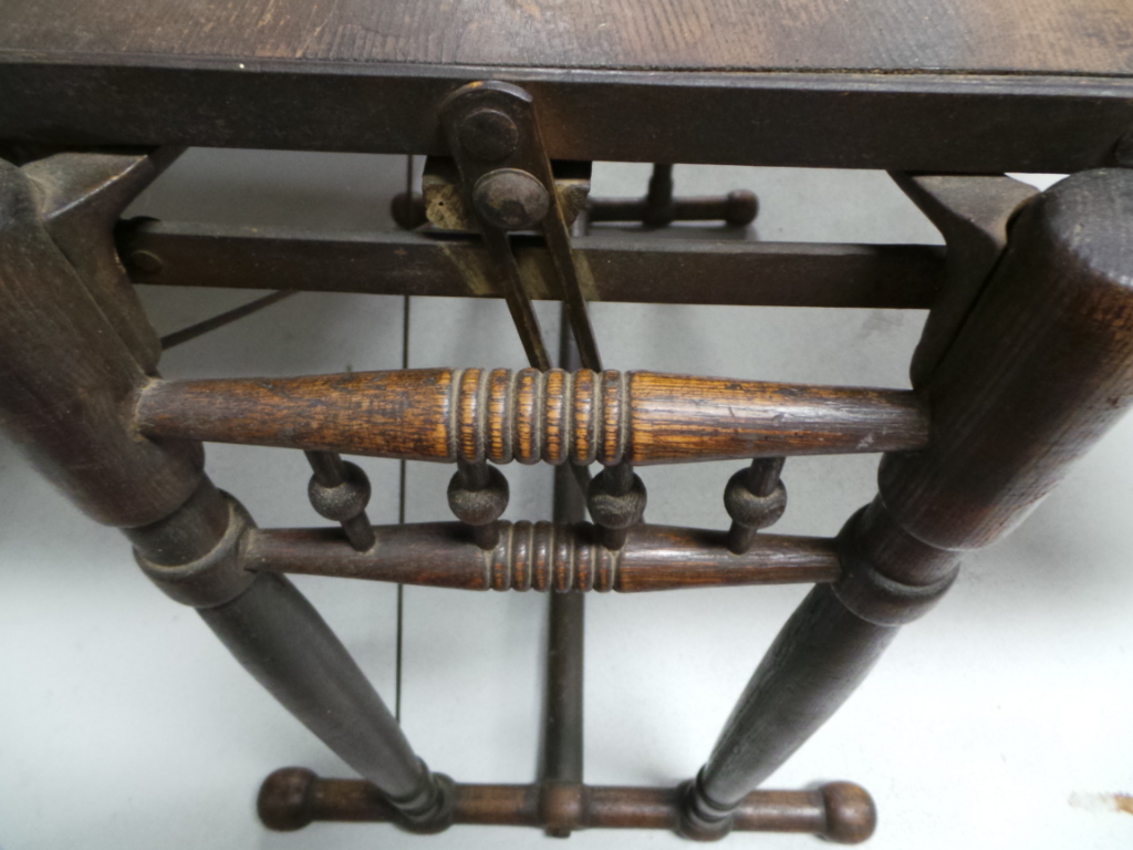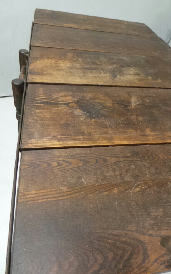 Circa 1900’s adjustable baker’s rack with five oak shelves, as steel frame, and turned oak legs. It is completely adjustable, going from five vertical shelves to a flat table top and any angle in between, pivoting on the third shelf. The adjustment is controlled by a single T-nut. It is in excellent condition with a nice patina and measures 55 inches tall by 32 1/2 inches wide by 12 inches deep. Pick up or possibility delivery as we travel to various shows. Wonderful addition to a room. 1260-81TWT