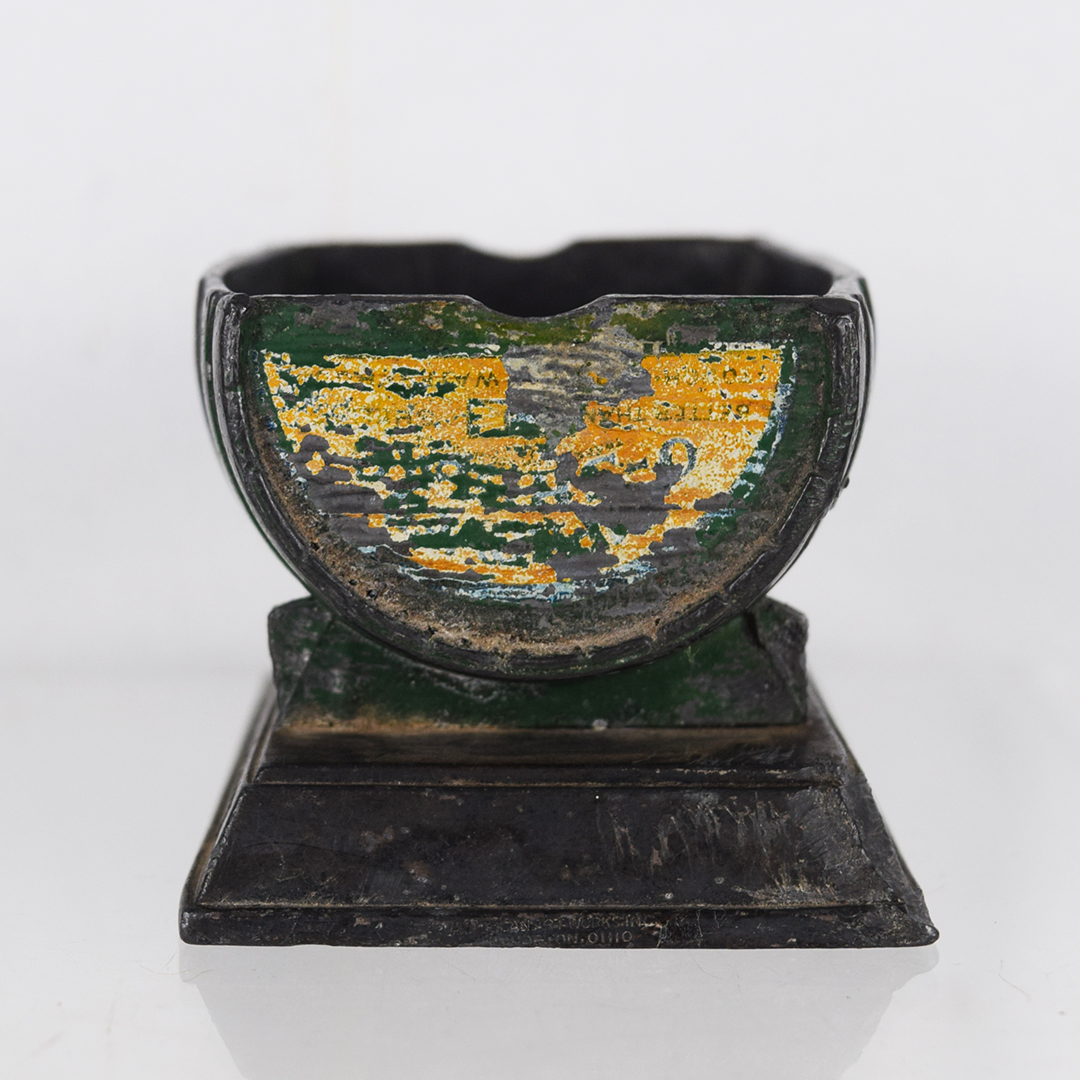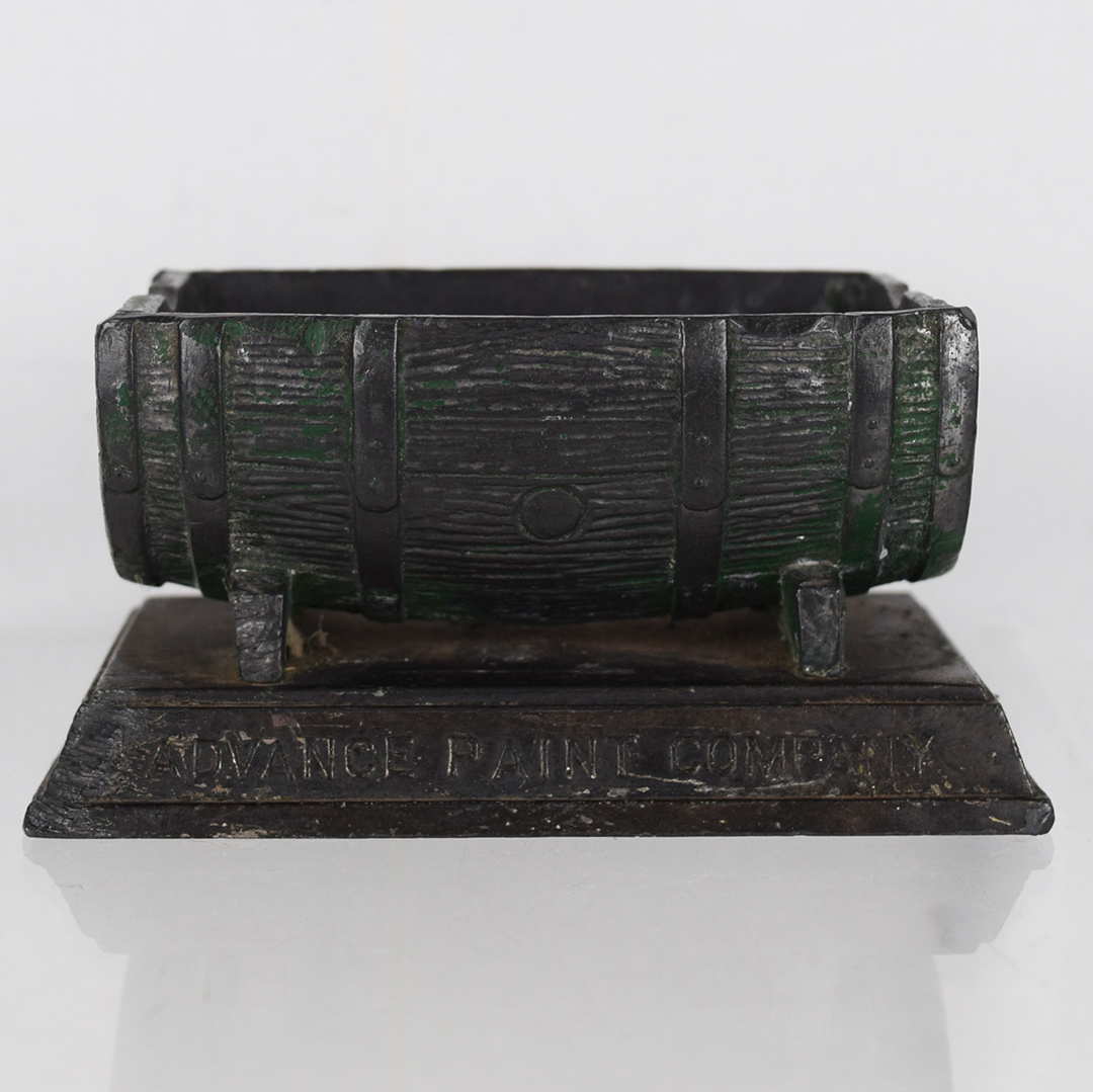 Paint advertising is a niche many collectors love. This Advance Paint Company metal ashtray was a desk accessory used by a company officer. It is made of “Pot” metal, which is heavy enough to use as a paperweight as well if the person did not smoke cigarettes. Each end has a small cutout for resting a cigarette, along with remnants of green and yellow paint. The company’s name, “Advance Paint Company,” is embossed along the bottom of each side. It measures 2 1/8 inches tall, 4 1/8 inches long, and 2 1/2 inches wide. It is reasonably heavy, weighing 1 pound, 6 ounces. It is in excellent condition and ready for your collection. 1037-QY