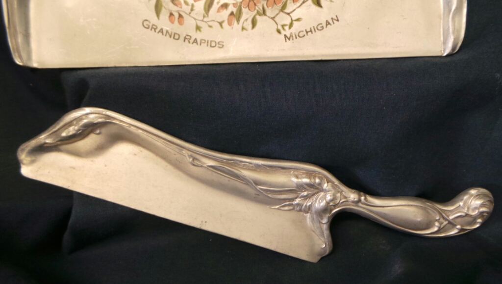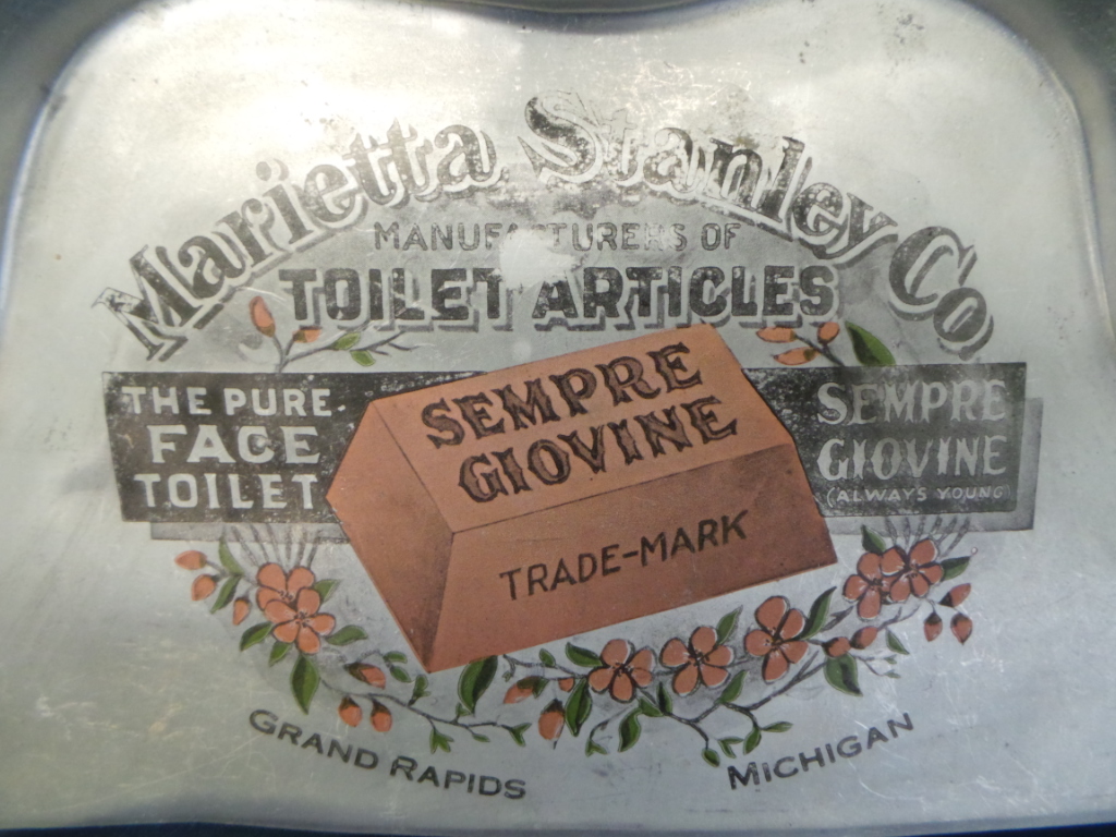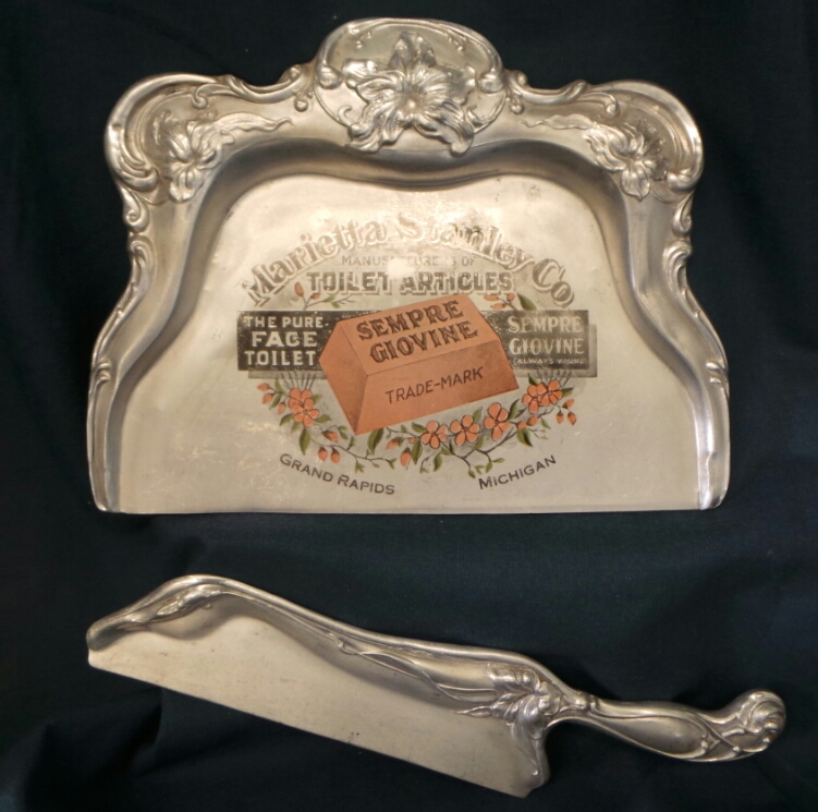 These rare advertising household item dates from the late 19th century. It is a crumber set for cleaning off the table after dinner and it is made out of stamped aluminum, which was a fairly exotic metal at that time. It has an art nouveau style embossed floral pattern on the handle of the scraper and on the back edge of the dust pan. There is a silk screened advertisement on the dust pan for “Sempre Giovine” (always young) soap, manufactured by Marietta Stanley Co. in Grand Rapids, MI. The ad shows an image of the company’s trade mark bar of soap above a garland of flower blossoms. The crumber set is in good condition with some wear on the advertisement and minor dings and scratches due to the softness of the metal. The dust pan is 9 1/4″ wide by 6 3/4″ tall and the scraper is 10 1/4″ long. 8721-80QPT