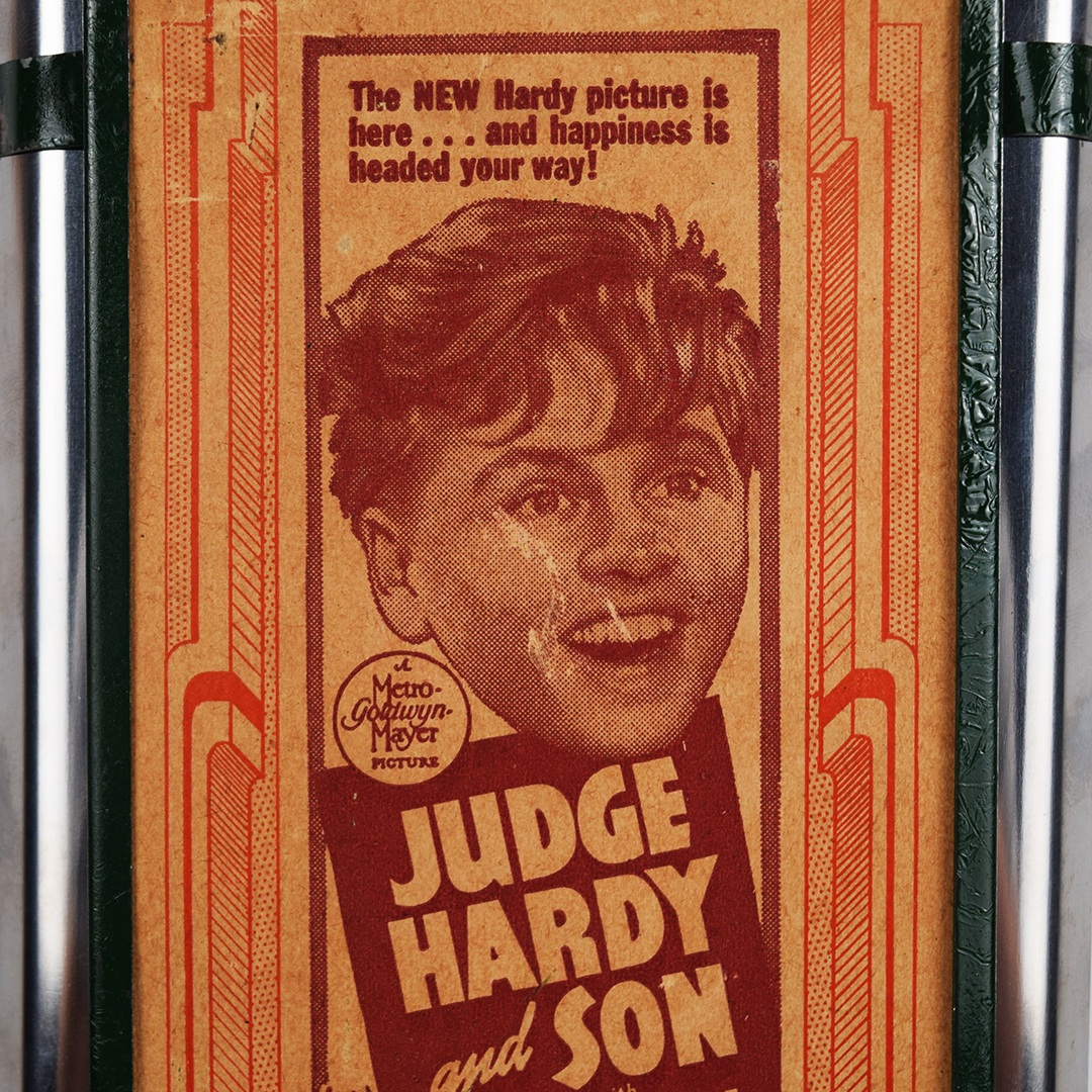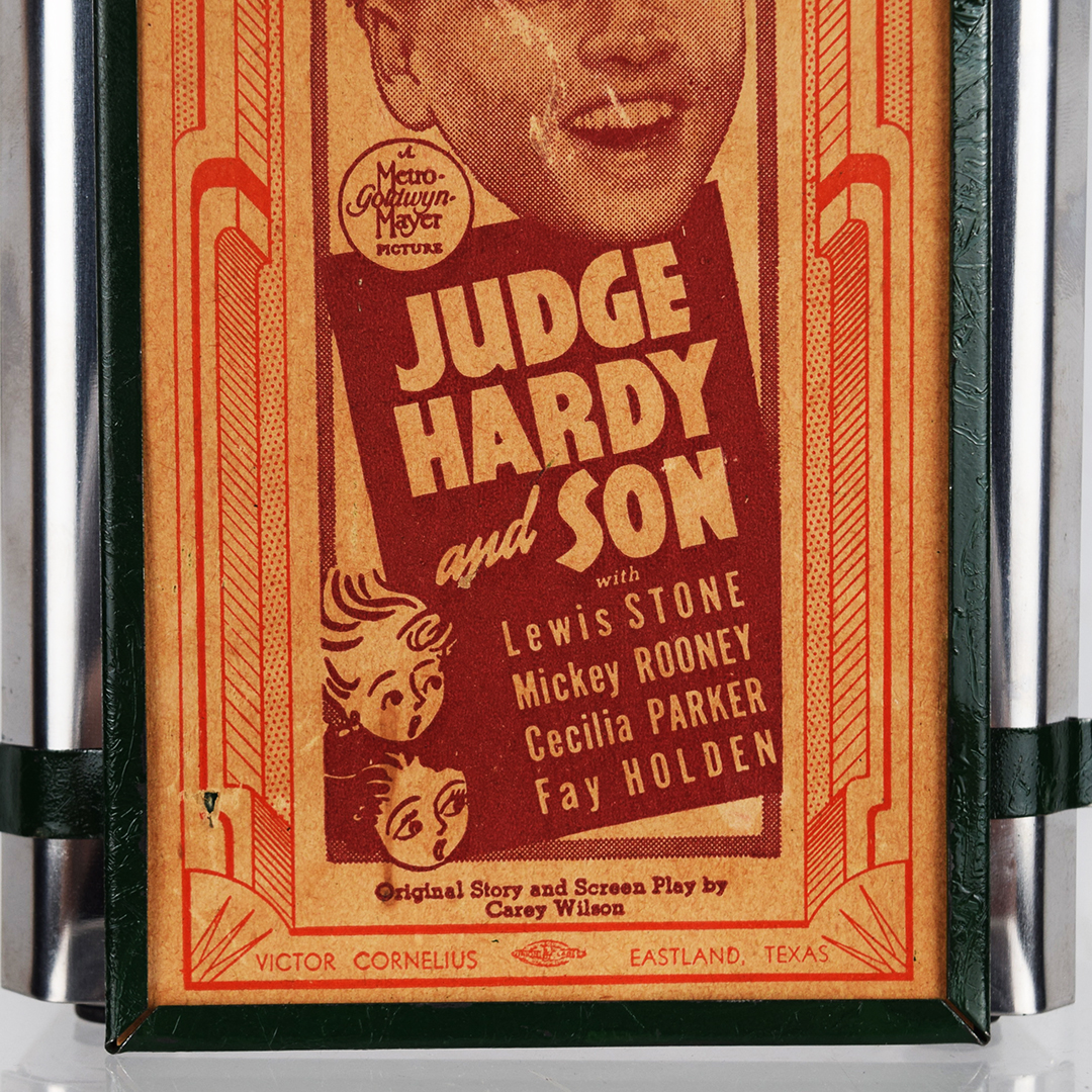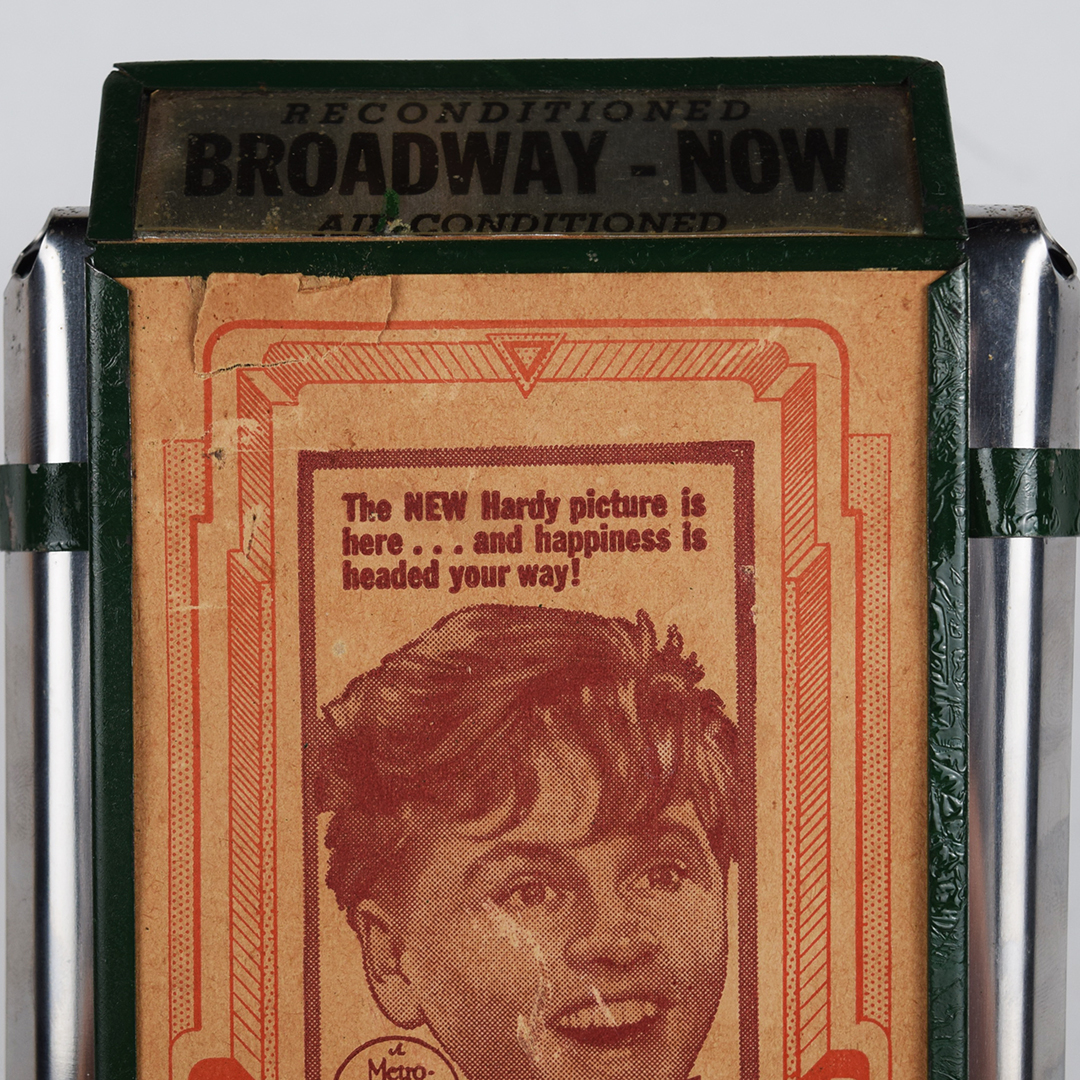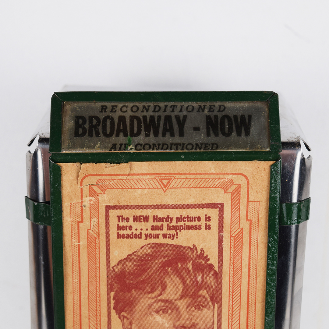 This tabletop napkin holder, a staple in any soda fountain or diner, measures 8 inches tall by 4.75 inches square. What sets this napkin holder apart is the advertisement on the side for the Broadway – Now movie theater. The metal attachment allowed the theater to display small paper ads for current movies. The featured ad shows that “Judge Hardy and Son” from MGM was playing, starring Lewis Stone, Mickey Rooney, Cecilia Parker, and Fay Holden. The paper ad has a small tear in the upper left corner, wear in the middle, and a small hole in the lower left corner. The angled top above the ad reads “Reconditioned Broadway – Now Air Conditioned”, and it clips on the side of the napkin holder. Super great idea for an in-town diner or soda fountain to utilize advertising space! 21441-QTP