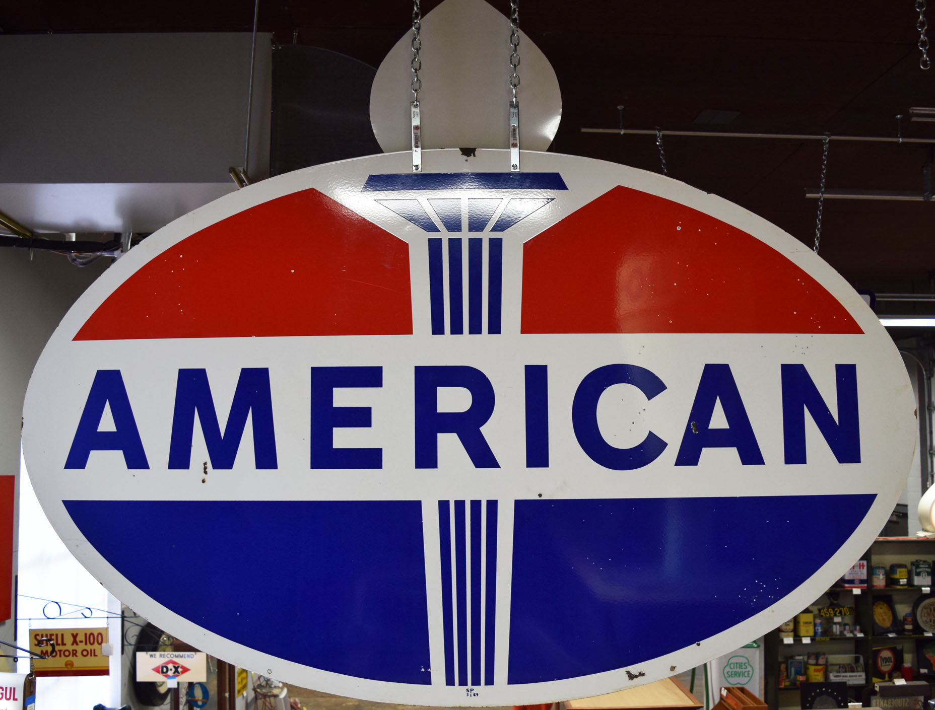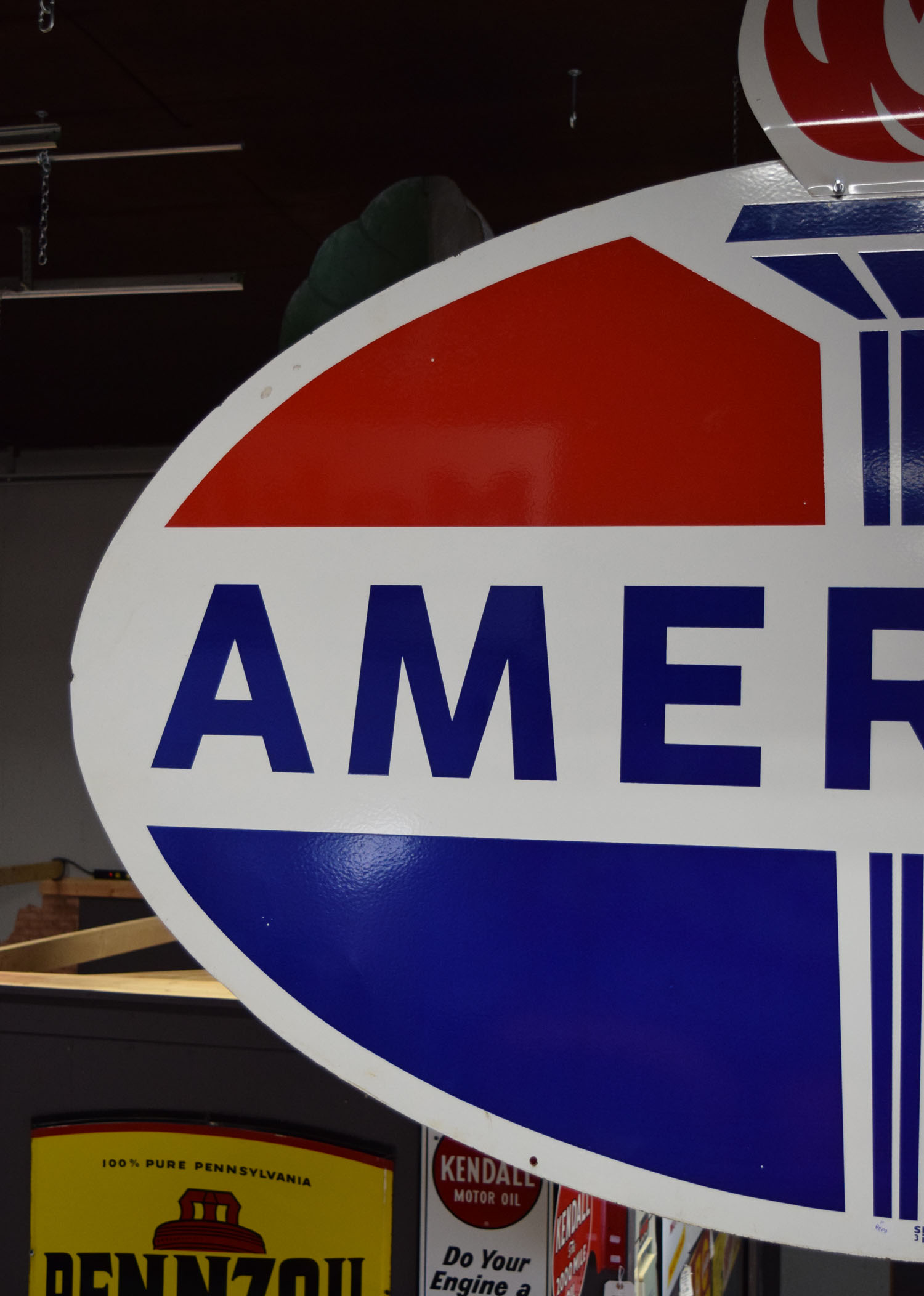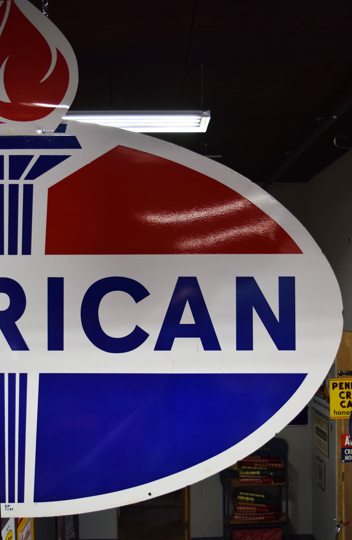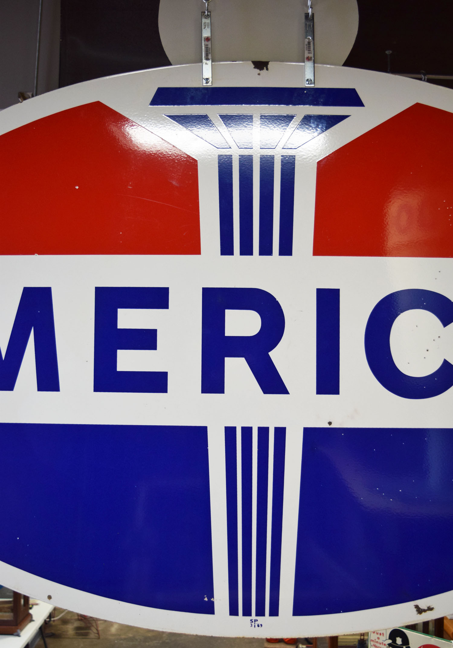 If the design looks familiar to you, it probably is! Originally Standard Oil Trust, this American Gas sign is now recognizable as Amoco. It is double sided metal sign with a die cut flame attached to the top of one side. The oval measures seventy-four inches wide, and forty-four inches tall. The metal sign is all original with very nice gloss and sharp colors. A few minor chips can be seen around the outer edge with a few chips on the backside of the sign. The die cut flame that is atop has been remade to give the sign some extra pop. It is painted and looks fantastic. This sign is marked “SP 3 69” in the lower portion. Super nice piece that will look great inside or outside your man cave. This item is larger than UPS will allow. Please contact us for shipping or delivery quote. 19571-RTPP