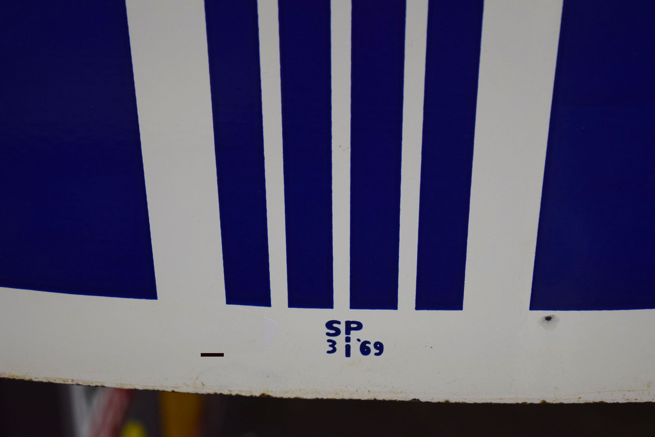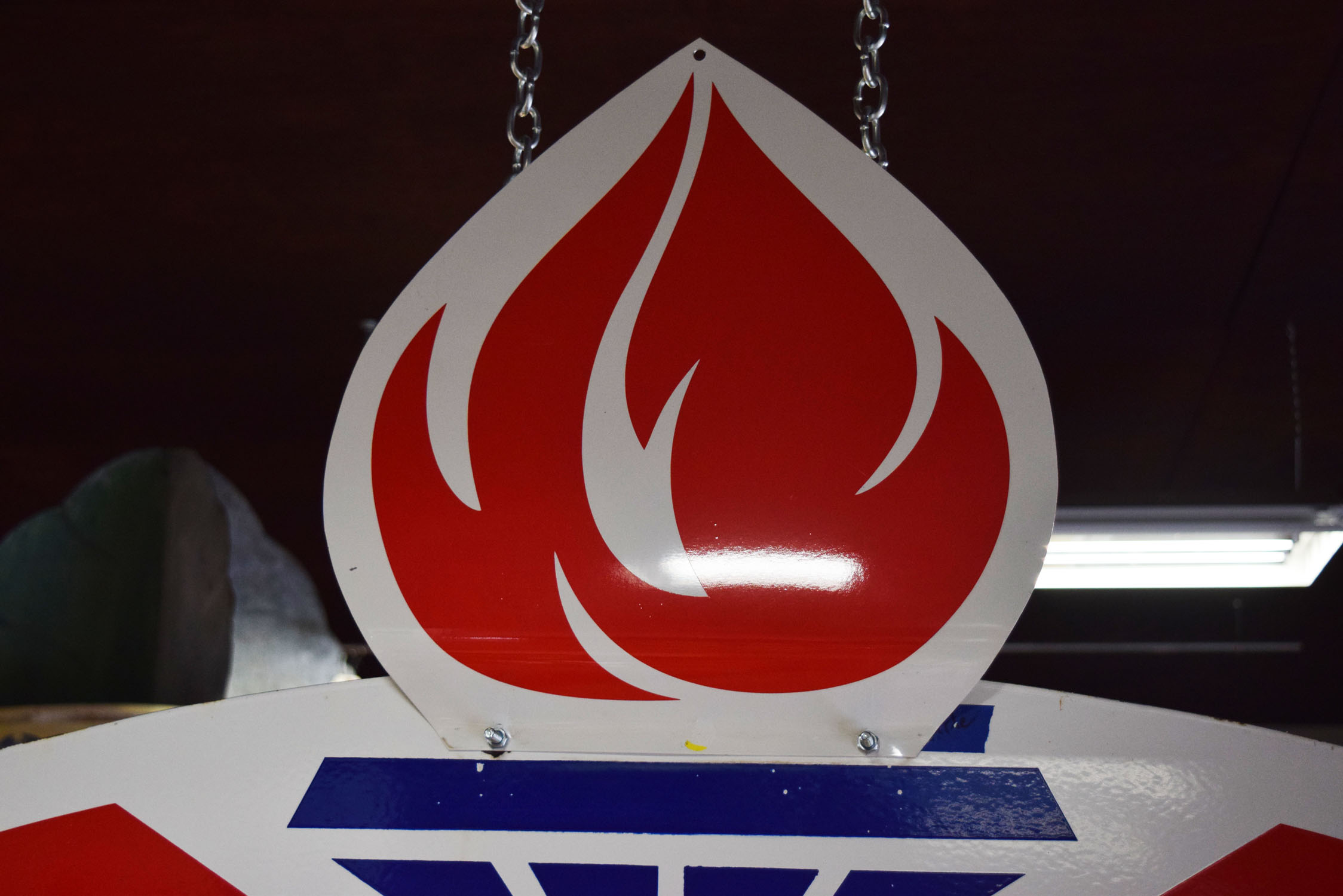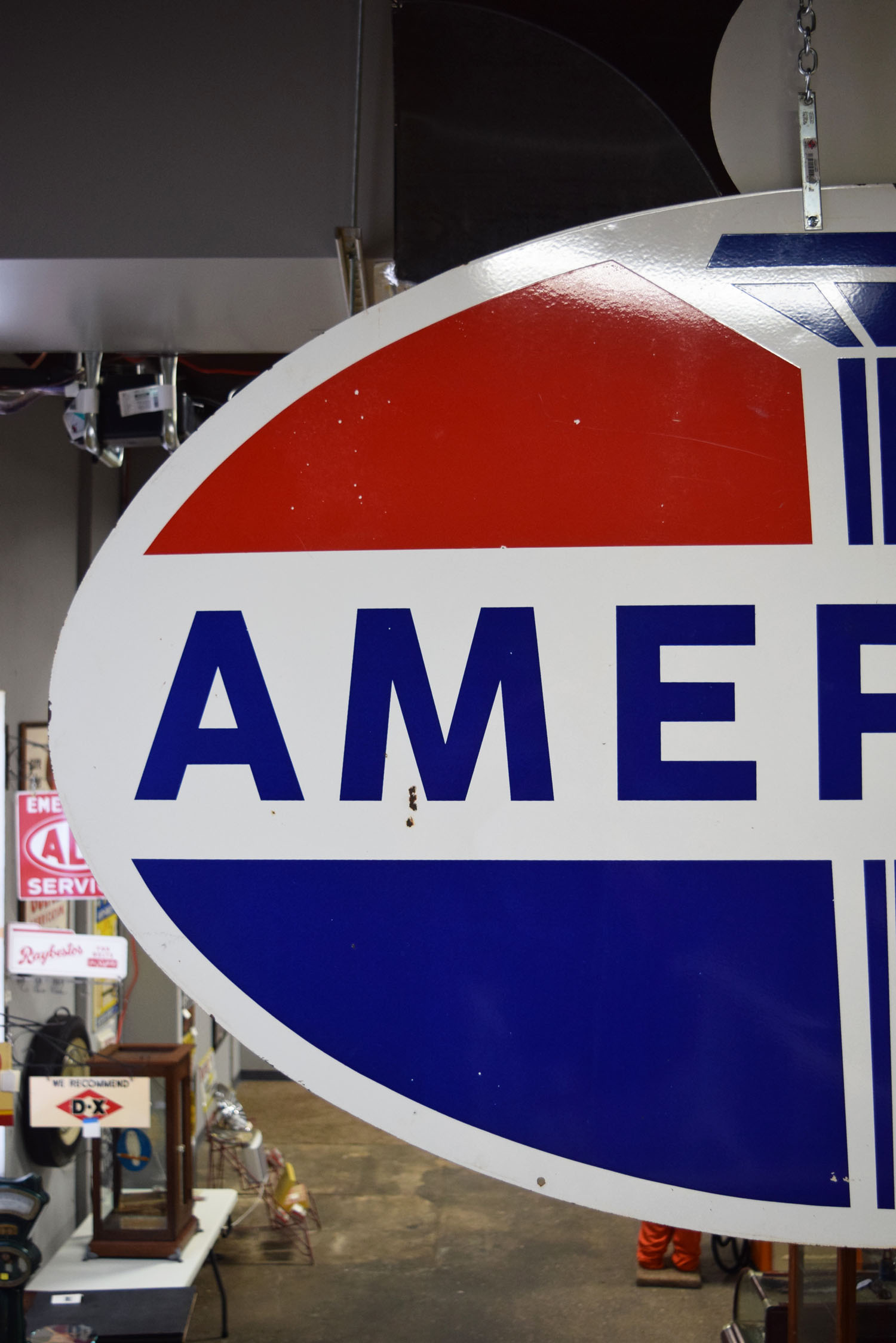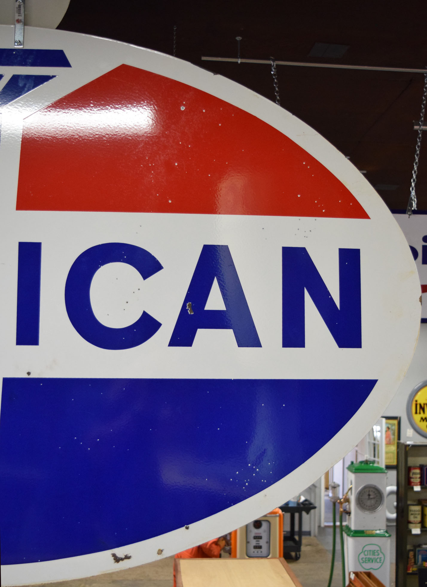 If the design looks familiar to you, it probably is! Originally Standard Oil Trust, this American Gas sign is now recognizable as Amoco. It is double sided metal sign with a die cut flame attached to the top of one side. The oval measures seventy-four inches wide, and forty-four inches tall. The metal sign is all original with very nice gloss and sharp colors. A few minor chips can be seen around the outer edge with a few chips on the backside of the sign. The die cut flame that is atop has been remade to give the sign some extra pop. It is painted and looks fantastic. This sign is marked “SP 3 69” in the lower portion. Super nice piece that will look great inside or outside your man cave. This item is larger than UPS will allow. Please contact us for shipping or delivery quote. 19571-RTPP