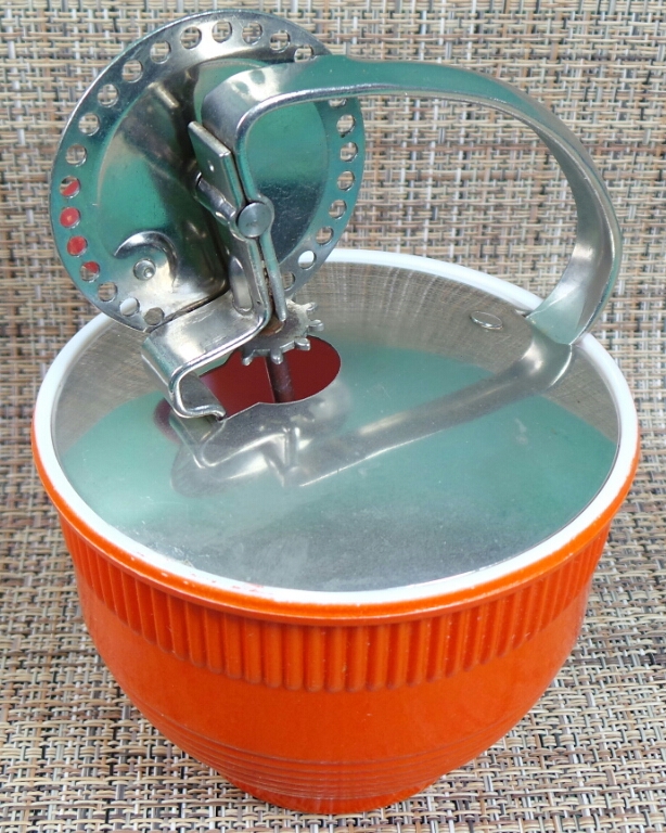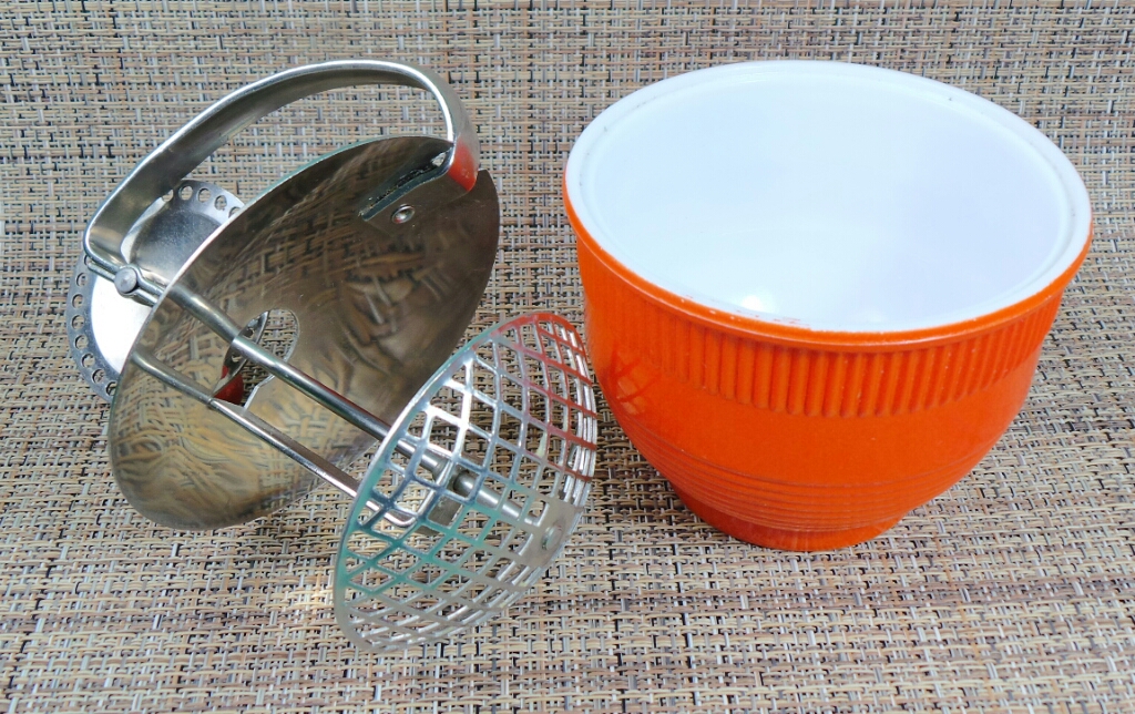 This clean little mixing bowl has a stainless steel lid with a built in beater and was manufactured by Androck in the 1940s. It is made of white milk glass with a bright orange enamel finish and holds about a pint. With the lid it measures about five and a half inches tall by four inches in diameter and is in near mint condition. It doesn’t look like it has ever been used. Great piece to have to display in your kitchen and use on a daily basis 9754-51ET
