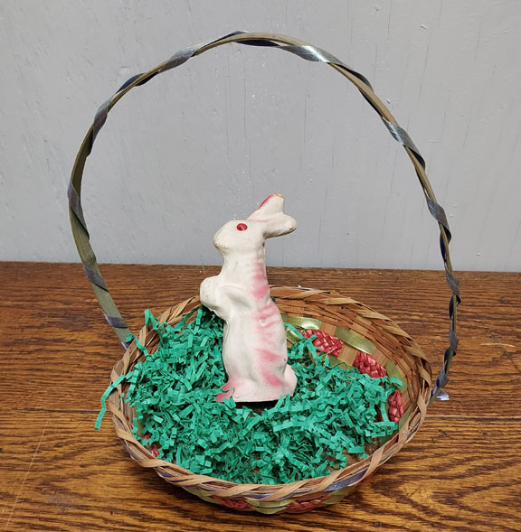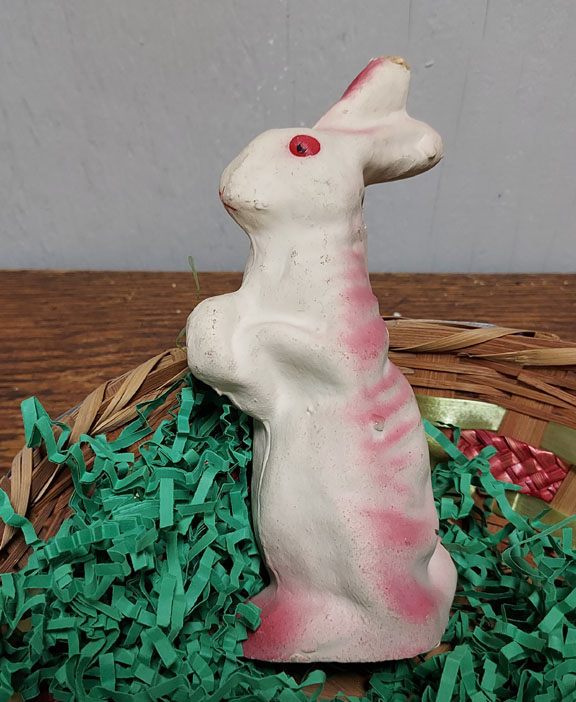 How cute is the little guy, just waiting for Easter morning in his 1950’s Easter Basket. He has colors of pink and cream with red eyes. There is some paper missing from one of the ears. Standing seven inches tall, this bunny is in excellent condition for its age. Both pieces are included. 2015-QT
