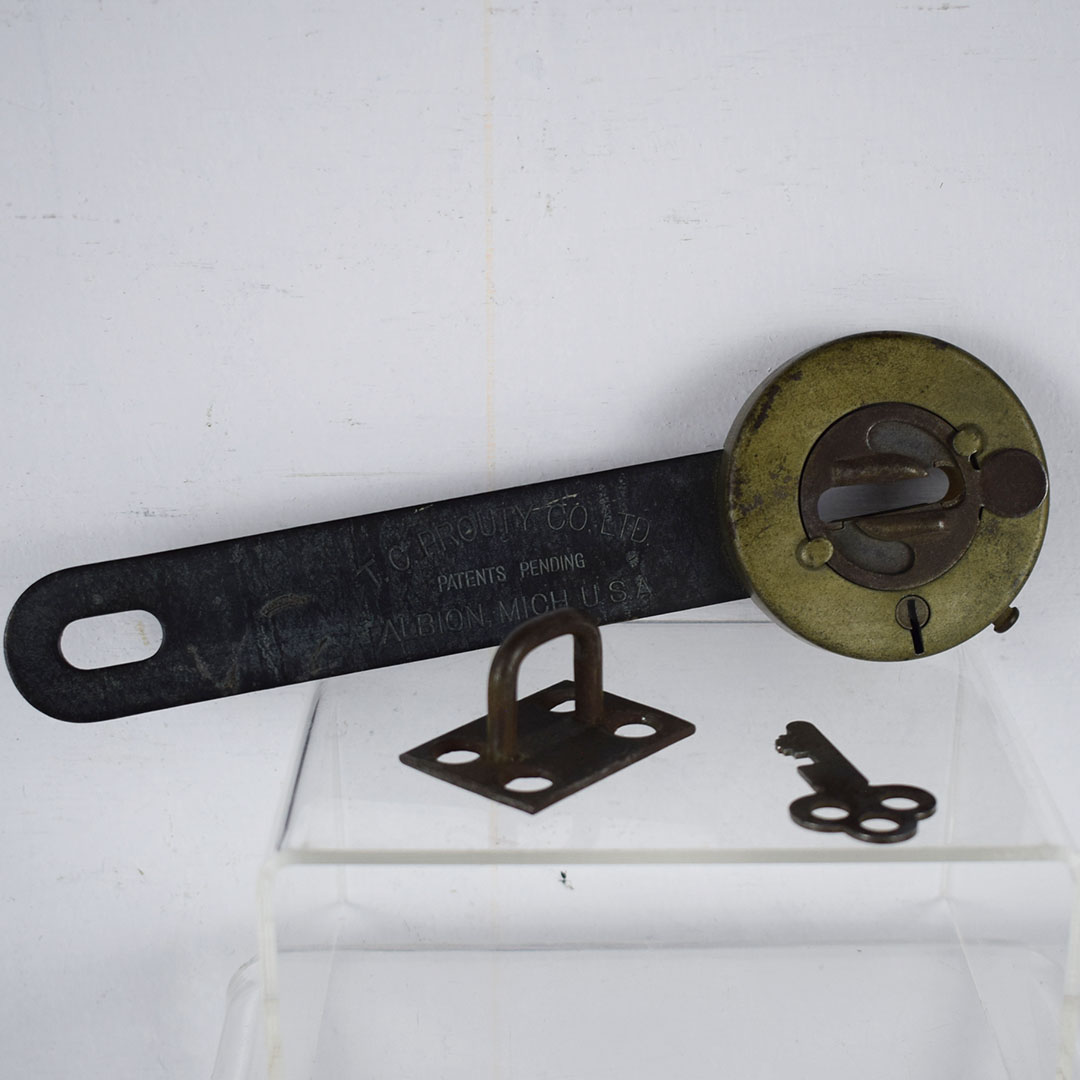 Stamped “T. C. Prouty Co. Ltd.” on the shaft, this early barn door lock works just as it should and features the original key. The metal lock has a beautiful patina and is ready to use or display. 21241-