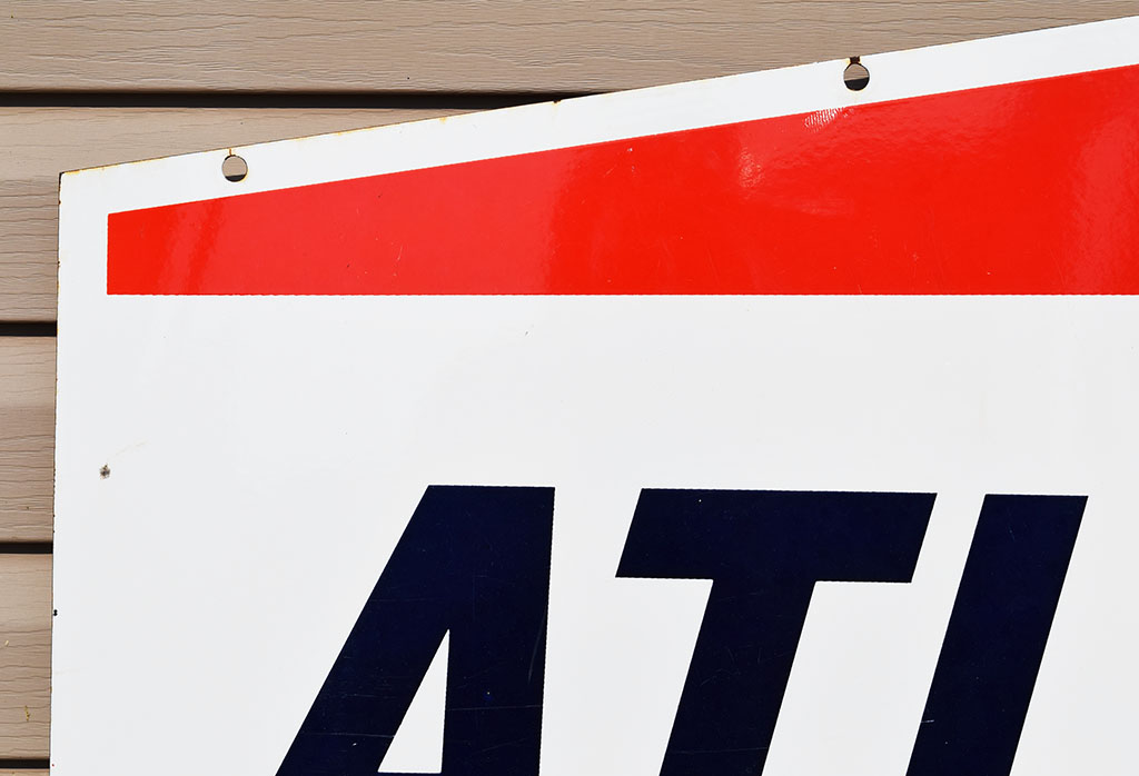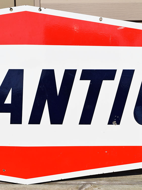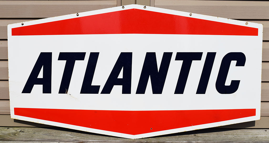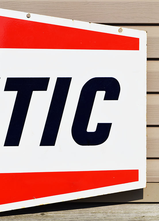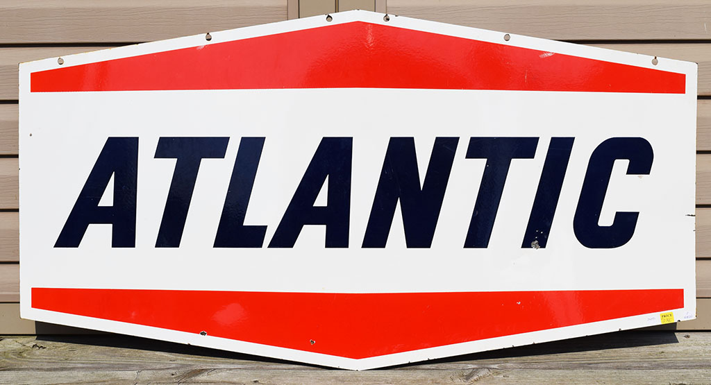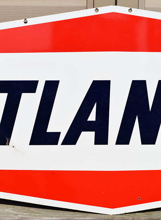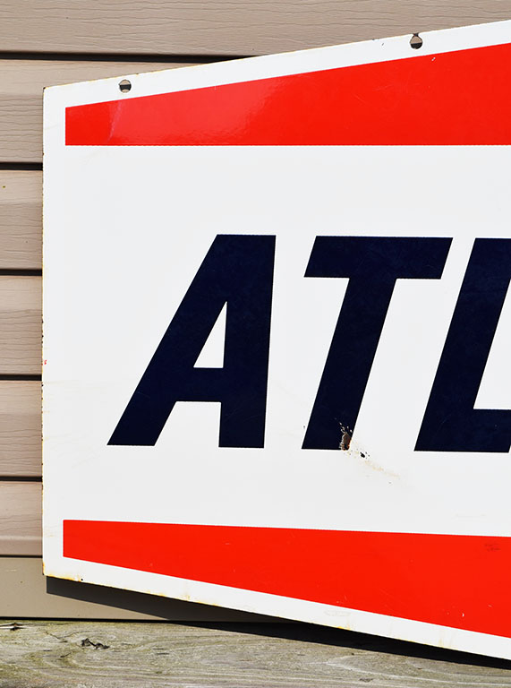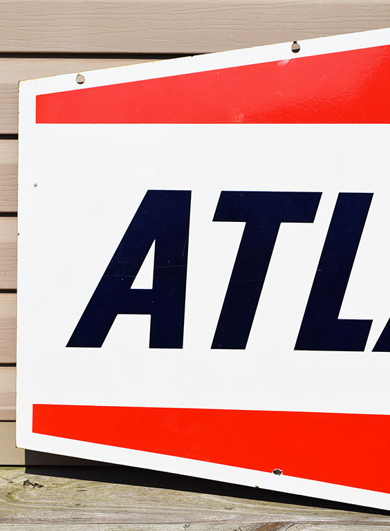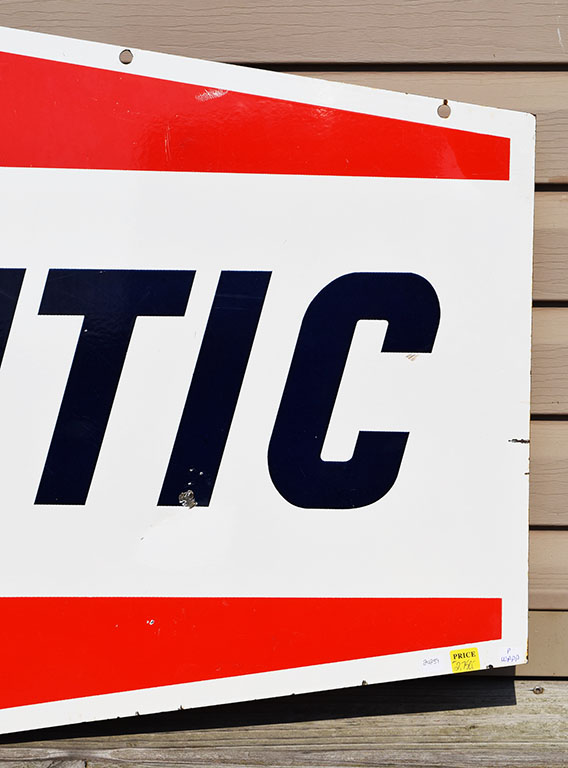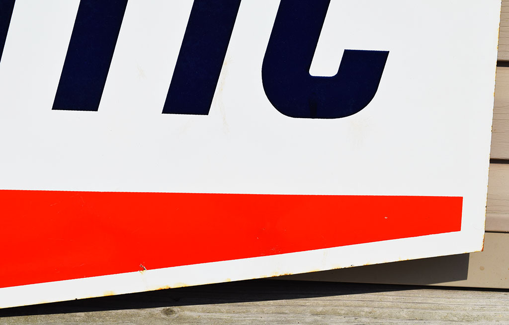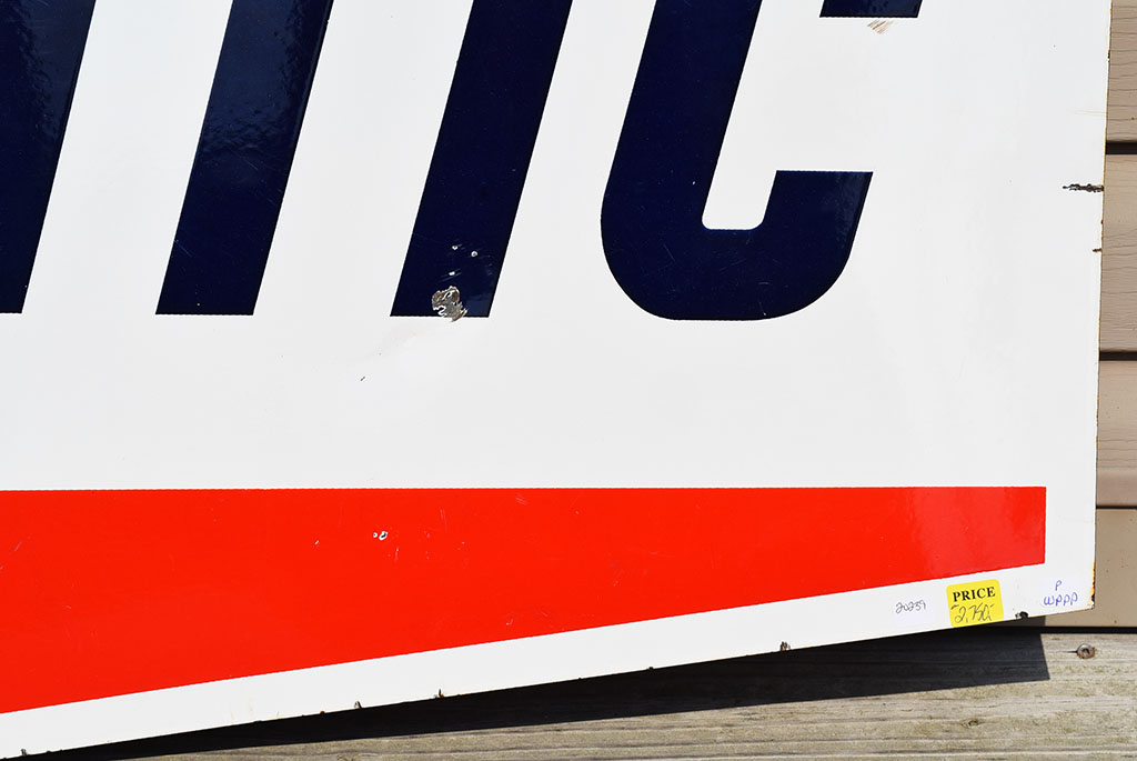 Dating from the 1950’s, this large die cut sign is double sided and features great colors! It measures forty-eight inches across, and twenty-five and a half inches top to bottom. It has some minor chips on the bottom edge, with some small dings in the bottom half of the sign. One dent has chipped the paint at the bottom of the ‘i’ on one side, and the bottom of the ‘t’ on the other. Some small chips can also be seen in the bottom red trim. One of the better signs we have seen that will look great in your collection. 20239-WPPP