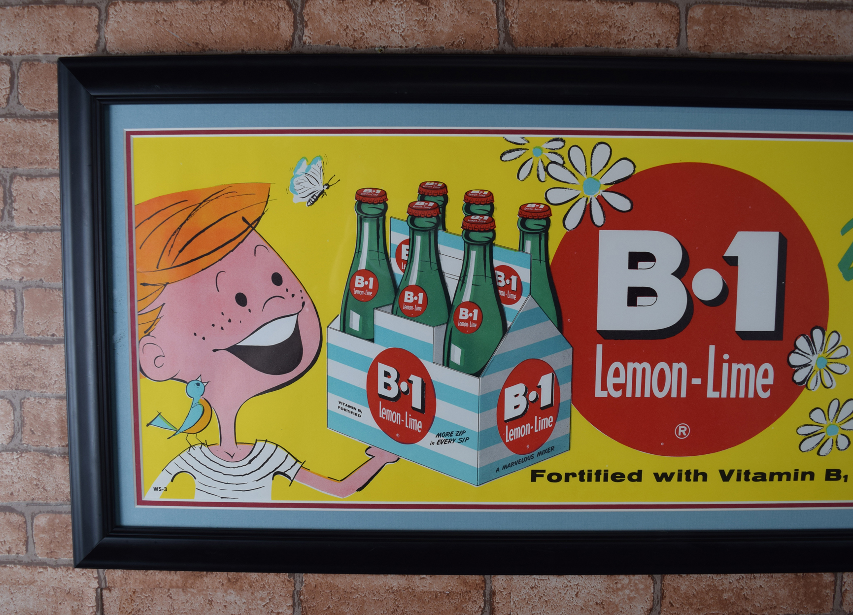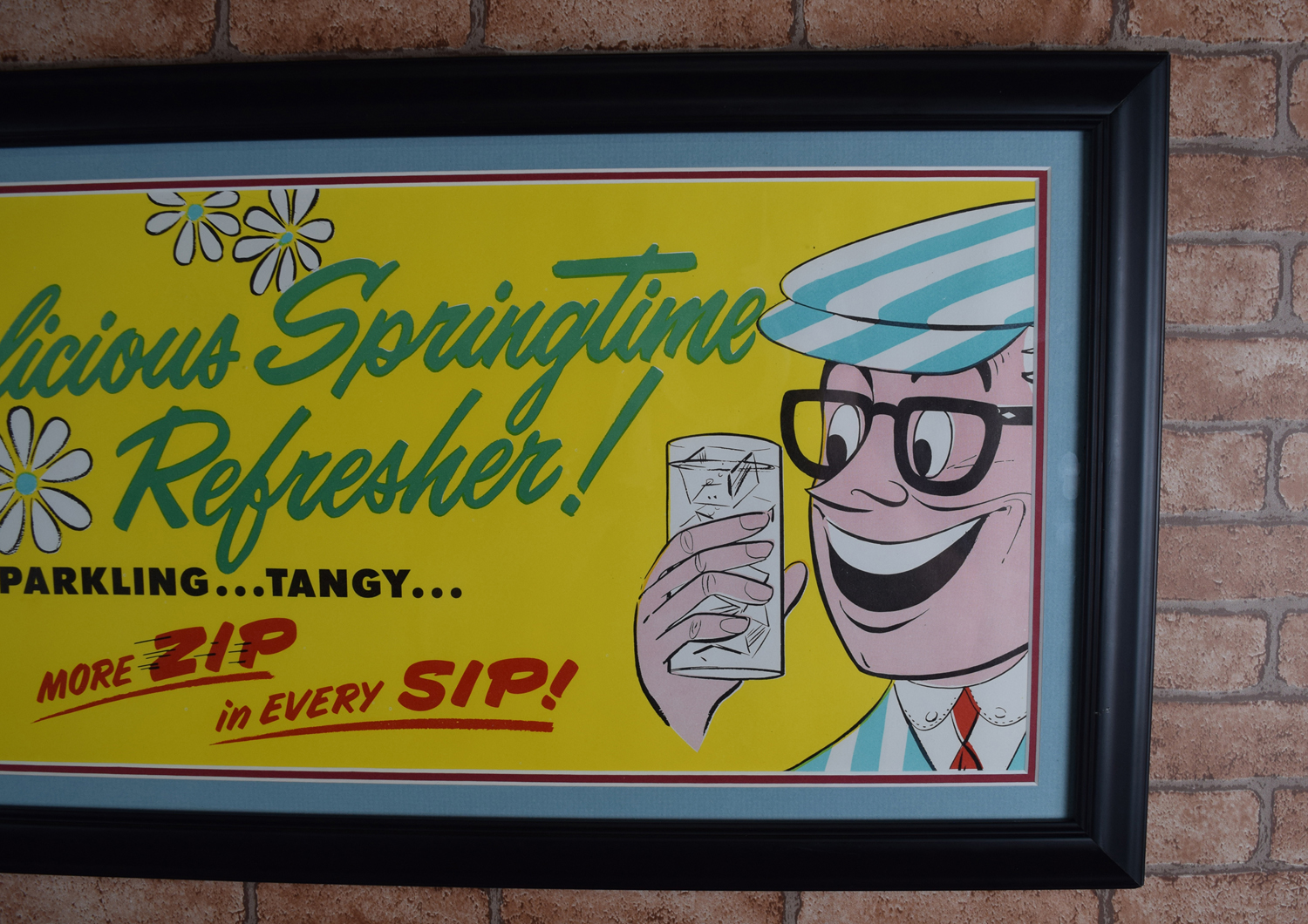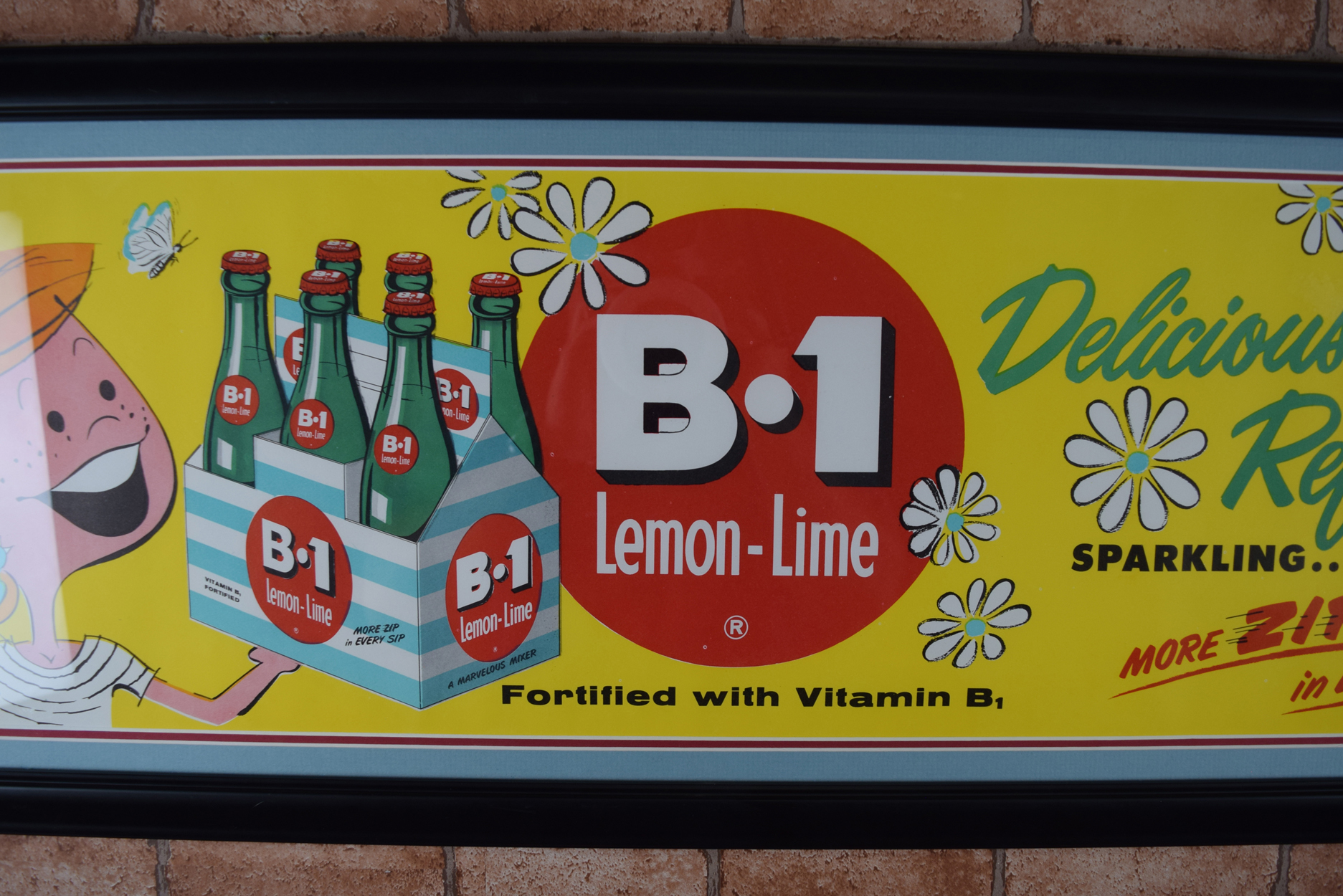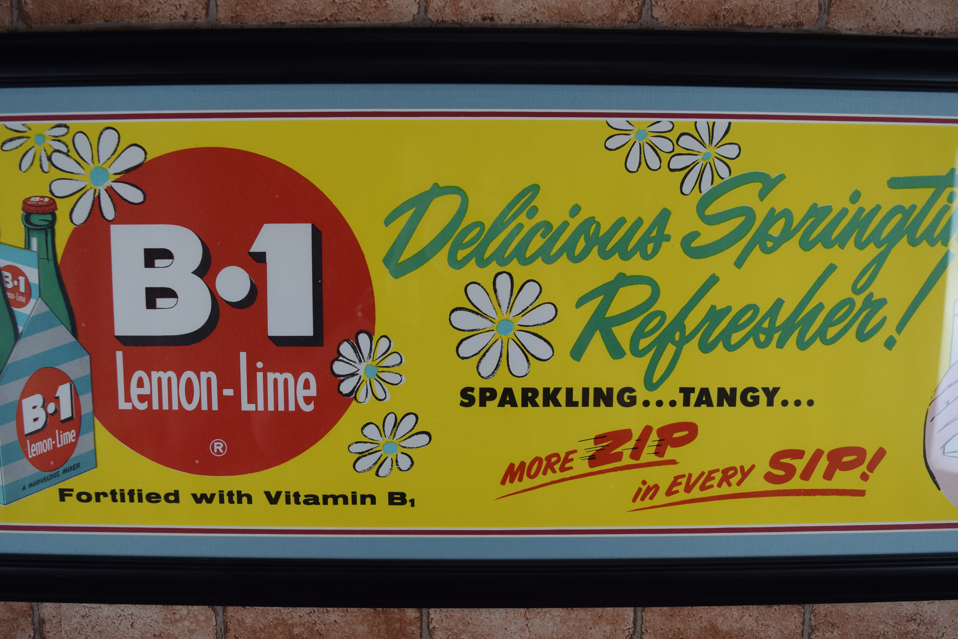 Vivid colors and amazing graphics make this B-1 Lemon Lime Soda paper sign eye-catching! Focusing on Spring, it touts “Delicious Springtime Refresher!” along with “”Sparkling…Tangy…” and “More Zip in Every Sip!”, with a cartoon father on the right and his daughter on the left. We date this from the 1950’s to 1960’s with the colorful artwork and the graphics on this piece. The ad itself is made of paper, and it has been professionally framed with a double mat to protect it for years to come. The company produced this horizontal paper ad, along with a vertical paper ad. The mat black frame measures fourteen inches tall by forty-two inches long. Very cool rare advertising piece that is over sixty years old! 19011-RRP