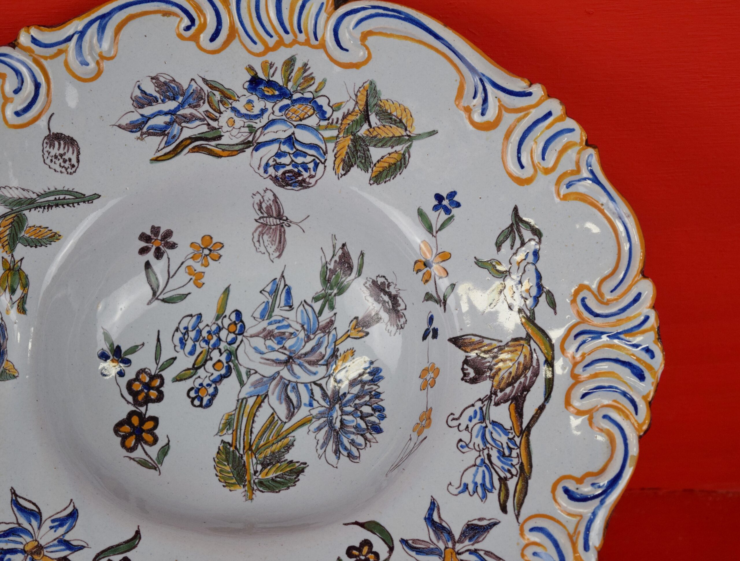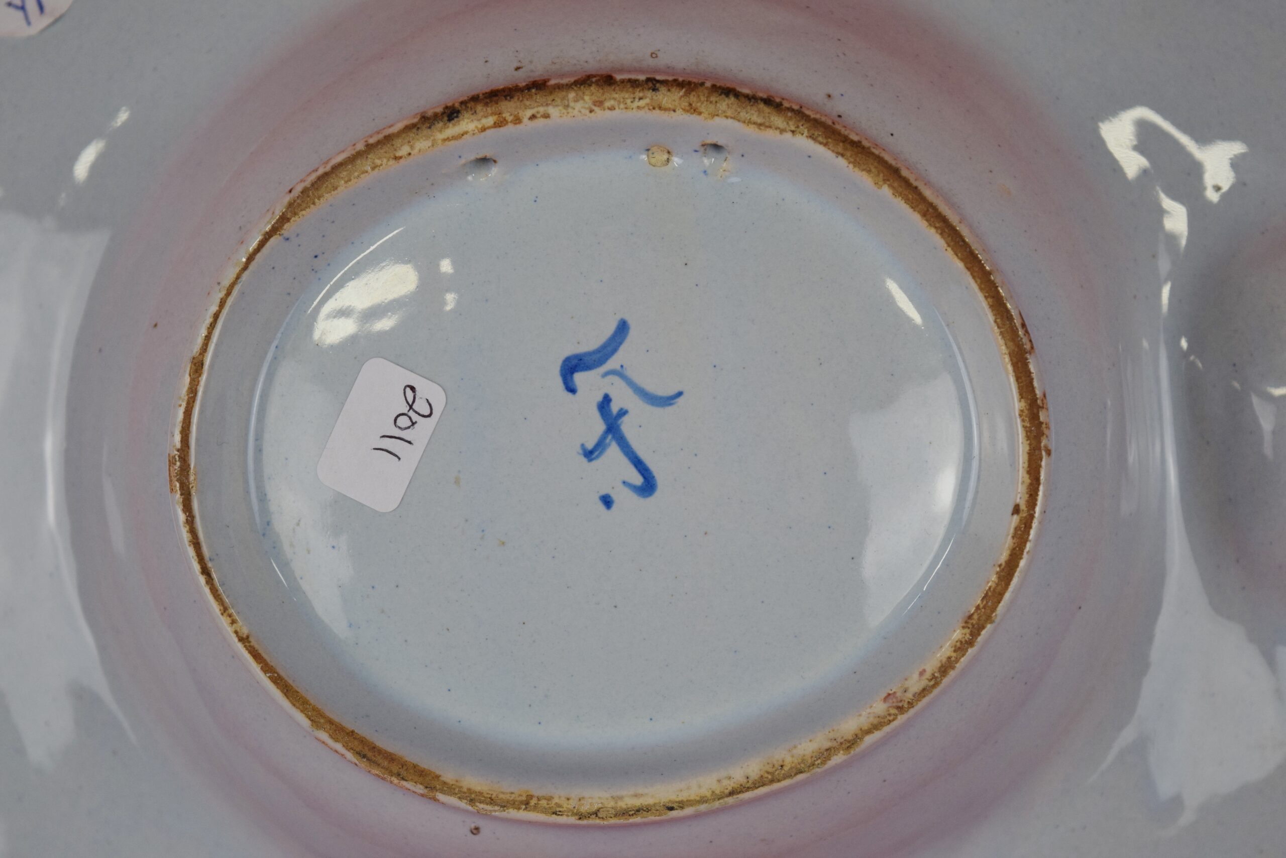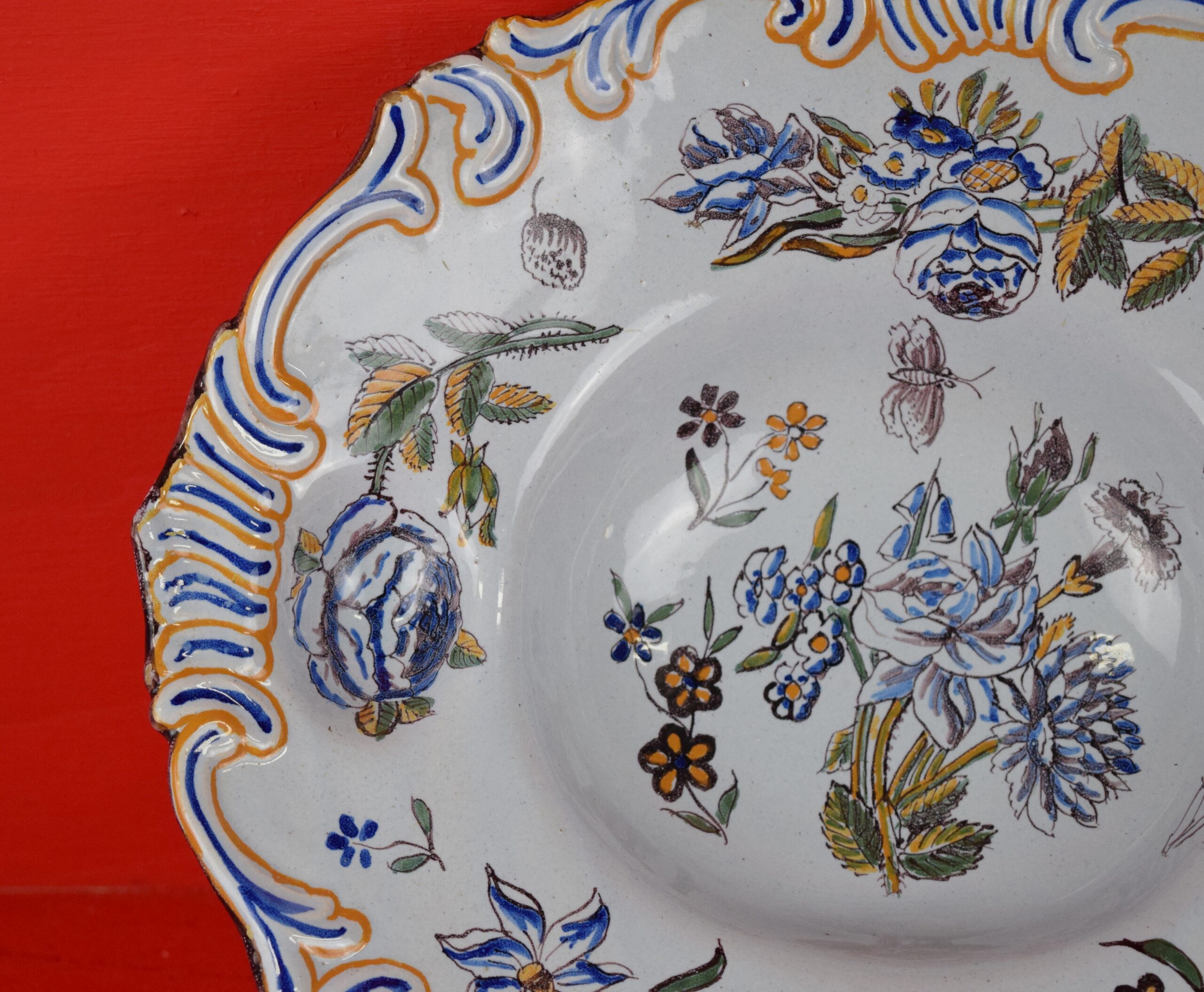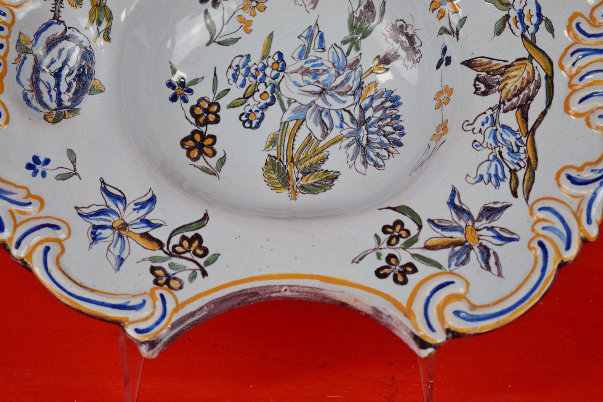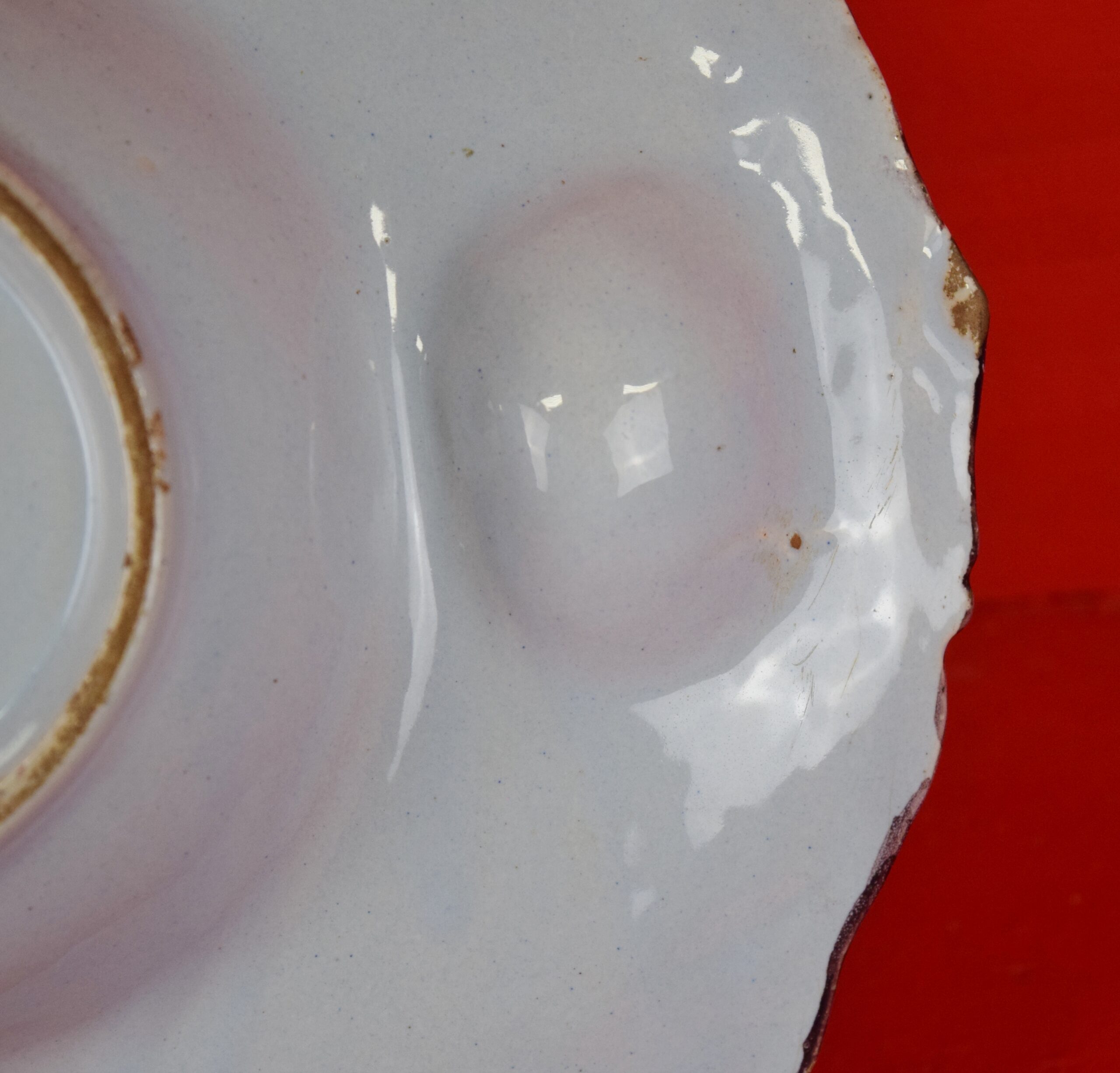 If you look at the history of barbers, you will find that they were similar to doctors in the early years. Known as barber-surgeons, they performed a multitude of tasks, including bloodletting, pulling teeth, setting bones, and treating wounds. This bowl was used for a few purposes, namely bloodletting and pulling teeth. The notch is made to contact the neck, so the bowl would easily hold any blood or fluids that occurred during surgery. On the left side of the bowl is a divot where the barber would lay his thumb so he could easily grip the bowl when his hands were wet. The outer lip is raised and has a scalloped edge. Inside has flowers of various sizes. Some roughness and wear can be seen on the outer lip. Underneath some mold marks are in the finish, along with two holes drilled for display purposes. 2011-YP